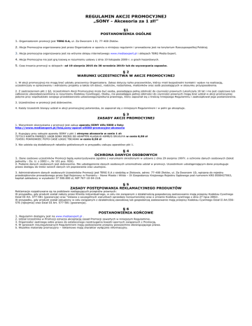 REGULAMIN AKCJI PROMOCYJNEJ „SONY - Akcesoria za 1 zł!” §1 POSTANOWIENIA OGÓLNE 1. Organizatorem promocji jest TERG S.A, ul. Za Dworcem 1 D; 77-400 Złotów. 2. Akcja Promocyjna organizowana jest przez Organizatora w oparciu o niniejszy regulamin i prowadzona jest na terytorium Rzeczypospolitej Polskiej. 3. Akcja promocyjna organizowana jest na witrynie sklepu internetowego www.mediaexpert.pl i sklepach TERG Media Expert. 4. Akcja Promocyjna nie jest grą losową w rozumieniu ustawy z dnia 19 listopada 2009 r. o grach hazardowych. 5. Czas trwania promocji w sklepach: od 19 sierpnia 2015 do 30 września 2015r lub do wyczerpania zapasów. §2 WARUNKI UCZESTNICTWA W AKCJI PROMOCYJNEJ 1. W akcji promocyjnej nie mogą brać udziału pracownicy Organizatora. Zakaz dotyczy tylko pracowników, którzy mieli bezpośredni kontakt i wpływ na realizację, uczestniczyły w opracowaniu i wdrożeniu projektu a także ich dzieci, rodziców, rodzeństwa, małżonków oraz osób pozostających w stosunku przysposobienia. 2. Z zastrzeżeniem pkt.1 §2, Uczestnikiem Akcji Promocyjnej może być osoba, posiadająca pełną zdolność do czynności prawnych (ukończyła 18 lat i nie jest częściowo lub całkowicie ubezwłasnowolniona w rozumieniu Kodeksu Cywilnego). Osoby, nie posiadające pełnej zdolności do czynności prawnych mogą brać udział w akcji promocyjnej jedynie przy współudziale swojego przedstawiciela ustawowego/opiekuna prawnego, który zapoznał się z treścią niniejszego Regulaminu i zaakceptował jego postanowienia. 3. Uczestnictwo w promocji jest dobrowolne. 4. Każdy Uczestnik biorący udział w akcji promocyjnej potwierdza, że zapoznał się z niniejszym Regulaminem i w pełni go akceptuje. §3 ZASADY AKCJI PROMOCYJNEJ 1. Warunkiem skorzystania z promocji jest zakup aparatu SONY Alfa 5000 z listy: http://www.mediaexpert.pl/lista,sony-aparat-a5000-promocyjne-akcesoria 2. Kupujący przy zakupie aparatu SONY z pkt 1 otrzyma akcesoria w cenie 1 zł: 727313 KARTA PAMIĘCI 16GB SONY MICRO SD ADAPTER KLASA10 40MB/S SR16UYA w cenie 0,50 zł 724591 POKROWIEC FOTO CASE LOGIC TBC404K w cenie 0,50 zł 3. Nie udziela się dodatkowych rabatów gotówkowych w przypadku zakupu aparatówz pkt 1. §4 OCHRONA DANYCH OSOBOWYCH 1. Dane osobowe uczestników Promocji będą wykorzystywane zgodnie z warunkami określonymi w ustawie z dnia 29 sierpnia 1997r. o ochronie danych osobowych (tekst jednolity : Dz. U. z 2002 r., Nr 101 poz. 926). 2. Podanie danych osobowych jest dobrowolne. Nie udostępnienie danych osobowych uniemożliwia udział w promocji. Uczestnikom udostępniającym dane przysługuje prawo dostępu do treści swoich danych ich poprawiania oraz usunięcia. 3. Administratorem danych osobowych Uczestników Promocji jest TERG S.A z siedzibą w Złotowie, adres: 77-400 Złotów, ul. Za Dworcem 1D, wpisana do rejestru przedsiębiorców prowadzonego przez Sąd Rejonowy w Poznaniu - Nowe Miasto i Wilda – IX Gospodarczy Krajowego Rejestru Sądowego pod numerem KRS 0000427063, kapitał zakładowy w wysokości 37 500.000 zł, NIP 767-10-04-218. §5 ZASADY POSTĘPOWANIA REKLAMACYJNEGO PRODUKTÓW Reklamacje rozpatrywane są na podstawie następujących przepisów prawnych: W przypadku, gdy produkt został nabyty przez Klienta indywidualnego, w celu nie związanym z działalnością gospodarczą zastosowanie mają przepisy Kodeksu Cywilnego Dział III Art. 577-581 (gwarancja) oraz "Ustawa o szczególnych warunkach sprzedaży konsumenckiej oraz o zmianie Kodeksu cywilnego z dnia 27 lipca 2002r. W przypadku, gdy produkt został zakupiony w celu związanym z działalnością zawodową lub gospodarczą zastosowanie mają przepisy Kodeksu Cywilnego Dział II Art.556576 (rękojmia) oraz Dział III Art. 577-581 (gwarancja). 1. Regulamin dostępny jest na www.mediaexpert.pl . 2. 3. 4. 5. §6 POSTANOWIENIA KOŃCOWE Udział Uczestnika w Promocji oznacza akceptację zasad Promocji zawartych w niniejszym Regulaminie. Organizator zastrzega sobie prawo do ostatecznego rozstrzygania kwestii spornych związanych z Promocją. W sprawach nieuregulowanych Regulaminem mają zastosowanie przepisy powszechnie obowiązującego prawa. Wszelkie materiały promocyjno – reklamowe mają charakter wyłącznie informacyjny.