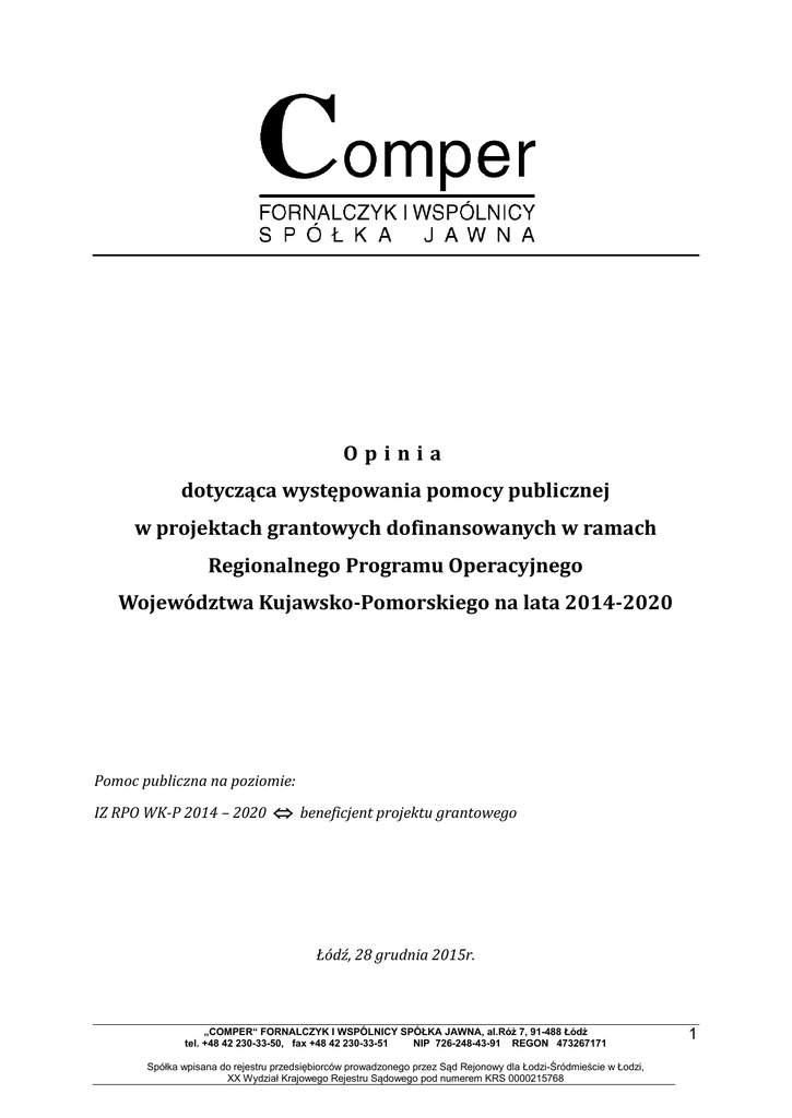 Opinia dotycząca występowania pomocy publicznej w projektach grantowych dofinansowanych w ramach Regionalnego Programu Operacyjnego Województwa Kujawsko-Pomorskiego na lata 2014-2020 Pomoc publiczna na poziomie: IZ RPO WK-P 2014 – 2020 beneficjent projektu grantowego Łódź, 28 grudnia 2015r. „COMPER“ FORNALCZYK I WSPÓLNICY SPÓŁKA JAWNA, al.Róż 7, 91-488 Łódź tel. +48 42 230-33-50, fax +48 42 230-33-51 NIP 726-248-43-91 REGON 473267171 Spółka wpisana do rejestru przedsiębiorców prowadzonego przez Sąd Rejonowy dla Łodzi-Śródmieście w Łodzi, XX Wydział Krajowego Rejestru Sądowego pod numerem KRS 0000215768 1 Skróty używane w notatce: B+R Badania i rozwój Decyzja UOIG Decyzja Komisji z dnia 20 grudnia 2011 r. w sprawie stosowania art. 106 ust. 2 Traktatu o funkcjonowaniu Unii Europejskiej do pomocy państwa w formie rekompensaty z tytułu świadczenia usług publicznych, przyznawanej przedsiębiorstwom zobowiązanym do wykonywania usług świadczonych w ogólnym interesie gospodarczym1 EFRR Europejski Fundusz Rozwoju Regionalnego IZ RPO WK-P Instytucja Zarządzająca Regionalnym Programem Operacyjnym Województwa Kujawsko-Pomorskiego na lata 2014 - 2020 Komunikat Komisji w sprawie pomocy publicznej na działalność badawczą i rozwojową Komunikat Komisji Zasady ramowe dotyczące pomocy państwa na działalność badawczą, rozwojową i innowacyjną2 Komunikat Komisji w sprawie finansowania ryzyka Komunikat Komisji Wytyczne Unii w sprawie pomocy państwa na rzecz promowania inwestycji w zakresie finansowania ryzyka3 MŚP Małe i średnie przedsiębiorstwa PSZOK Punkt selektywnej zbiórki odpadów komunalnych Regionalna Strategia Innowacji Województwa Kujawsko-Pomorskiego na lata 2014-2020 Załącznik do uchwały nr 2/14/15 Zarządu Województwa Kujawsko-Pomorskiego z dnia 14 stycznia 2015 r. w sprawie przyjęcia programu rozwoju pn. „Regionalna Strategia Innowacji Województwa Kujawsko-Pomorskiego na lata 2014-2020” Regulamin Konkursu Projekty Grantowe Badawczo-Rozwojowe Regulamin konkursu Nr RPKP.01.02.01-IZ.00-04-006/15 dla Osi priorytetowej 1 Wzmocnienie innowacyjności i konkurencyjności gospodarki regionu, Działania 1.2 Promowanie inwestycji przedsiębiorstw w badania i innowacje, Poddziałania 1.2.1 Wsparcie procesów badawczo-rozwojowych4 Regulamin Konkursu Projekty Grantowe Gospodarka Odpadami Regulamin konkursu Nr RPKP.04.02.00-IZ.00-04-007/15 dla Osi Priorytetowej 4 Region przyjazny środowisku, Działania 4.2 Gospodarka odpadami 5 Rozporządzenie 1301/2013 Rozporządzenie Parlamentu Europejskiego i Rady z dnia 17 grudnia 2013 r. Nr 1301/2013 w sprawie Europejskiego Funduszu Rozwoju Regionalnego i przepisów szczególnych dotyczących celu „Inwestycje na rzecz wzrostu i zatrudnienia” oraz w sprawie uchylenia rozporządzenia (WE) nr 1080/20066 Rozporządzenie 1407/2013 Rozporządzenie z dnia 18 grudnia 2013 r. w sprawie stosowania art. 107 i 108 Traktatu o funkcjonowaniu Unii Europejskiej do pomocy de minimis7 Rozporządzenie 651/2014 Rozporządzenie z dnia 17 czerwca 2014 r. nr 651/2014 uznające niektóre rodzaje pomocy za zgodne z rynkiem wewnętrznym w zastosowaniu art. 107 i 108 Traktatu.8 Dz.Urz.UE L 7/3 z dnia 11 stycznia 2012r. Dz.Urz.UE C 198/1 z dnia 27 czerwca 2014r. 3 Dz.Urz.UE C 19/4 z dnia 22.01.2014r. 4 Załącznik nr 2 do uchwały nr 48/1728/15 Zarządu Województwa Kujawsko-Pomorskiego, z dnia 25 listopada 2015r. 5 Załącznik nr 2 do uchwały nr 48/1729/15 Zarządu Województwa Kujawsko-Pomorskiego z dnia 25 listopada 2015r. 6 Dz.U.UE L 347/289 z dnia 20 grudnia 2013r. 7 Dz.U.UE L 352/1 z dnia 24 grudnia 2013r. 8 Dz.U.UE L 187/1 z dnia 26 czerwca 2014r. 1 2 91-488 Łódź, al. Róż 7 fax: (42) 230-33-51, tel. (42) 230-33-50; e - mail: [email protected] 2 Rozporządzenie MIR w sprawie pomocy de minimis Rozporządzenie Ministra Infrastruktury i Rozwoju z dnia 19 marca 2015 r. w sprawie udzielania pomocy de minimis w ramach regionalnych programów operacyjnych na lata 2014-20209 Rozporządzenie MIR w sprawie pomocy na badania Rozporządzenie Ministra Infrastruktury i Rozwoju z dnia 21 lipca 2015 r. w sprawie udzielania pomocy na badania podstawowe, badania przemysłowe, eksperymentalne prace rozwojowe oraz studia wykonalności w ramach regionalnych programów operacyjnych10 Rozporządzenie MIR w sprawie regionalnej pomocy inwestycyjnej Rozporządzenie Ministra infrastruktury i Rozwoju z dnia 3 września 2015r. w sprawie udzielania regionalnej pomocy inwestycyjnej w ramach regionalnych programów operacyjnych na lata 2014-20211 RPO WK-P Regionalny Program Operacyjny Województwa Kujawsko-Pomorskiego na lata 2014-2020 SZOOP Szczegółowy opis osi priorytetowych Regionalnego Programu Operacyjnego Województwa Kujawsko-Pomorskiego na lata 2014-2020, przyjęty Uchwałą nr 45/1607/15 z dnia 4 listopada 2015 r. Zarządu Województwa Kujawsko-Pomorskiego TFUE Traktat o Funkcjonowaniu Unii Europejskiej12. Uchwała nr 27/2015 Uchwała Nr 27/2015 z dnia 30 października 2015 r. Komitetu Monitorującego Regionalny Program Operacyjny Województwa Kujawsko-Pomorskiego na lata 20142020 Uchwała nr 29/2015 Uchwała Nr 29/2015 z dnia 30 października 2015 r. Komitetu Monitorującego Regionalny Program Operacyjny Województwa Kujawsko-Pomorskiego na lata 20142020 UOIG Usługa w ogólnym interesie gospodarczym Ustawa prawo ochrony środowiska Ustawa z dnia 27 kwietnia 2001 r. Prawo ochrony środowiska13 Ustawa wdrożeniowa Ustawa z dnia 11 lipca 2014 r. o zasadach realizacji programów w zakresie polityki spójności finansowanych w perspektywie 2014-202014 Właściwa instytucja Departament Wdrażania EFRR Urzędu Marszałkowskiego Województwa KujawskoPomorskiego Wytyczne MIR w zakresie kwalifikowalności wydatków Wytyczne Ministerstwa Infrastruktury i Rozwoju z dnia 10 kwietnia 2015r. w zakresie kwalifikowalności wydatków w ramach Europejskiego Funduszu Rozwoju Regionalnego, Europejskiego Funduszu Społecznego oraz Funduszu Spójnośc