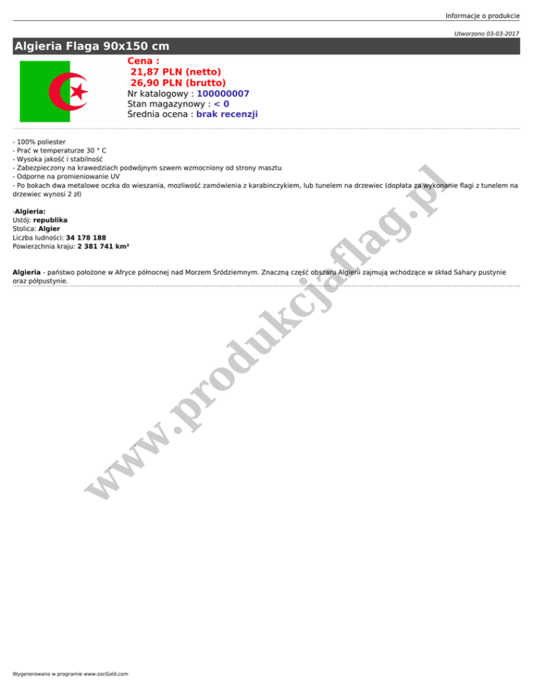 Informacje o produkcie Utworzono 03-03-2017 Algieria Flaga 90x150 cm Cena : 21,87 PLN (netto) 26,90 PLN (brutto) Nr katalogowy : 100000007 Stan magazynowy : < 0 Średnia ocena : brak recenzji .p l - 100% poliester - Prać w temperaturze 30 ° C - Wysoka jakość i stabilność - Zabezpieczony na krawedziach podwójnym szwem wzmocniony od strony masztu - Odporne na promieniowanie UV - Po bokach dwa metalowe oczka do wieszania, mozliwość zamówienia z karabinczykiem, lub tunelem na drzewiec (dopłata za wykonanie flagi z tunelem na drzewiec wynosi 2 zł) af la g -Algieria: Ustój: republika Stolica: Algier Liczba ludności: 34 178 188 Powierzchnia kraju: 2 381 741 km² w w w .p ro du kc j Algieria - państwo położone w Afryce północnej nad Morzem Śródziemnym. Znaczną część obszaru Algierii zajmują wchodzące w skład Sahary pustynie oraz półpustynie. Wygenerowano w programie www.oscGold.com
