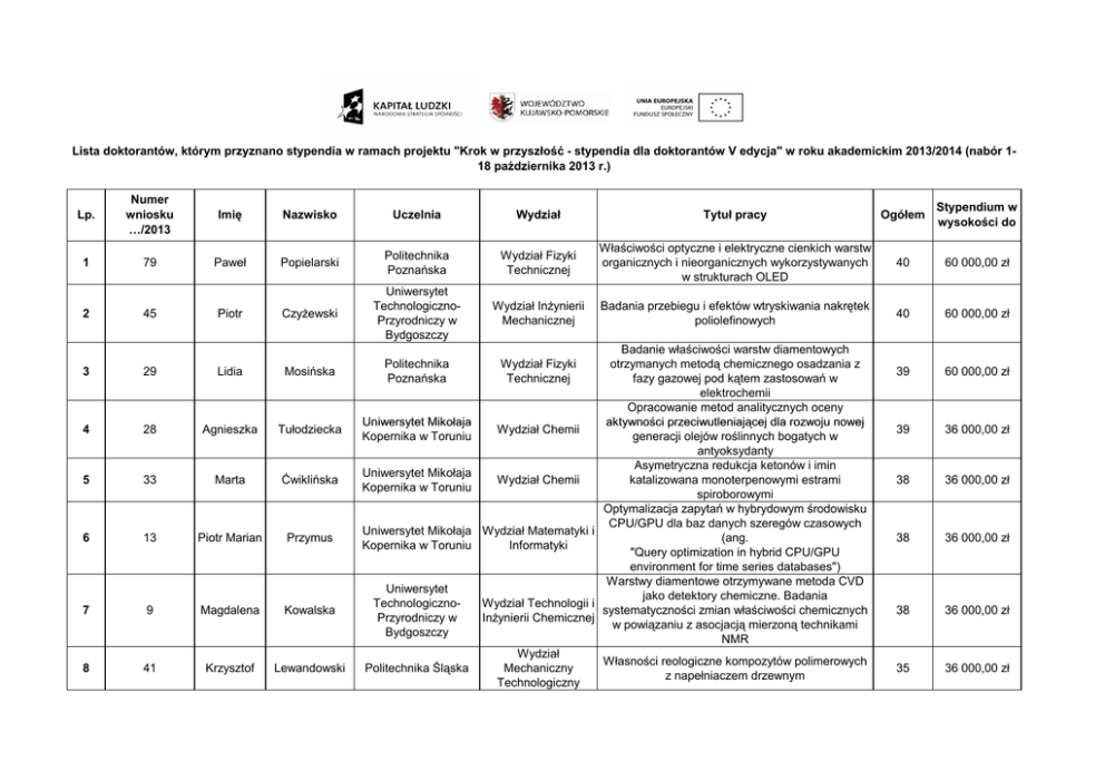 Lista doktorantów, którym przyznano stypendia w ramach projektu "Krok w przyszłość - stypendia dla doktorantów V edycja" w roku akademickim 2013/2014 (nabór 118 października 2013 r.) Lp. Numer wniosku …/2013 Imię Nazwisko Uczelnia Wydział Tytuł pracy Ogółem Stypendium w wysokości do 1 79 Paweł Popielarski Politechnika Poznańska Wydział Fizyki Technicznej Właściwości optyczne i elektryczne cienkich warstw organicznych i nieorganicznych wykorzystywanych w strukturach OLED 40 60 000,00 zł Czyżewski Uniwersytet TechnologicznoPrzyrodniczy w Bydgoszczy Wydział Inżynierii Mechanicznej Badania przebiegu i efektów wtryskiwania nakrętek poliolefinowych 40 60 000,00 zł 39 60 000,00 zł 39 36 000,00 zł 38 36 000,00 zł 38 36 000,00 zł 38 36 000,00 zł 35 36 000,00 zł 2 45 Piotr 3 29 Lidia Mosińska Politechnika Poznańska 4 28 Agnieszka Tułodziecka Uniwersytet Mikołaja Kopernika w Toruniu 5 33 Marta Ćwiklińska Uniwersytet Mikołaja Kopernika w Toruniu 6 13 Piotr Marian Przymus Uniwersytet Mikołaja Kopernika w Toruniu 7 9 Magdalena Kowalska Uniwersytet TechnologicznoPrzyrodniczy w Bydgoszczy 8 41 Krzysztof Lewandowski Politechnika Śląska Badanie właściwości warstw diamentowych otrzymanych metodą chemicznego osadzania z fazy gazowej pod kątem zastosowań w elektrochemii Opracowanie metod analitycznych oceny aktywności przeciwutleniającej dla rozwoju nowej Wydział Chemii generacji olejów roślinnych bogatych w antyoksydanty Asymetryczna redukcja ketonów i imin Wydział Chemii katalizowana monoterpenowymi estrami spiroborowymi Optymalizacja zapytań w hybrydowym środowisku CPU/GPU dla baz danych szeregów czasowych Wydział Matematyki i (ang. Informatyki "Query optimization in hybrid CPU/GPU environment for time series databases") Warstwy diamentowe otrzymywane metoda CVD jako detektory chemiczne. Badania Wydział Technologii i systematyczności zmian właściwości chemicznych Inżynierii Chemicznej w powiązaniu z asocjacją mierzoną technikami NMR Wydział Własności reologiczne kompozytów polimerowych Mechaniczny z napełniaczem drzewnym Technologiczny Wydział Fizyki Technicznej Przesunięcia koordynacyjne 1H, 13C, 15N, 195Pt NMR metodą badań aktywnych biologicznie i katalitycznie związków kompleksowych i metaloorganicznych Au(III), Pd(II), Pt(II) i Pt(IV) z analogami 2-fenylopirydyny 35 36 000,00 zł Modyfikacja algorytmów sterowania przyjmowaniem zgłoszeń w sieciach WI MAX 34 36 000,00 zł Badanie możliwości wynikających z detekcji sygnału świetlnego w dziedzinie Fouriera w obrazowaniu strukturalnym i czynnościowym 34 36 000,00 zł 34 36 000,00 zł 34 36 000,00 zł 34 36 000,00 zł 34 36 000,00 zł Niedzielska Uniwersytet Mikołaja Kopernika w Toruniu 82 Adam Dawid Flizikowski Uniwersytet TechnologicznoPrzyrodniczy w Bydgoszczy 11 75 Szymon Tamborski Uniwersytet Mikołaja Kopernika w Toruniu 12 70 Agnieszka Anna Richert Uniwersytet Mikołaja Kopernika w Toruniu Wydział Biologii i Ochrony Środowiska 13 49 Marta PlaskaczDziuba Uniwersytet Mikołaja Kopernika w Toruniu Wydział Chemii 14 44 Radosław Sadowski Uniwersytet Mikołaja Kopernika w Toruniu Wydział Chemii 15 43 Irena Maja Vuković Kwiatkowska Uniwersytet Mikołaja Kopernika w Toruniu Wydział Chemii 16 36 Katarzyna Skórczewska Politechnika Poznańska Wydział Budowy Maszyn i Zarządzania Wytwarzanie i właściwości nanokompozytów poli (chlorku winylu) z nanorurkami węglowymi 34 36 000,00 zł 17 61 Anna Małgorzata Filipiak-Szok Uniwersytet Mikołaja Kopernika w Toruniu Wydział Chemii Analiza prozdrowotnych i antyodżywczych składników w surowcach roślinnych pochodzenia azjatyckiego oraz otrzymywanych z nich suplementów diety 33 36 000,00 zł 18 42 Danuta Ilona Chmielewska Politechnika Poznańska Wydział Budowy Maszyn i Zarządzania Struktura i właściwości żywic epoksydowych modyfikowanych metalosilseskwioksanami 33 36 000,00 zł 19 15 Magdalena Metzler Uniwersytet Mikołaja Kopernika w Toruniu Wydział Chemii 33 36 000,00 zł 20 8 Stanisław Krzysztof Kozłowski Centrum Astronomiczne im. M. Kopernika PAN Zakład Astrofizyki 33 36 000,00 zł 9 31 Daria 10 Wydział Chemii Wydział Telekomunikacji Informatyki i Elektrotechniki Wydział Fizyki, Astronomii i Informatyki Stosowanej Substancje biobójcze wprowadzone do biodegradowalnych polimerów i ich wpływ na proces mineralizacji Badania nad utylizacją odpadu z instalacji odsiarczania spalin NID (New Integrated Desulphurisation Installation) Łączone techniki chromatograficzne w analityce leków o działaniu przeciwzakrzepowym Nowoczesne materiały oparte na biodegradowalnym poli(kwasie mlekowym) i poliakrylanach. Otrzymywanie, własności i zastosowanie Otrzymywanie i badanie nanokompozytów srebra na bazie poli(kwasu akrylowego) Photometry and spectroscopy of selected eclipsing binaries with the Solaris robotic telescopes. / Fotometria i spektroskopia wybranych układów zaćmieniowych za pomocą zrobotyzowanych teleskopów Solaris Wirwicki Uniwersytet TechnologicznoPrzyrodniczy w Bydgoszczy 21 62 Mateusz Szymon 22 60 Bartosz Paprocki Polska Akademia Nauk 23 35 Joanna Kujawa Uniwersytet Mikołaja Kopernika w Toruniu 24 48 Michał Adam Mięsikowski Uniwersytet Mikołaja Kopernika w Toruniu 25 4 Przemysław Heinrich 26 30 Anna Marlena Piasta 27 50 Wojciech Poćwiardowski Wydział Inżynierii Mechanicznej Badania trwałości i wytrzymałości połączenia klejonego ząb - dwutlenek cyrkonu Instytut Analiza wydajnosci transmisji danych w komórkach Podstawowych i sieciach neuronowych metodami teorii informacji Problemów Techniki Membrany ceramiczne z nanowarstwą Wydział Chemii hydrofobową - otrzymywanie i wybrane właściwości transportowo - selektywne Wydział Biologii i Ochrony Środowiska Wpływ azotanów na wczesny rozwój ryb kostnoszkieletowych Uniwersytet Badania nad otrzymaniem wysokiej czystości TechnologicznoWydział Technologii i skwalenu z nasion amarantusa (Amaranthus Przyrodniczy w Inżynier