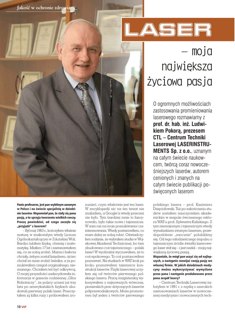 Jakość w ochronie zdrowia Laser – moja największa życiowa pasja O ogromnych możliwościach zastosowania promieniowania laserowego rozmawiamy z prof. dr. hab. inż. Ludwikiem Pokorą, prezesem CTL – Centrum Techniki Laserowej LASERINSTRUMENTS Sp. z o.o., uznanym na całym świecie naukowcem, twórcą coraz nowocześniejszych laserów, autorem cenionych i znanych na całym świecie publikacji poświęconych laserom Panie profesorze, jest pan wybitnym uznanym w Polsce i na świecie specjalistą w dziedzinie laserów. Wspomniał pan, że stały się pana pasją, a to sprzyja tworzeniu wielkich rzeczy. Proszę powiedzieć, od czego zaczęła się „przyjaźń” z laserem? – Był maj 1963 r., kończyłem właśnie maturę w znakomitym wtedy Liceum Ogólnokształcącym w Zduńskiej Woli. Bardzo lubiłem fizykę, chemię i matematykę. Miałem 17 lat i zastanawiałem się, co ze sobą zrobić. Mama i babcia chciały, żebym został księdzem, ojciec chciał ze mnie zrobić leśnika, a ja poszukiwałem czegoś oryginalnego, nieznanego. Chciałem też być odkrywcą. O mojej przyszłości zadecydowała informacja w gazecie codziennej „Głos Robotniczy”, że polscy uczeni już trzy lata po amerykańskich fizykach zbudowali pierwszy polski laser. Przeczytałem ją kilka razy i próbowałem zro10 VIP zumieć, czym właściwie jest ten laser. W encyklopedii nic na ten temat nie znalazłem, a Google’a wtedy przecież nie było. Tym bardziej mnie to fascynowało, było takie nowe i tajemnicze. W sam raz na moje poszukiwania i zainteresowania. Wtedy postanowiłem, co mam dalej ze sobą robić. Oświadczyłem rodzinie, że wybrałem studia w Wojskowej Akademii Technicznej, bo tam zbudowano coś tajemniczego – polski laser! W wyobraźni wyczuwałem, że to coś epokowego. To coś postanowiłem poznawać. Na studiach w WAT krok po kroku poznawałem tajemnice konstrukcji laserów. Fizyki laserowej uczyłem się od twórców pierwszego polskiego lasera. Pracę magisterską wykonywałem z najnowszych wówczas, pionierskich prac dotyczących laserów półprzewodnikowych. Moim promotorem był jeden z twórców pierwszego polskiego lasera – prof. Kazimierz Dzięciołowski. Tuż po zakończeniu studiów zostałem nauczycielem akademickim w zespole ówczesnego rektora WAT-u prof. Sylwestra Kaliskiego. Z tym nieznajomym i tajemniczym wtedy wynalazkiem zwanym laserem, prawdopodobnie „zaocznie” polubiliśmy się. Od tego młodzieńczego impulsu o tajemniczym źródle światła laserowego laser stał się – i jest nadal – moją największą życiową pasją. Wspaniale, że mógł pan uczyć się od najlepszych, a następnie rozwijać swoją pasję we własnej firmie. W jakich dziedzinach medycyny można wykorzystywać wymyślane przez pana i następnie produkowane przez pana zespół lasery? – Centrum Techniki Laserowej założyłem w 1991 r. z myślą o szerokich zastosowaniach laserów w nowoczesnej medycynie i nowoczesnych tech- Jakość w ochronie zdrowia Terapia laserowa to nie współczesny wynalazek, korzystano z niej już w starożytności. Jej obecna forma sięga 1960 roku, kiedy zbudowano pierwszy laser. Niedługo potem pojawił się on też w Polsce, a jego zdrowotne zalety do dziś odkrywają kolejne pokolenia. Leczenie światłem towarzyszy człowiekowi od bardzo dawna. Starożytni Egipcjanie tysiące lat temu skutecznie praktykowali światłoterapię, choć tak jej wówczas nie nazywali. W dawnych latach źródłem światła do leczenia wielu schorzeń było słońce. Od czasu wynalezienia żarówki w światłoterapii zaczęto stosować – oprócz światła słonecznego – lampy konstruowane przez różnych autorów. W roku 1903 r. Niels Ryberg Finsen, duński lekarz, jako pierwszy w świecie otrzymał nagrodę Nobla za leczenie wielu chorób światłem generowanym przez skonstruowaną przez siebie lampę terapeutyczną. Finsen mógł regulować w niej moc światła, która ułatwiała dawkowanie fotonów do konkretnego przypadku chorobowego. Metody światłoterapii przestały się rozwijać wraz z rozwojem leczenia metodami chemicznymi, nazwanymi z czasem farmakoterapią. Nowy impuls do powrotu terapii światłem nastąpił wraz ze zbudowaniem w 1960 r. „żarówki”, nazwanej przez jej twórców laserem. Od pierwszych niemal chwil od zbudowania tego unikalnego źródła światła pojawiły się jego równie unikalne zastosowania w podstawowych dziedzinach życia człowieka, w szczególności medycynie i technologiach laserowych. W Polsce od początku lat 70. zastosowanie tego genialnego narzędzia nierozerwalnie wiąże się z badawczo-konstrukcyjną działalnością zawodową prof. dr. hab. inż. Ludwika Pokory. Sekretarz redakcji i redaktor „Dziennika Gazety Prawnej” Mira Suchodolska w artykule pt. „Znani na całym świecie” napisała: „Profesorowi Ludwikowi Pokorze należy się pomnik – mówią specjaliści z branży stomatologicznej. To dzięki niemu dentyści bezboleśnie i z pominięciem środków znieczulających pomagają swoim pacjentom. Dziś, w wyniku opracowanej przez niego turbiny laserowej borowanie faktycznie przestało przysparzać cierpienia. Prof. Ludwik Pokora jest uznanym na świecie naukowcem, współtwórcą coraz nowocześniejszych laserów. Jest autorem cenionych i znanych na całym świecie publikacji, poświęconych fizyce i technice laserowej oraz laseroterapii i medycynie laserowej. Swoje opracowania w zakresie medycyny i techniki laserowej postanowił upowszechnić w formie wyrobów produkowanych w założonej przez siebie firmie CTL – Centrum Techniki Laserowej LASERINSTRUMENTS Sp. z o.o., prowadzonej wraz z żoną Danutą, synem Marcinem, fizykiem i córką Pauliną, lekarką”. nologiach przemysłowych. Poza tym – jak dumnie brzmi nazwa firmy – zajmujemy się badaniami naukowymi nad światłem laserowym, stosowa- nym w pracach badawczych, w technice pomiarowej, w renowacji zabytków i dzieł sztuki, a także do cel