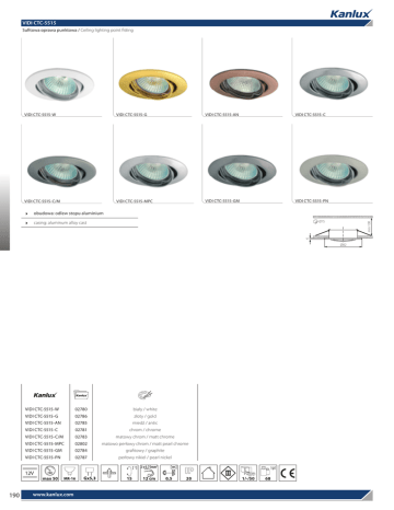 VIDI CTC-5515 Sufitowa oprawa punktowa / Ceiling lighting point fitting VIDI CTC-5515-W VIDI CTC-5515-G VIDI CTC-5515-AN VIDI CTC-5515-C VIDI CTC-5515-C/M VIDI CTC-5515-MPC VIDI CTC-5515-GM VIDI CTC-5515-PN obudowa: odlew stopu aluminium min 100 Ø75 casing: aluminum alloy cast 4 Ø82 VIDI CTC-5515-W 02780 VIDI CTC-5515-G 02786 złoty / gold VIDI CTC-5515-AN 02785 miedź / antic biały / white VIDI CTC-5515-C 02781 chrom / chrome VIDI CTC-5515-C/M 02783 matowy chrom / matt chrome matowo perłowy chrom / matt pearl chrome VIDI CTC-5515-MPC 02802 VIDI CTC-5515-GM 02784 grafitowy / graphite VIDI CTC-5515-PN 02787 perłowy nikiel / pearl nickel 2 x 0,75mm2 max 50 190 www.kanlux.com 15 12 cm 0,5 20 1/-/50 68