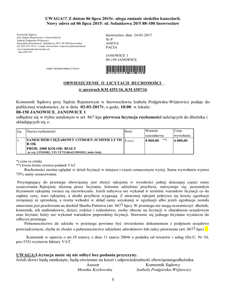 UWAGA!!! Z dniem 06 lipca 2015r. ulega zmianie siedziba kancelarii. Nowy adres od 06 lipca 2015: ul. Solankowa 20/5 88-100 Inowrocław Komornik Sądowy przy Sądzie Rejonowym w Inowrocławiu Izabela Podgórska-Wójtowicz Kancelaria Komornicza Solankowa 20/5, 88-100 Inowrocław tel. 052-357-19-11 e-mail: [email protected] www.komornik.inowroclaw.pl Km 4291/16 Inowrocław, dnia 24-01-2017 Sz P ANETA PACIA JANOWICE 1 88-150 JANOWICE #MM *0020001900612*/0419/ *0020001900612* OBWIESZCZENIE O LICYTACJI RUCHOMOŚCI w sprawach KM 4291/16, KM 4307/16 Komornik Sądowy przy Sądzie Rejonowym w Inowrocławiu Izabela Podgórska-Wójtowicz podaje do publicznej wiadomości, że w dniu 02-03-2017r. o godz. 10:00 w lokalu: 88-150 JANOWICE, JANOWICE 1 odbędzie się w trybie ustalonym w art. 867 kpc pierwsza licytacja ruchomości należących do dłużnika i składających się z: Lp. Nazwa ruchomości Ilość 1 SAMOCHÓD CIĘŻAROWY CITROEN JUMPER 2.5 TD 1 [szt.] R OK PROD. 2000 KOLOR: BIAŁY Wartość szacunkowa 8 000,00 **) Cena wywołania 6 000,00 .nr rej. CIN54582, VIN VF7234K4215893051, kolor biały *) cena za sztukę **) kwota brutto zawiera podatek VAT Ruchomości można oglądać w dzień licytacji w miejscu i czasie oznaczonym wyżej. Suma wywołania wynosi 75% sumy oszacowania. Przystępujący do przetargu obowiązany jest złożyć rękojmię w wysokości jednej dziesiątej części sumy oszacowania. Rękojmię złożoną przez licytanta, któremu udzielono przybicia, zatrzymuje się; pozostałym licytantom rękojmię zwraca się niezwłocznie. Jeżeli nabywca nie wykonał w terminie warunków licytacji co do zapłaty ceny, traci rękojmię, a skutki przybicia wygasają. Z utraconej rękojmi pokrywa się koszty egzekucji związanej ze sprzedażą, a reszta wchodzi w skład sumy uzyskanej w egzekucji albo jeżeli egzekucja została umorzona jest przelewana na dochód Skarbu Państwa (art. 8671 kpc). W przetargu nie mogą uczestniczyć: dłużnik, komornik, ich małżonkowie, dzieci, rodzice i rodzeństwo, osoby obecne na licytacji w charakterze urzędowym oraz licytant, który nie wykonał warunków poprzedniej licytacji. Stawienie się jednego licytanta wystarcza do odbycia przetargu. Pełnomocnictwo do udziału w przetargu powinno być stwierdzone dokumentem z podpisem urzędowo poświadczonym, chyba że chodzi o pełnomocnictwo udzielone adwokatowi lub radcy prawnemu (art. 8672 kpc) Komornik w oparciu o art.18 ustawy z dnia 11 marca 2004r o podatku od towarów i usług (Dz.U. Nr 54, poz.535) wystawia faktury VAT. UWAGA:Licytacja może się nie odbyć bez podania przyczyny. Jeżeli drzwi będą zamknięte, będą otwierane na koszt i odpowiedzialność obowiązanegodłużnika. Asesor Komornik Sądowy Monika Kozłowska Izabela Podgórska-Wójtowicz 1 Adresat oryginału: ANETA PACIA Do wiadomości: 1. POWSZECHNY ZAKŁAD UBEZPIECZEŃ SPÓŁKA AKCYJNA, WARSZAWA, 00-133 WARSZAWA 2. Sąd Rejonowy TABLICA OGŁOSZEŃ, 88-100 Inowrocław 1 3. Urząd Miasta Inowrocław TABLICA OGŁOSZEŃ, 88-100 Inowrocław 1 4. Komornik Sądowy przy Sądzie Rejonowym w Inowrocławiu Izabela Podgórska-Wójtowicz, 88-100 Inowrocław 1 5. a/a 2