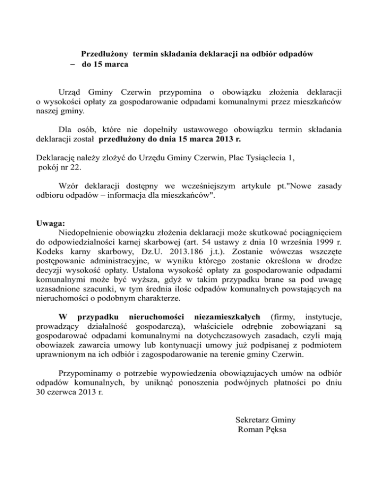 Przedłużony termin składania deklaracji na odbiór odpadów – do 15 marca Urząd Gminy Czerwin przypomina o obowiązku złożenia deklaracji o wysokości opłaty za gospodarowanie odpadami komunalnymi przez mieszkańców naszej gminy. Dla osób, które nie dopełniły ustawowego obowiązku termin składania deklaracji został przedłużony do dnia 15 marca 2013 r. Deklarację należy zlożyć do Urzędu Gminy Czerwin, Plac Tysiąclecia 1, pokój nr 22. Wzór deklaracji dostępny we wcześniejszym artykule pt."Nowe zasady odbioru odpadów – informacja dla mieszkańców". Uwaga: Niedopełnienie obowiązku złożenia deklaracji może skutkować pociągnięciem do odpowiedzialności karnej skarbowej (art. 54 ustawy z dnia 10 września 1999 r. Kodeks karny skarbowy, Dz.U. 2013.186 j.t.). Zostanie wówczas wszczęte postępowanie administracyjne, w wyniku którego zostanie określona w drodze decyzji wysokość opłaty. Ustalona wysokość opłaty za gospodarowanie odpadami komunalnymi może być wyższa, gdyż w takim przypadku brane sa pod uwagę uzasadnione szacunki, w tym średnia ilośc odpadów komunalnych powstających na nieruchomości o podobnym charakterze. W przypadku nieruchomości niezamieszkałych (firmy, instytucje, prowadzący działalność gospodarczą), właściciele odrębnie zobowiązani są gospodarować odpadami komunalnymi na dotychczasowych zasadach, czyli mają obowiazek zawarcia umowy lub kontynuacji umowy już podpisanej z podmiotem uprawnionym na ich odbiór i zagospodarowanie na terenie gminy Czerwin. Przypominamy o potrzebie wypowiedzenia obowiązujacych umów na odbiór odpadów komunalnych, by uniknąć ponoszenia podwójnych płatności po dniu 30 czerwca 2013 r. Sekretarz Gminy Roman Pęksa