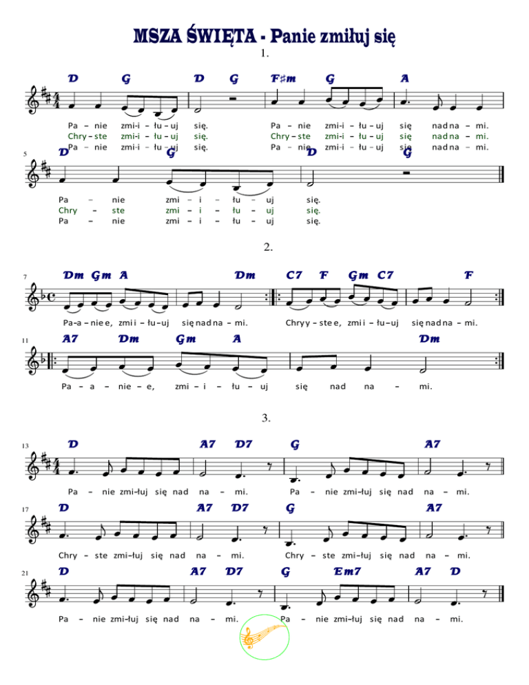 MSZA ŚWIĘTA - Panie zmiłuj się 1. D G 4 4 zmi i zmi i zmi i D G F ♯m G A nad na nad na nad na mi. mi. mi. Pa nie Chry ste Pa nie 5 D łu uj łu uj łu uj się. się. się. G Pa nie Chry ste Pa nie zmi i zmi i zmi i D łu uj łu uj łu uj się się się G uj uj uj się. się. się. Pa Chry Pa nie ste nie zmi zmi zmi i i i łu łu łu 2. Dm Gm A 7 Dm C7 11 A7 Pa łu uj Dm a nie się nad na Gm F mi. Chry y ste e, zmi i łu uj się nad na A e, Gm C7 Pa a nie e, zmi i F zmi i łu mi. Dm uj się nad na mi. 3. D 13 4 4 A7 D7 G A7 nie zmi łuj się nad na mi. Pa 17 nie zmi łuj się nad D na mi. A7 D7 Pa G A7 ste zmi łuj się nad na mi. Chry 21 ste zmi łuj się nad D na mi. A7 D7 Chry G E m7 A7 D nie zmi łuj się nad na mi. Pa nie zmi łuj się nad na mi. Pa C