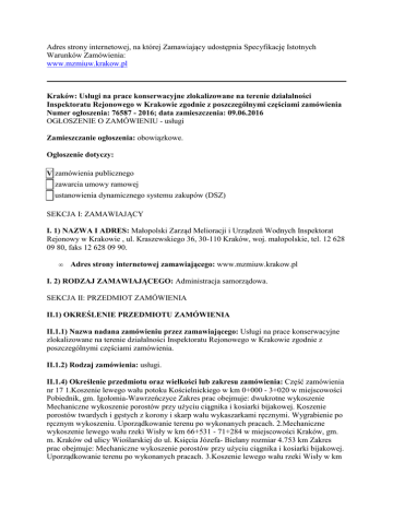 Adres strony internetowej, na której Zamawiający udostępnia Specyfikację Istotnych Warunków Zamówienia: www.mzmiuw.krakow.pl Kraków: Usługi na prace konserwacyjne zlokalizowane na terenie działalności Inspektoratu Rejonowego w Krakowie zgodnie z poszczególnymi częściami zamówienia Numer ogłoszenia: 76587 - 2016; data zamieszczenia: 09.06.2016 OGŁOSZENIE O ZAMÓWIENIU - usługi Zamieszczanie ogłoszenia: obowiązkowe. Ogłoszenie dotyczy: V zamówienia publicznego zawarcia umowy ramowej ustanowienia dynamicznego systemu zakupów (DSZ) SEKCJA I: ZAMAWIAJĄCY I. 1) NAZWA I ADRES: Małopolski Zarząd Melioracji i Urządzeń Wodnych Inspektorat Rejonowy w Krakowie , ul. Kraszewskiego 36, 30-110 Kraków, woj. małopolskie, tel. 12 628 09 80, faks 12 628 09 90. • Adres strony internetowej zamawiającego: www.mzmiuw.krakow.pl I. 2) RODZAJ ZAMAWIAJĄCEGO: Administracja samorządowa. SEKCJA II: PRZEDMIOT ZAMÓWIENIA II.1) OKREŚLENIE PRZEDMIOTU ZAMÓWIENIA II.1.1) Nazwa nadana zamówieniu przez zamawiającego: Usługi na prace konserwacyjne zlokalizowane na terenie działalności Inspektoratu Rejonowego w Krakowie zgodnie z poszczególnymi częściami zamówienia. II.1.2) Rodzaj zamówienia: usługi. II.1.4) Określenie przedmiotu oraz wielkości lub zakresu zamówienia: Część zamówienia nr 17 1.Koszenie lewego wału potoku Kościelnickiego w km 0+000 - 3+020 w miejscowości Pobiednik, gm. Igołomia-Wawrzeńczyce Zakres prac obejmuje: dwukrotne wykoszenie Mechaniczne wykoszenie porostów przy użyciu ciągnika i kosiarki bijakowej. Koszenie porostów twardych i gęstych z korony i skarp wału wykaszarkami ręcznymi. Wygrabienie po ręcznym wykoszeniu. Uporządkowanie terenu po wykonanych pracach. 2.Mechaniczne wykoszenie lewego wału rzeki Wisły w km 66+531 - 71+284 w miejscowości Kraków, gm. m. Kraków od ulicy Wioślarskiej do ul. Księcia Józefa- Bielany rozmiar 4.753 km Zakres prac obejmuje: Mechaniczne wykoszenie porostów przy użyciu ciągnika i kosiarki bijakowej. Uporządkowanie terenu po wykonanych pracach. 3.Koszenie lewego wału rzeki Wisły w km 0+000 ÷ 14+520 w miejscowościach Pobiednik Mały, Koźlica, Odwiśle, Złotniki, Wawrzeńczyce - gm. Igołomia - Wawrzeńczyce Rozmiar 14.520 km Zakres prac obejmuje: dwukrotne wykoszenie Mechaniczne wykoszenie porostów przy użyciu ciągnika i kosiarki bijakowej Koszenie porostów twardych i gęstych z korony i skarp wału wykaszarkami ręcznymi Wygrabienie po ręcznym wykoszeniu Uporządkowanie terenu po wykonanych pracach 4. Koszenie lewego i prawego wału przeciwpowodziowego rzeki Rudawy (do mostu przy ul. Jesionowej) m. Kraków, gm. m. Kraków. Wał lewy 0+000-3+650 (rozmiar 3,65 km), wał prawy 0+000-3+629 (rozmiar 3,629 km). Rozmiar: 7,279 km Zakres prac obejmuje: Wykoszenie porostów ze skarp, korony i międzywala sprzętem mechanicznym - Wykoszenie porostów ze skarp i korony i międzywala przy użyciu sprzętu ręcznego z wygrabienie po ręcznym wykoszeniu i wywiezieniem - uporządkowanie terenu Część zamówienia nr 18 1.Konserwacja bieżąca na prawym wale rzeki Wisła w km wału 96+038-115+438 w miejscowości Niepołomice, Wola Batorska, Zabierzów Bocheński i Wola Zabierzowska, gm. Niepołomice Rozmiar 19.400 km Zakres prac obejmuje: dwukrotne wykoszenie wykoszenie skarp i korony wału (kosiarka bijakowa) 2. Konserwacja bieżąca na prawym i lewym wale potok Drwinka w km wału L=12+890-14+600 i P=12+670-14+730 w miejscowości Chobot i Wola Zabierzowska, gm. Niepołomice Rozmiar 3.770 km Zakres prac obejmuje: dwukrotne wykoszenie wykoszenie skarp i korony wału (mechaniczne - kosiarka bijakowa) 3. Konserwacja bieżąca na prawym wale potok Podłężanka w km wału 0+000-2+700 w miejscowości Niepołomice, gm. Niepołomice Rozmiar: 2.700 km Zakres prac obejmuje:dwukrotne wykoszenie wykoszenie skarp i korony wału (mechaniczne - kosiarka bijakowa) 4.Konserwacja bieżąca na prawym wale potoku Głogoczówka w km 0+000 0+470 w m. Głogoczów, gm. Myślenice Rozmiar: 0,470 km Zakres prac obejmuje: wykoszenie skarp i korony wału (mechaniczne-kosiarka bijakowa) Część zamówienia nr 19 1.Konserwacja bieżąca- wykoszenie lewego wału potoku Podłężanka w km 0+000 -2+850 w miejscowości: Grabie, Węgrzce Wielkie, gm. Wieliczka. Rozmiar: 2.850 km Zakres prac obejmuje: dwukrotne wykoszenie wykoszenie korpusu wału (skarp i korony wału) mechanicznie - kosiarką bijakową oraz pasa tzw. technologicznego o szer. 1,0m po obu stronach wału 2. Konserwacja bieżąca - wykoszenie wałów cofkowych rzeki Serafa prawego w km 0+000 - 3+250 L= 3,250 km lewego w km 0+000 - 2+950 L= 2,950 km w miejscowości: Brzegi, Kokotów ,gm. Wieliczka Rozmiar: 6.200 km Zakres prac obejmuje: mechaniczne wykoszenie skarp i korony wałów (kosiarka bijakowa) oraz pasa tzw. technologicznego o szer. 1,0m po obu stronach wału 3. Konserwacja bieżąca - wykoszenie wałów cofkowych potoku Zabawka prawego w km 0+000 -1+211 L= 1,211 km lewego w km 0+000 -1+139 L= 1,139 km w miejscowości: Brzegi, Kokotów,gm. Wieliczka Rozmiar: 2,350 km Zakres prac obejmuje: mechaniczne wykoszenie skarp i korony wałów - kosiarką bijakową oraz pasa tzw. technologicznego o szer. 1,0m po obu stronach wału 4. Konserwacja bieżąca - wykoszenie wałów cofkowych rzeki Drwina Długa prawego w km 0+000 -1+260 L= 1,260 km lewego w km 0+000 -1+270 L= 1,270 km w miejscowości: Brzegi ,gm. Wieliczka Rozmiar: 2,530 km Zakres prac obejmuje: mechaniczne wykoszenie skarp i korony wałów - kosiarką bijakową oraz tzw. pasa technologicznego o szer. 1,0 m po obu stronach wału prawego i lewego 5.Konserwacja bieżąca- wykoszenie prawego wału rzeki Wisła w km 90+800 - 96+038 w miejscowości Brzegi , Grabie,gm. Wieliczka Rozmiar : 5.238 km Zakres prac obejmuje: mechaniczne wykoszenie skarp i korony wału kosiarką bijakową oraz tzw. pasa technologicznego o szer. 1,0 m po obu stronach wału Część zamówienia nr 20 1. Konserwacja lewego wału rzeki Wisły w km 