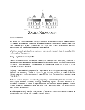 Szanowni Państwo, Jak wiecie, na Zamku Niemodlin trwają intensywne prace konserwacyjne, które w całości pochłaniają naszą uwagę. To przede wszystkim konieczne, podstawowe zabiegi mające na celu zabezpieczenie ścian i stropów tak, by można było przejść do kolejnych, bardziej zaawansowanych projektów planowanych na przyszłość. Właśnie w sprawie planów, które snujemy, a które z dnia na dzień stają się coraz bardziej realne, dziś do Was piszemy. Plany – czyli co zamierzamy zrobić Obecne prace remontowe powinny się zakończyć w przyszłym roku. Tworzymy już wnioski w sprawie pozyskania kolejnych środków na realizację naszych starań. Prawdopodobnie będą pochodzić z dotacji unijnych i ministerialnych. To wymagające zajęcie, ale liczymy na to, że uda nam się uzyskać wsparcie. Państwa – jako mediów i obserwatorów – komentarze w sprawie naszych działań, na pewno będą dla nas pomocne. Pokażą, że Niemodlin jest istotnym punktem na mapie kraju i że istnieje zapotrzebowanie na uratowanie tego obiektu. Będą dla nas solidnym oparciem przy negocjacjach. Jeśli uda nam się pozyskać nowe środki, pragniemy z niemodlińskiej twierdzy stworzyć nie tylko prężny ośrodek kulturalny, atrakcję turystyczną regionu, ale także zapewnić mu możliwość zarabiania na siebie. W jego wnętrzach, jeśli wszystko pójdzie zgodnie z naszym planem, powstanie nie tylko muzeum, ale także hotel z restauracją (oraz… być może centrum spa i odnowy biologicznej). Wśród poważniejszych planów związanych z infrastrukturą okołozamkową mamy także w planach odtworzenie fosy, która niegdyś otaczała obiekt. Konkrety! – czyli co już jest gotowe lub będzie niebawem W tym miesiącu, jak zapewniają nas instalatorzy, będzie gotowa nocna iluminacja zamku. Kilka reflektorów o dużej mocy będzie oświetlać budynek z kilku stron. Będzie nowym, jasnym punktem przy rynku. Jak tylko uda nam się przeprowadzić tekst lamp, udostępnimy zdjęcia. Rzecz jasna, foto-amatorów też zapraszamy. Można „cykać” do woli. W piwnicach powstanie Zbrojownia, to już pewne. Dokonaliśmy w ostatnich dniach nowych zakupów. Już jadą do nas: tarcze, halabardy i hełmy średniowieczne. Na dół przeniesiemy także Izbę Tortur, która będzie sąsiadować ze Zbrojownią oraz zyska nowe oświetlenie. W piwnicach pojawi się także… winiarnia – mamy już beczki – jednak aranżacja wnętrz oraz niezbędne prace to kwestia najbliższych kilku miesięcy. Na zamku powstanie kolejna ekspozycja, której elementy będą się, co jakiś czas zmieniać. W kilku pomieszczeniach utworzona zostanie galeria sztuki, w której prezentować będziemy bogatą kolekcję z różnych stron świata. Tę informację kierujemy także do lokalnych twórców, mamy szczerą nadzieję, że przygotowane przez nas wnętrza zyskają ich aprobatę i zechcą podjąć z nami współpracę.