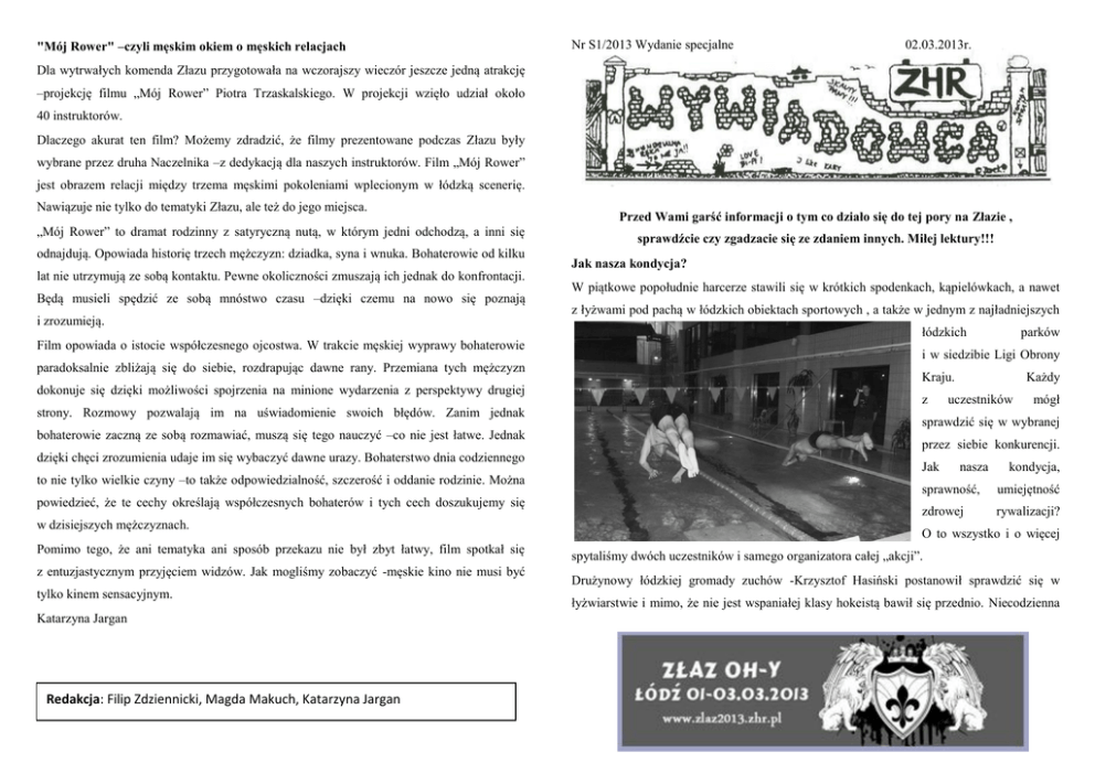 "Mój Rower" –czyli męskim okiem o męskich relacjach Nr S1/2013 Wydanie specjalne 02.03.2013r. Dla wytrwałych komenda Złazu przygotowała na wczorajszy wieczór jeszcze jedną atrakcję –projekcję filmu „Mój Rower” Piotra Trzaskalskiego. W projekcji wzięło udział około 40 instruktorów. Dlaczego akurat ten film? Możemy zdradzić, że filmy prezentowane podczas Złazu były wybrane przez druha Naczelnika –z dedykacją dla naszych instruktorów. Film „Mój Rower” jest obrazem relacji między trzema męskimi pokoleniami wplecionym w łódzką scenerię. Nawiązuje nie tylko do tematyki Złazu, ale też do jego miejsca. „Mój Rower” to dramat rodzinny z satyryczną nutą, w którym jedni odchodzą, a inni się odnajdują. Opowiada historię trzech mężczyzn: dziadka, syna i wnuka. Bohaterowie od kilku lat nie utrzymują ze sobą kontaktu. Pewne okoliczności zmuszają ich jednak do konfrontacji. Będą musieli spędzić ze sobą mnóstwo czasu –dzięki czemu na nowo się poznają i zrozumieją. Film opowiada o istocie współczesnego ojcostwa. W trakcie męskiej wyprawy bohaterowie paradoksalnie zbliżają się do siebie, rozdrapując dawne rany. Przemiana tych mężczyzn dokonuje się dzięki możliwości spojrzenia na minione wydarzenia z perspektywy drugiej strony. Rozmowy pozwalają im na uświadomienie swoich błędów. Zanim jednak bohaterowie zaczną ze sobą rozmawiać, muszą się tego nauczyć –co nie jest łatwe. Jednak dzięki chęci zrozumienia udaje im się wybaczyć dawne urazy. Bohaterstwo dnia codziennego to nie tylko wielkie czyny –to także odpowiedzialność, szczerość i oddanie rodzinie. Można powiedzieć, że te cechy określają współczesnych bohaterów i tych cech doszukujemy się w dzisiejszych mężczyznach. Pomimo tego, że ani tematyka ani sposób przekazu nie był zbyt łatwy, film spotkał się z entuzjastycznym przyjęciem widzów. Jak mogliśmy zobaczyć -męskie kino nie musi być tylko kinem sensacyjnym. Katarzyna Jargan Redakcja: Filip Zdziennicki, Magda Makuch, Katarzyna Jargan Przed Wami garść informacji o tym co działo się do tej pory na Złazie , sprawdźcie czy zgadzacie się ze zdaniem innych. Miłej lektury!!! Jak nasza kondycja? W piątkowe popołudnie harcerze stawili się w krótkich spodenkach, kąpielówkach, a nawet z łyżwami pod pachą w łódzkich obiektach sportowych , a także w jednym z najładniejszych łódzkich parków i w siedzibie Ligi Obrony Każdy Kraju. z uczestników mógł sprawdzić się w wybranej przez siebie konkurencji. Jak nasza kondycja, sprawność, umiejętność zdrowej rywalizacji? O to wszystko i o więcej spytaliśmy dwóch uczestników i samego organizatora całej „akcji”. Drużynowy łódzkiej gromady zuchów -Krzysztof Hasiński postanowił sprawdzić się w łyżwiarstwie i mimo, że nie jest wspaniałej klasy hokeistą bawił się przednio. Niecodzienna konkurencja sprawiła uczestnikom wiele frajdy i to właśnie ona znaczyła najwięcej na lodzie. Złaz w liczbach Rywalizacja zeszła na drugi plan, a mimo to widać było umiejętność przestrzegania zasad Na Złaz OH ZHR zgłosiło się 287 instruktorów, 219 z nich zgłosiło swoją gotowość fair play. w Łodzi. Spośród 12 chorągwi najliczniejszą reprezentacją mogła pochwalić się Chorągiew Kolejny „sportowiec” to Andrzej Dorobisz z Małopolski -wraz ze swoimi kompanami Małopolska i Łódzka –z obu przybyło 35 instruktorów. Największą frekwencją, wybrali koszykówkę. Zawody odbyły się na hali Łódzkiego Klubu Sportowego. bo aż stuprocentową wykazały się Chorągiew Ziemi Opolskiej oraz Chorągiew Przez obsuwę czasową gra musiała być skrócona jednak odbyła się i nikt nie żałował. Północno-Zachodnia. Nie obyło się bez kilku małych sprzeczek z sędzią (jak to w sporcie bywa adrenalina jest na wysokim poziomie) na szczęście gra zakończyła się pomyślnie, a na ustach uczestników cały czas gościł uśmiech, szczególnie w chwilach gdy otrzymywali doping niekoniecznie od własnej chorągwi. Hm. Adam Kralisz -organizator zawodów nie zdradzi jeszcze wyników, ale może powiedzieć, że wszystko się udało, kondycja harcerzy nie zadawala w pełni, radzimy trenować kondycję i budować mięśnie na kolejne takie wydarzenie. Dziękujemy za obecność, zdrową rywalizację i braterstwo. Pati Katarzyna Jargan Wywiad ze strażnikiem porządku i czasu na Złazie Pwd. Szymon Bukowicz jest odpowiedzialny za to, aby wszystko podczas Złazu szło zgodnie z planem. Udało się nam złapać w biegu druha oboźnego i zadać mu kilka pytań: -Jak druh ocenia obecny Złaz i uczestników? -Złaz oceniam pozytywnie, harmonogram jest bardzo mocno przepełniony, ale to akurat jest cecha pozytywna, ponieważ gdyby nic się nie działo to byśmy się nudzili, przecież nie po to przejechaliśmy przez Polskę, żeby teraz siedzieć. Uczestników… Jako oboźny mam tu akurat tą ciemną stronę medalu, że muszę być tym, który krzyczy zbiórki, w związku z tym, uważam tak, no jest wystarczająco, ale zawsze może być lepiej co do dyscypliny. -A czy druh oboźny ma dużo obowiązków, ma czas, żeby się wyspać, zjeść spokojnie czy raczej nie? Łódź na starych fotografiach Jestem rodowitym łodzianinem i wydawało mi się, że to miasto nie może mnie już niczym zaskoczył. Jakieś dwa lata temu kiedy z drużyną przygotowywałem się do Turnieju Drużyn Leśnych trafiłem na stronę ze starymi zdjęciami Łodzi, wybrałem dwie, które najbardziej mnie zaskoczyły. Poznałem inną stronę miasta, w którym się wychowałem, a jej wcześniej nie znałem. Łódź jest miastem, które było świadkiem rewolucji przemysłowej. Na pocztówkach z XIXw. widać las kominów i wydostający się przez nie dym. Według relacji jednego z moich prowadzących z uczelni, który w latach 50-tych ubiegłego wieku mieszkał na ulicy Piotrkowskiej powietrze w naszym mieście było przepełnio