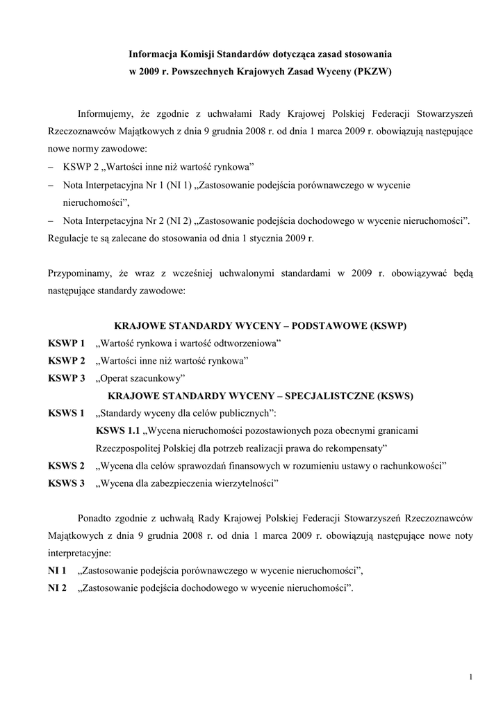 Informacja Komisji Standardów dotycząca zasad stosowania w 2009 r. Powszechnych Krajowych Zasad Wyceny (PKZW) Informujemy, Ŝe zgodnie z uchwałami Rady Krajowej Polskiej Federacji Stowarzyszeń Rzeczoznawców Majątkowych z dnia 9 grudnia 2008 r. od dnia 1 marca 2009 r. obowiązują następujące nowe normy zawodowe: − KSWP 2 „Wartości inne niŜ wartość rynkowa” − Nota Interpetacyjna Nr 1 (NI 1) „Zastosowanie podejścia porównawczego w wycenie nieruchomości”, − Nota Interpetacyjna Nr 2 (NI 2) „Zastosowanie podejścia dochodowego w wycenie nieruchomości”. Regulacje te są zalecane do stosowania od dnia 1 stycznia 2009 r. Przypominamy, Ŝe wraz z wcześniej uchwalonymi standardami w 2009 r. obowiązywać będą następujące standardy zawodowe: KRAJOWE STANDARDY WYCENY – PODSTAWOWE (KSWP) KSWP 1 „Wartość rynkowa i wartość odtworzeniowa” KSWP 2 „Wartości inne niŜ wartość rynkowa” KSWP 3 „Operat szacunkowy” KRAJOWE STANDARDY WYCENY – SPECJALISTCZNE (KSWS) KSWS 1 „Standardy wyceny dla celów publicznych”: KSWS 1.1 „Wycena nieruchomości pozostawionych poza obecnymi granicami Rzeczpospolitej Polskiej dla potrzeb realizacji prawa do rekompensaty” KSWS 2 „Wycena dla celów sprawozdań finansowych w rozumieniu ustawy o rachunkowości” KSWS 3 „Wycena dla zabezpieczenia wierzytelności” Ponadto zgodnie z uchwałą Rady Krajowej Polskiej Federacji Stowarzyszeń Rzeczoznawców Majątkowych z dnia 9 grudnia 2008 r. od dnia 1 marca 2009 r. obowiązują następujące nowe noty interpretacyjne: NI 1 „Zastosowanie podejścia porównawczego w wycenie nieruchomości”, NI 2 „Zastosowanie podejścia dochodowego w wycenie nieruchomości”. 1 Dla rzeczoznawców majątkowych zrzeszonych w stowarzyszeniach tworzących Polską Federację Stowarzyszeń Rzeczoznawców Majątkowych wszystkie wyŜej wymienione standardy stanowić będą od 1 marca 2009 r. obowiązkowe reguły postępowania przy wykonywaniu zawodu rzeczoznawcy majątkowego. Z tego względu regulacje tych standardów wraz notami interpretacyjnymi NI 1 i NI 2 naleŜy uwzględniać przy wykonywaniu oceny operatów szacunkowych przez organizacje zawodowe zrzeszone Polskiej Federacji Stowarzyszeń Rzeczoznawców Majątkowych. Ponadto nadal nie uchylono następujących tymczasowych not interpretacyjnych: 1) III.3 Ustalenie stanu prawnego przedmiotu wyceny, 2) III.4 Zasady ustalania zuŜycia, 3) IV.1 Wpływ czynników środowiskowych na wycenę nieruchomości, 4) IV.4 Wybrane ograniczone prawa rzeczowe i zobowiązaniowe. Zasady wyceny, 5) V.3 Wycena nieruchomości zabytkowych, 6) V.4 Wycena nieruchomości rolnych, 7) V.6 Wycena nieruchomości leśnych oraz zadrzewionych i zakrzewionych, 8) V.7 Wycena nieruchomości gruntowych połoŜonych na złoŜach kopalin, 9) V.8 Zasady określania szkód spowodowanych budową infrastruktury podziemnej i naziemnej, 10) VI.1 Wycena maszyn i urządzeń trwale związanych z nieruchomością. Zwracamy uwagę, Ŝe status powyŜszych norm zawodowych jest zróŜnicowany: − Standardy zawodowe (symbole „KSWP” i „KSWS”) posiadają status standardów zawodowych w rozumieniu przepisów o gospodarce nieruchomościami, jednak nie zostały do tej pory uzgodnione z Ministrem Infrastruktury. − Noty interpretacyjne NI 1, NI 2 stanowią uzgodnione w środowisku zawodowym rzeczoznawców majątkowych zrzeszonych Polskiej Federacji Stowarzyszeń Rzeczoznawców Majątkowych zasady dobrej praktyki wykonywania zawodu. − Standardy dotychczasowe (symbole np. III.4, V.4) posiadają charakter tymczasowych not interpretacyjnych i wykorzystywane są dobrowolnie przez rzeczoznawców majątkowych zrzeszonych Polskiej Federacji Stowarzyszeń Rzeczoznawców Majątkowych w całości lub części, w zakresie zgodnym z zasadami dobrej praktyki zawodowej, bez konieczności uzasadniania zastosowanych odstępstw. Zwracamy uwagę, Ŝe część „starych” standardów została wycofana ze stosowania ze względu na zastąpienie nowymi notami lub standardami albo utratę aktualności ich treści. W zakresie zgodnym z przyjętymi odstępstwami przez autora(ów) operatów szacunkowych regulacje tymczasowych not interpretacyjnych naleŜy uwzględniać przy przeprowadzaniu oceny operatów szacunkowych przez 2 organizacje zawodowe. W przypadku oceny prowadzonej przez organizacje zawodowe naleŜy więc uwzględniać dobrowolny charakter tymczasowych not interpretacyjnych. Tymczasowy charakter not interpretacyjnych wskazuje, Ŝe zasady wyceny w nich zawarte będą sukcesywnie zastępowane przez nowe noty interpretacyjne. Wprowadzenie w okresie przejściowym, do czasu opracowania aktualnych not interpretacyjnych, norm o statusie tymczasowych not interpretacyjnych wskazuje, Ŝe w ocenie Komisji Standardów regulacje tam zawarte wymagają istotnych zmian i uzupełnień. Ponadto pragnę poinformować, Ŝe Komisja Standardów PFSRM prowadzi prace nad następującymi notami interpretacyjnymi: − Nota Interpetacyjna Nr 3 (NI 3) Zastosowanie podejścia kosztowego w wycenie nieruchomości, − Nota Interpetacyjna Nr 4 (NI 4) Zastosowanie metody pozostałościowej w wycenie nieruchomości, − Nota Interpetacyjna Nr 5 (NI 5) Wycena przedsiębiorstw Stan zawansowania prac wskazuje, Ŝe będą one przekazane do dyskusji środowiskowej w pierwszej połowie 2009 r. a ich przyjęcie do stosowania powinno nastąpić do końca 2009 r. Ponadto w trakcie uzgadniania KSWS 3 „Wycena dla zabezpieczenia wierzytelności” przeprowadzono konsultacje ze Związkiem Banków Polskich i Komisją Nadzoru Finansowego. W wyniku tych konsultacji niezbędne okazało się przygotowanie nowej redakcji punktów 2.2., 2.3. oraz 4.2 i 4.3. KSWS 3. Po formalnym przyjęciu zaproponowanych zmian standard w nowej redakcji zostanie niezwłocznie przekazany do wykorzystania. Prezentowany materiał przygotowano na potrzeby Zarządu PFSRM z prośbą o rozpowszechnienie wśród rzeczoznawców majątkowych poprzez lokalne stowarz