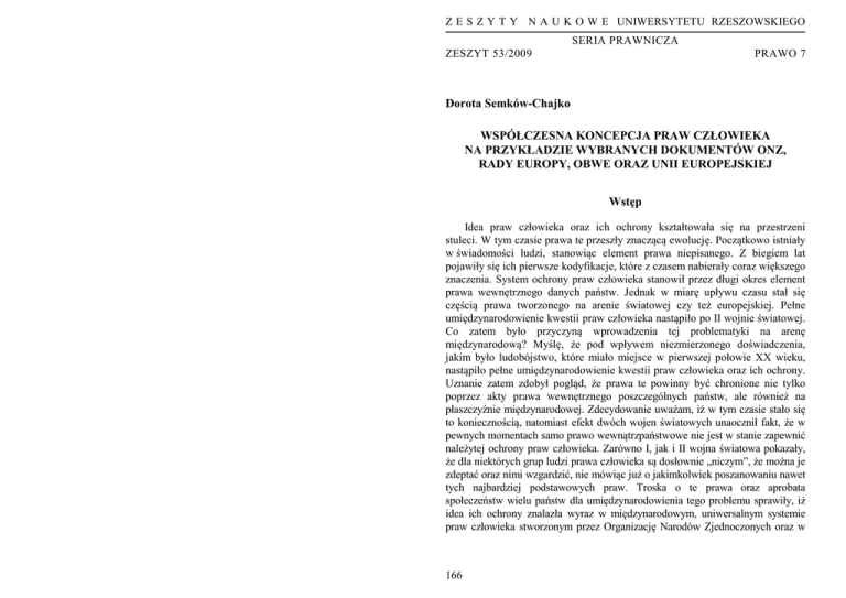 Z E S Z Y T Y N A U K O W E UNIWERSYTETU RZESZOWSKIEGO SERIA PRAWNICZA ZESZYT 53/2009 PRAWO 7 Dorota Semków-Chajko WSPÓŁCZESNA KONCEPCJA PRAW CZŁOWIEKA NA PRZYKŁADZIE WYBRANYCH DOKUMENTÓW ONZ, RADY EUROPY, OBWE ORAZ UNII EUROPEJSKIEJ Wstęp Idea praw człowieka oraz ich ochrony kształtowała się na przestrzeni stuleci. W tym czasie prawa te przeszły znaczącą ewolucję. Początkowo istniały w świadomości ludzi, stanowiąc element prawa niepisanego. Z biegiem lat pojawiły się ich pierwsze kodyfikacje, które z czasem nabierały coraz większego znaczenia. System ochrony praw człowieka stanowił przez długi okres element prawa wewnętrznego danych państw. Jednak w miarę upływu czasu stał się częścią prawa tworzonego na arenie światowej czy też europejskiej. Pełne umiędzynarodowienie kwestii praw człowieka nastąpiło po II wojnie światowej. Co zatem było przyczyną wprowadzenia tej problematyki na arenę międzynarodową? Myślę, że pod wpływem niezmierzonego doświadczenia, jakim było ludobójstwo, które miało miejsce w pierwszej połowie XX wieku, nastąpiło pełne umiędzynarodowienie kwestii praw człowieka oraz ich ochrony. Uznanie zatem zdobył pogląd, że prawa te powinny być chronione nie tylko poprzez akty prawa wewnętrznego poszczególnych państw, ale również na płaszczyźnie międzynarodowej. Zdecydowanie uważam, iż w tym czasie stało się to koniecznością, natomiast efekt dwóch wojen światowych unaocznił fakt, że w pewnych momentach samo prawo wewnątrzpaństwowe nie jest w stanie zapewnić należytej ochrony praw człowieka. Zarówno I, jak i II wojna światowa pokazały, że dla niektórych grup ludzi prawa człowieka są dosłownie „niczym”, że można je zdeptać oraz nimi wzgardzić, nie mówiąc już o jakimkolwiek poszanowaniu nawet tych najbardziej podstawowych praw. Troska o te prawa oraz aprobata społeczeństw wielu państw dla umiędzynarodowienia tego problemu sprawiły, iż idea ich ochrony znalazła wyraz w międzynarodowym, uniwersalnym systemie praw człowieka stworzonym przez Organizację Narodów Zjednoczonych oraz w 166 tzw. systemach regionalnych, których przykład stanowi europejski system ochrony praw człowieka. Warto również w tym miejscu wspomnieć, że pewną zapowiedzią umiędzynarodowienia tego problemu były działania Międzynarodowego Komitetu Czerwonego Krzyża, traktaty pokojowe zawierane po I wojnie światowej oraz działalność Ligi Narodów i Międzynarodowej Organizacji Pracy. Tytuł niniejszego artykułu brzmi „Współczesna koncepcja praw człowieka na przykładzie wybranych dokumentów ONZ, Rady Europy, OBWE oraz Unii Europejskiej”. Dlaczego jednak wybrałam tylko część aktów prawnych? Otóż ONZ przez kilkadziesiąt lat swojego funkcjonowania i intensywnej pracy na rzecz ochrony praw człowieka stworzyła szereg aktów prawnych oraz powołała do życia organy, które razem stworzyły uniwersalny system tych praw oraz ich ochrony. Chcąc jednak opisać wszystkie dokumenty z tego zakresu, należałoby bowiem stworzyć oddzielną pracę czy też osobną publikację. Natomiast ramy oraz wytyczne artykułu nie pozwalają na tak szerokie ujęcie tego problemu. Dlatego też postanowiłam wybrać podstawowe dokumenty, które stanowią podstawę oraz fundament systemu praw człowieka stworzonego przez Organizacją Narodów Zjednoczonych. W końcowym etapie tej części artykułu, który dotyczy ONZ, pozwoliłam sobie jednak wymienić pozostałe dokumenty z tego zakresu. W przypadku europejskiego systemu praw człowieka kwestia przedstawia się następująco. Opiera się on na trzech systemach normatywnych, takich jak system Rady Europy, Unii Europejskiej oraz Organizacji Bezpieczeństwa i Współpracy w Europie. Podobnie jak w przypadku ONZ wybrałam te dokumenty czy też elementy systemu kontrolnego, które stanowią wyznacznik prowadzenia działalności na rzecz ochrony praw człowieka w ramach systemu europejskiego, oraz te, które najczęściej znajdują się w kręgu zainteresowań osób zajmujących się tą tematyką. Wyjaśnienia wymaga dodatkowo fakt, że koncepcja praw człowieka stworzona przez Unię Europejską oraz OBWE pochodzi z czasów, kiedy Unia funkcjonowała jeszcze tylko jako Wspólnoty, natomiast OBWE jako KBWE. Prawa człowieka oraz ich ochrona w wybranych dokumentach Organizacji Narodów Zjednoczonych Skrupulatnie stworzoną koncepcję ochrony praw człowieka zawierają dokumenty Organizacji Narodów Zjednoczonych. Zatem w niniejszej części artykułu postaram się przybliżyć kwestię praw człowieka oraz ich ochrony w ujęciu wybranych dokumentów tej organizacji. 167 Organizacja Narodów Zjednoczonych podjęła inicjatywę kodyfikacji prawa międzynarodowego w dziedzinie praw człowieka w momencie powołania jej do życia. Karta Narodów Zjednoczonych została podpisana w czerwcu 1945 roku na Konferencji w San Francisco i już w swojej preambule mówiła o prawach człowieka, które następnie rozwinęła wielu przepisach. Zgodnie z tym dokumentem jednym z celów ONZ było „popierać i zachęcać do poszanowania praw człowieka i podstawowych wolności dla wszystkich, bez względu na rasę, płeć, język lub wyznanie”1. Uważam, iż stwierdzenie to jest podstawą i wyznacznikiem dalszych działań ONZ na polu ochrony tych praw. Do praw człowieka nawiązują również przepisy, które normują funkcje ONZ, kompetencje jej organów oraz wyznaczają obowiązki państw na polu międzynarodowej współpracy gospodarczej i społecznej. Pomimo że, jak już wyżej wspomniałam, założenia Karty stały się fundamentem do dalszej działalności na tej płaszczyźnie, to jednak nie była ona pozbawiona braków w tej dziedzinie. Za przykład podam tutaj fakt, że sama Karta nie zawierała katalogu praw człowieka, formułowała je jedynie w sposób bardzo ogólny, nie definiując tym samym ich treści, zadanie to pozostawiając do unormowania w kol