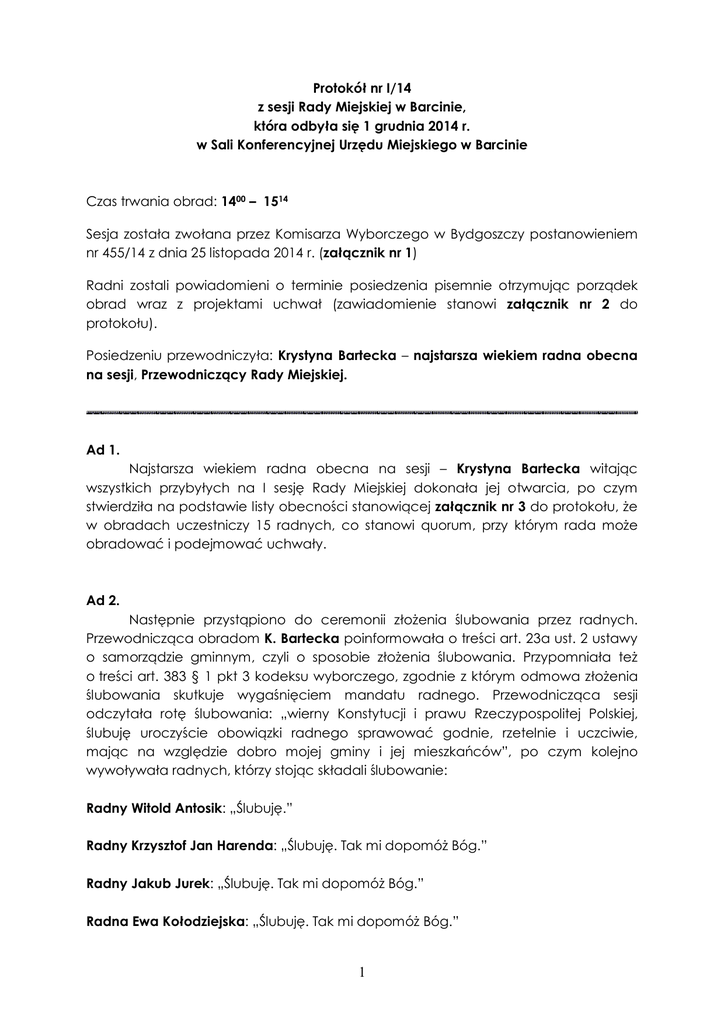 Protokół nr I/14 z sesji Rady Miejskiej w Barcinie, która odbyła się 1 grudnia 2014 r. w Sali Konferencyjnej Urzędu Miejskiego w Barcinie Czas trwania obrad: 1400 – 1514 Sesja została zwołana przez Komisarza Wyborczego w Bydgoszczy postanowieniem nr 455/14 z dnia 25 listopada 2014 r. (załącznik nr 1) Radni zostali powiadomieni o terminie posiedzenia pisemnie otrzymując porządek obrad wraz z projektami uchwał (zawiadomienie stanowi załącznik nr 2 do protokołu). Posiedzeniu przewodniczyła: Krystyna Bartecka – najstarsza wiekiem radna obecna na sesji, Przewodniczący Rady Miejskiej. Ad 1. Najstarsza wiekiem radna obecna na sesji – Krystyna Bartecka witając wszystkich przybyłych na I sesję Rady Miejskiej dokonała jej otwarcia, po czym stwierdziła na podstawie listy obecności stanowiącej załącznik nr 3 do protokołu, że w obradach uczestniczy 15 radnych, co stanowi quorum, przy którym rada może obradować i podejmować uchwały. Ad 2. Następnie przystąpiono do ceremonii złożenia ślubowania przez radnych. Przewodnicząca obradom K. Bartecka poinformowała o treści art. 23a ust. 2 ustawy o samorządzie gminnym, czyli o sposobie złożenia ślubowania. Przypomniała też o treści art. 383 § 1 pkt 3 kodeksu wyborczego, zgodnie z którym odmowa złożenia ślubowania skutkuje wygaśnięciem mandatu radnego. Przewodnicząca sesji odczytała rotę ślubowania: „wierny Konstytucji i prawu Rzeczypospolitej Polskiej, ślubuję uroczyście obowiązki radnego sprawować godnie, rzetelnie i uczciwie, mając na względzie dobro mojej gminy i jej mieszkańców”, po czym kolejno wywoływała radnych, którzy stojąc składali ślubowanie: Radny Witold Antosik: „Ślubuję.” Radny Krzysztof Jan Harenda: „Ślubuję. Tak mi dopomóż Bóg.” Radny Jakub Jurek: „Ślubuję. Tak mi dopomóż Bóg.” Radna Ewa Kołodziejska: „Ślubuję. Tak mi dopomóż Bóg.” 1 Radny Hubert Łukomski: „Ślubuję. Tak mi dopomóż Bóg.” Radny Piotr Niestatek: „Ślubuję. Tak mi dopomóż Bóg.” Radny Remigiusz Paszkiet: „Ślubuję. Tak mi dopomóż Bóg.” Radny Henryk Franciszek Popławski: „Ślubuję.” Radny Paweł Ratajczak: „Ślubuję.” Radny Rafał Rydlewski: „Ślubuję. Tak mi dopomóż Bóg.” Radny Bartłomiej Uszko: „Ślubuję. Tak mi dopomóż Bóg.” Radna Teresa Wilk: „Ślubuję.” Radny Janusz Paweł Wojtkowiak: „Ślubuję.” Radny Sławomir Zelek: „Ślubuję. Tak mi dopomóż Bóg.” Radna Krystyna Maria Bartecka: „Ślubuję. Tak mi dopomóż Bóg.” Po złożeniu ślubowania autoprezentację. prowadząca obrady poprosiła radnych o krótką Radny Rafał Rydlewski: „Jestem żonaty, mam 2 dorosłych dzieci – synów i jestem nauczycielem w Gimnazjum nr 1 w Barcinie im. Henryka Sienkiewicza.” Radny Henryk Popławski: „Henryk Popławski, jestem radnym trzecią kadencję, pracuję w Spółdzielni Mieszkaniowej „Kujawy” w Barcinie, żonaty, jedno dziecko.” Radny Bartłomiej Uszko: „Nazywam się Bartłomiej Uszko i od blisko 30 lat mieszkam w Piechcinie, z małym poślizgiem, rocznym. Od 5 lat pracuję w Miejskim Domu Kultury, dokładniej w Telewizji Lokalnej Barcin, skąd większość z państwa mnie zna. Z tego miejsca pragnę serdecznie podziękować tym 141 mieszkańcom Piechcina, którzy zechcieli 16 listopada oddać na mnie swój głos, a wszystkim mieszkańcom gminy Barcin obiecać, że ten ogromny kredyt zaufania, który u państwa zaciągnąłem przez najbliższe 4 lata chcę spłacić. Od roku jestem bardzo szczęśliwie żonaty z przewspaniałą kobietą Olgą, mam nadzieję równie szczęśliwą.” Radny Remigiusz Paszkiet: „Nazywam się Remigiusz Paszkiet. Jestem tutaj po raz pierwszy. Mieszkam w bloku nr 3 na ul. Lotników, oczywiście w Barcinie. Razem z żoną Magdaleną wychowujemy 2 córki – 9 lat ma Jagoda, młodsza o 3 lata Agata chodzi do przedszkola. Pracuję jako fizjoterapeuta w naszej przychodni – w Samodzielnym 2 Publicznym Zakładzie Opieki Zdrowotne. I życzę wszystkim owocnych i spokojnych 4 lat pracy. I jest to dla mnie zaszczyt, że mogę się tutaj znajdować.” Radny Piotr Niestatek: „Jestem rolnikiem, od urodzenia mieszkam w Krotoszynie. Zostałem wybrany w 12. okręgu wyborczym. Jestem żonaty, prowadzę gospodarstwo rolne i jestem po raz pierwszy radnym. Jestem od 16 lat sołtysem Krotoszyna.” Radny Jakub Jurek: „Jakub Jurek. To jest moja 4. kadencja w Radzie Miejskiej w Barcinie. Jestem bardzo szczęśliwy również, że ten kredyt zaufania mieszkańcy Złotowa, Dąbrówki i Mamlicza mi dali na następną kadencję, chociaż powiem tak, że tak się ślizgnąłem prawie że, ale dziękuję, że właściwie jest to właściwie wybór tych ludzi i dla tego okręgu, dla całej gminy będę pracował tak jak zawsze, z pełnym oddaniem. Prowadzę gospodarstwo rolne, mam 2 dzieci dorosłych, mam wnuka - 3 lata prawie że skończy i jestem szczęśliwym dziadkiem.” Radny Krzysztof Harenda: „Krzysztof Harenda, żonaty, półtoraroczne dziecko Norbert. Pracuję w finansach od już kilku lat, pracuję w instytucjach finansowych. Jest to mój debiut, jeżeli chodzi o politykę jakąkolwiek i tak, jak obiecałem, mam zamiar zapracować na swój głos.” Radny Witold Antosik: „Witold Antosik. Od 8 lat jestem mieszkańcem Barcina Wsi. Jestem emerytowanym pułkownikiem lotnictwa. Jestem żonaty, mam 2 dzieci – syn jest pilotem, lata w marynarce wojennej, córka też jest oficerem.” Radna Ewa Kołodziejska: „Ewa Kołodziejska. Od 40 lat zamieszkuję w gminie Barcin. Całą swoją pracę zawodową związałam z pracą z dziećmi w przedszkolu. Od 1 września jestem emerytką gdzie swój wolny czas postaram się nie zawieść swoich wyborców. Ponadto mam szczęśliwe rodziny – 2 dzieci, 4 wnucząt. Korzystając tutaj, że jestem przy głosie, chciałabym serdecznie podziękować moim wyborcom za to, że oddali na mnie głos. Postaram się spełnić wasze wszystkie