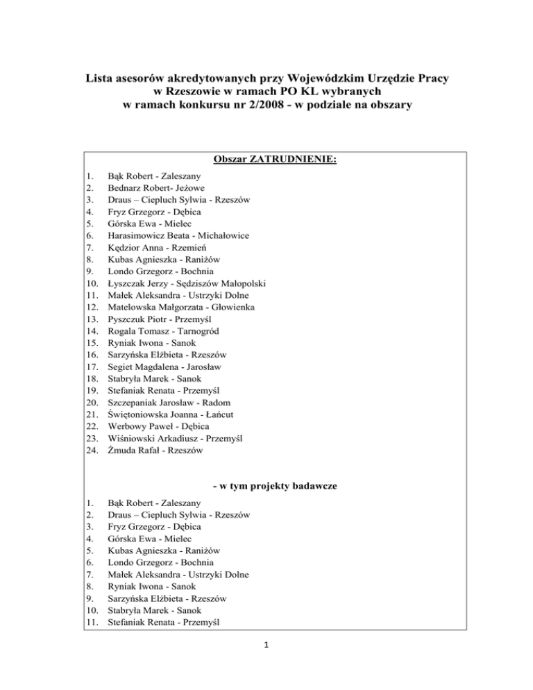 Lista asesorów akredytowanych przy Wojewódzkim Urzędzie Pracy w Rzeszowie w ramach PO KL wybranych w ramach konkursu nr 2/2008 - w podziale na obszary Obszar ZATRUDNIENIE: 1. 2. 3. 4. 5. 6. 7. 8. 9. 10. 11. 12. 13. 14. 15. 16. 17. 18. 19. 20. 21. 22. 23. 24. Bąk Robert - Zaleszany Bednarz Robert- Jeżowe Draus – Ciepluch Sylwia - Rzeszów Fryz Grzegorz - Dębica Górska Ewa - Mielec Harasimowicz Beata - Michałowice Kędzior Anna - Rzemień Kubas Agnieszka - Raniżów Londo Grzegorz - Bochnia Łyszczak Jerzy - Sędziszów Małopolski Małek Aleksandra - Ustrzyki Dolne Matelowska Małgorzata - Głowienka Pyszczuk Piotr - Przemyśl Rogala Tomasz - Tarnogród Ryniak Iwona - Sanok Sarzyńska Elżbieta - Rzeszów Segiet Magdalena - Jarosław Stabryła Marek - Sanok Stefaniak Renata - Przemyśl Szczepaniak Jarosław - Radom Świętoniowska Joanna - Łańcut Werbowy Paweł - Dębica Wiśniowski Arkadiusz - Przemyśl Żmuda Rafał - Rzeszów - w tym projekty badawcze 1. 2. 3. 4. 5. 6. 7. 8. 9. 10. 11. Bąk Robert - Zaleszany Draus – Ciepluch Sylwia - Rzeszów Fryz Grzegorz - Dębica Górska Ewa - Mielec Kubas Agnieszka - Raniżów Londo Grzegorz - Bochnia Małek Aleksandra - Ustrzyki Dolne Ryniak Iwona - Sanok Sarzyńska Elżbieta - Rzeszów Stabryła Marek - Sanok Stefaniak Renata - Przemyśl 1 12. Szczepaniak Jarosław - Radom 13. Werbowy Paweł - Dębica - w tym inicjatywy na obszarach wiejskich 1. 2. 3. 4. 5. 6. 7. 8. 9. 10. 11. 12. 13. 14. 15. 16. 17. 18. 19. Bąk Robert - Zaleszany Draus – Ciepluch Sylwia - Rzeszów Fryz Grzegorz - Dębica Górska Ewa - Mielec Kubas Agnieszka - Raniżów Londo Grzegorz - Bochnia Małek Aleksandra - Ustrzyki Dolne Ryniak Iwona - Sanok Stabryła Marek - Sanok Stefaniak Renata - Przemyśl Szczepaniak Jarosław - Radom Werbowy Paweł - Dębica Bednarz Robert- Jeżowe Kędzior Anna - Rzemień Łyszczak Jerzy - Sędziszów Małopolski Matelowska Małgorzata - Głowienka Pyszczuk Piotr - Przemyśl Rogala Tomasz - Tarnogród Wiśniowski Arkadiusz - Przemyśl Obszar EDUKACJA: 1. 2. 3. 4. 5. 6. 7. 8. 9. 10. 11. 12. 13. 14. 15. 16. 17. 18. Bąk Robert - Zaleszany Draus – Ciepluch Sylwia - Rzeszów Kubas Agnieszka - Raniżów Londo Grzegorz - Bochnia Ryniak Iwona - Sanok Stabryła Marek - Sanok Stefaniak Renata - Przemyśl Szczepaniak Jarosław - Radom Werbowy Paweł - Dębica Bednarz Robert- Jeżowe Kędzior Anna - Rzemień Rogala Tomasz - Tarnogród Wiśniowski Arkadiusz - Przemyśl Sarzyńska Elżbietał - Rzeszów Segiet Magdalena - Jarosław Świętoniowska Joanna - Łańcut Barnaś Mariusz - Mielec Bednarz Marcin - Krosno 2 19. 20. 21. 22. 23. 24. Bieniasz Bogusław - Rzeszów Dyrda Andrzej - Łańcut Kuta – Pałach Małgorzata - Wola Rzędzińska Nowakowski Grzegorz - Rzeszów Słowikowska – Krawiec Agata - Wierzchosławice Warchał Barbara - Przemyśl - w tym projekty badawcze 1. 2. 3. 4. 5. 6. 7. 8. 9. 10. 11. 12. 13. Bąk Robert - Zaleszany Kubas Agnieszka - Raniżów Londo Grzegorz - Bochnia Ryniak Iwona - Sanok Stabryła Marek - Sanok Stefaniak Renata - Przemyśl Szczepaniak Jarosław - Radom Werbowy Paweł - Dębica Kędzior Anna - Rzemień Świętoniowska Joanna - Łańcut Dyrda Andrzej - Łańcut Kuta – Pałach Małgorzata - Wola Rzędzińska Słowikowska – Krawiec Agata - Wierzchosławice - w tym inicjatywy na obszarach wiejskich 1. 2. 3. 4. 5. 6. 7. 8. 9. 10. 11. 12. 13. 14. 15. 16. 17. Bąk Robert - Zaleszany Kubas Agnieszka - Raniżów Londo Grzegorz - Bochnia Ryniak Iwona - Sanok Stabryła Marek - Sanok Stefaniak Renata - Przemyśl Szczepaniak Jarosław - Radom Werbowy Paweł - Dębica Kędzior Anna - Rzemień Dyrda Andrzej - Łańcut Kuta – Pałach Małgorzata - Wola Rzędzińska Słowikowska – Krawiec Agata Bednarz Robert- Jeżowe Rogala Tomasz - Tarnogród Wiśniowski Arkadiusz - Przemyśl Barnaś Mariusz - Mielec Warchał Barbara - Przemyśl 3 Obszar INTEGRACJA SPOŁECZNA: 1. 2. 3. 4. 5. 6. 7. 8. 9. 10. 11. 12. 13. 14. Bąk Robert - Zaleszany Londo Grzegorz - Bochnia Stefaniak Renata - Przemyśl Słowikowska – Krawiec Agata - Wierzchosławice Wiśniowski Arkadiusz - Przemyśl Barnaś Mariusz - Mielec Warchał Barbara - Przemyśl Świętoniowska Joanna - Łańcut Draus – Ciepluch Sylwia - Rzeszów Segiet Magdalena - Jarosław Nowakowski Grzegorz - Rzeszów Małek Aleksandra - Ustrzyki Dolne Gębarowski Bartłomiej - Rzeszów Krupa Piotr - Rzeszów - w tym projekty badawcze 1. 2. 3. 4. 5. 6. 7. 8. Bąk Robert - Zaleszany Stefaniak Renata - Przemyśl Słowikowska – Krawiec Agata Świętoniowska Joanna - Łańcut Draus – Ciepluch Sylwia - Rzeszów Małek Aleksandra - Ustrzyki Dolne Gębarowski Bartłomiej - Rzeszów Krupa Piotr - Rzeszów - w tym inicjatywy na obszarach wiejskich 1. 2. 3. 4. 5. 6. 7. 8. 9. 10. Bąk Robert - Zaleszany Stefaniak Renata - Przemyśl Słowikowska – Krawiec Agata - Wierzchosławice Draus – Ciepluch Sylwia - Rzeszów Małek Aleksandra - Ustrzyki Dolne Gębarowski Bartłomiej - Rzeszów Londo Grzegorz - Bochnia Wiśniowski Arkadiusz - Przemyśl Barnaś Mariusz - Mielec Warchał Barbara - Przemyśl 4 Obszar ADAPTACYJNOŚĆ PRACOWNIKÓW I PRZEDSIĘBIORSTW 1. 2. 3. 4. 5. 6. 7. 8. 9. 10. 11. 12. 13. 14. 15. 16. 17. 18. Stefaniak Renata - Przemyśl Draus – Ciepluch Sylwia - Rzeszów Londo Grzegorz - Bochnia Barnaś Mariusz - Mielec Świętoniowska Joanna - Łańcut Segiet Magdalena - Jarosław Nowakowski Grzegorz - Rzeszów Kubas Agnieszka - Raniżów Stabryła Marek - Sanok Werbowy Paweł - Dębica Kuta – Pałach Małgorzata - Wola Rzędzińska Bednarz Robert - Jeżowe Sarzyńska Elżbieta - Rzeszów Górska Ewa - Mielec Pyszczuk Piotr - Przemyśl Żmuda Rafał - Rzeszów Dąbrowska Monika - Wiązownica Młynarczyk Zofia Barbara - Rzeszów - w tym projekty badawcze 1. 2. 3. 4. 5. 6. 7. Stefaniak Renata - Przemyśl Draus – Ciepluch Sylwia - Rzeszów Kubas Agnieszka - Raniżów Stabryła Marek - Sanok Kuta – Pałach Małgorzata - Wola Rzędzińska Górska Ewa - Mielec Dąbrowska Monika