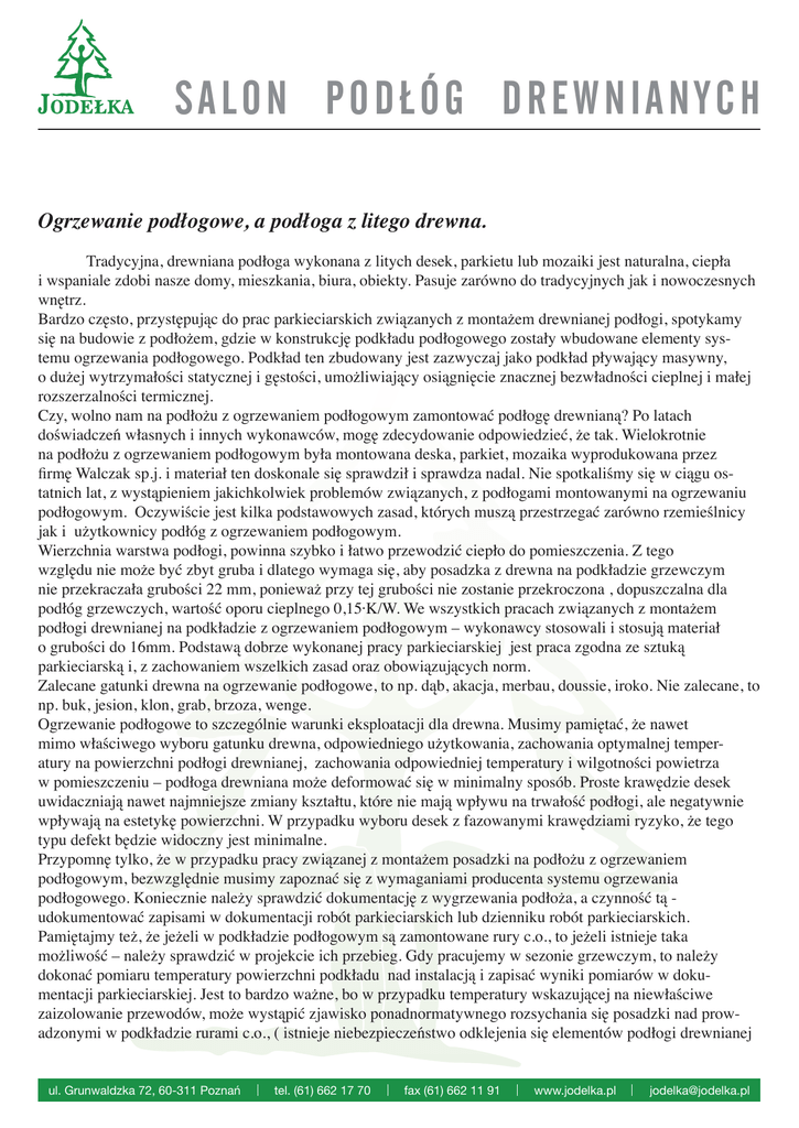 salon podłóg drewnianych Ogrzewanie podłogowe, a podłoga z litego drewna. Tradycyjna, drewniana podłoga wykonana z litych desek, parkietu lub mozaiki jest naturalna, ciepła i wspaniale zdobi nasze domy, mieszkania, biura, obiekty. Pasuje zarówno do tradycyjnych jak i nowoczesnych wnętrz. Bardzo często, przystępując do prac parkieciarskich związanych z montażem drewnianej podłogi, spotykamy się na budowie z podłożem, gdzie w konstrukcję podkładu podłogowego zostały wbudowane elementy systemu ogrzewania podłogowego. Podkład ten zbudowany jest zazwyczaj jako podkład pływający masywny, o dużej wytrzymałości statycznej i gęstości, umożliwiający osiągnięcie znacznej bezwładności cieplnej i małej rozszerzalności termicznej. Czy, wolno nam na podłożu z ogrzewaniem podłogowym zamontować podłogę drewnianą? Po latach doświadczeń własnych i innych wykonawców, mogę zdecydowanie odpowiedzieć, że tak. Wielokrotnie na podłożu z ogrzewaniem podłogowym była montowana deska, parkiet, mozaika wyprodukowana przez firmę Walczak sp.j. i materiał ten doskonale się sprawdził i sprawdza nadal. Nie spotkaliśmy się w ciągu ostatnich lat, z wystąpieniem jakichkolwiek problemów związanych, z podłogami montowanymi na ogrzewaniu podłogowym. Oczywiście jest kilka podstawowych zasad, których muszą przestrzegać zarówno rzemieślnicy jak i użytkownicy podłóg z ogrzewaniem podłogowym. Wierzchnia warstwa podłogi, powinna szybko i łatwo przewodzić ciepło do pomieszczenia. Z tego względu nie może być zbyt gruba i dlatego wymaga się, aby posadzka z drewna na podkładzie grzewczym nie przekraczała grubości 22 mm, ponieważ przy tej grubości nie zostanie przekroczona , dopuszczalna dla podłóg grzewczych, wartość oporu cieplnego 0,15·K/W. We wszystkich pracach związanych z montażem podłogi drewnianej na podkładzie z ogrzewaniem podłogowym – wykonawcy stosowali i stosują materiał o grubości do 16mm. Podstawą dobrze wykonanej pracy parkieciarskiej jest praca zgodna ze sztuką parkieciarską i, z zachowaniem wszelkich zasad oraz obowiązujących norm. Zalecane gatunki drewna na ogrzewanie podłogowe, to np. dąb, akacja, merbau, doussie, iroko. Nie zalecane, to np. buk, jesion, klon, grab, brzoza, wenge. Ogrzewanie podłogowe to szczególnie warunki eksploatacji dla drewna. Musimy pamiętać, że nawet mimo właściwego wyboru gatunku drewna, odpowiedniego użytkowania, zachowania optymalnej temperatury na powierzchni podłogi drewnianej, zachowania odpowiedniej temperatury i wilgotności powietrza w pomieszczeniu – podłoga drewniana może deformować się w minimalny sposób. Proste krawędzie desek uwidaczniają nawet najmniejsze zmiany kształtu, które nie mają wpływu na trwałość podłogi, ale negatywnie wpływają na estetykę powierzchni. W przypadku wyboru desek z fazowanymi krawędziami ryzyko, że tego typu defekt będzie widoczny jest minimalne. Przypomnę tylko, że w przypadku pracy związanej z montażem posadzki na podłożu z ogrzewaniem podłogowym, bezwzględnie musimy zapoznać się z wymaganiami producenta systemu ogrzewania podłogowego. Koniecznie należy sprawdzić dokumentację z wygrzewania podłoża, a czynność tą udokumentować zapisami w dokumentacji robót parkieciarskich lub dzienniku robót parkieciarskich. Pamiętajmy też, że jeżeli w podkładzie podłogowym są zamontowane rury c.o., to jeżeli istnieje taka możliwość – należy sprawdzić w projekcie ich przebieg. Gdy pracujemy w sezonie grzewczym, to należy dokonać pomiaru temperatury powierzchni podkładu nad instalacją i zapisać wyniki pomiarów w dokumentacji parkieciarskiej. Jest to bardzo ważne, bo w przypadku temperatury wskazującej na niewłaściwe zaizolowanie przewodów, może wystąpić zjawisko ponadnormatywnego rozsychania się posadzki nad prowadzonymi w podkładzie rurami c.o., ( istnieje niebezpieczeństwo odklejenia się elementów podłogi drewnianej ul. Grunwaldzka 72, 60-311 Poznań tel. (61) 662 17 70 fax (61) 662 11 91 www.jodelka.pl [email protected] salon podłóg drewnianych od podkładu ). Gdy nasze pomiary wskażą na niewłaściwe zaizolowanie przewodów, konieczne jest pisemne powiadomienie inwestora o tym fakcie, w celu uzyskania jego stanowiska do dalszych prac. W przypadku, gdy stwierdzimy, np. na podstawie projektu, że w wylewce przebiegają instalacje z wodą, należy uprzedzić inwestora o możliwości wystąpienia zjawiska kondensacji pary wodnej w podkładzie. Zjawisko to może spowodować tzw. „łódkowanie” posadzki w przypadku, gdy rury będą niedostatecznie zaizolowane. Profesjonalnie zamontowana podłoga drewniana na podłożu z ogrzewaniem podłogowym będzie nam służyć przez wiele lat. Aby jednak tak było, pamiętajmy by podłoże było właściwie wygrzane, używajmy klejów o małej zawartości rozpuszczalników i, że temperatura powierzchni podłogi w trakcie użytkowania przez inwestora nie może przekraczać 26°C. ul. Grunwaldzka 72, 60-311 Poznań tel. (61) 662 17 70 Z pozdrowieniami Mistrz parkieciarstwa Agnieszka Adamczak fax (61) 662 11 91 www.jodelka.pl [email protected]