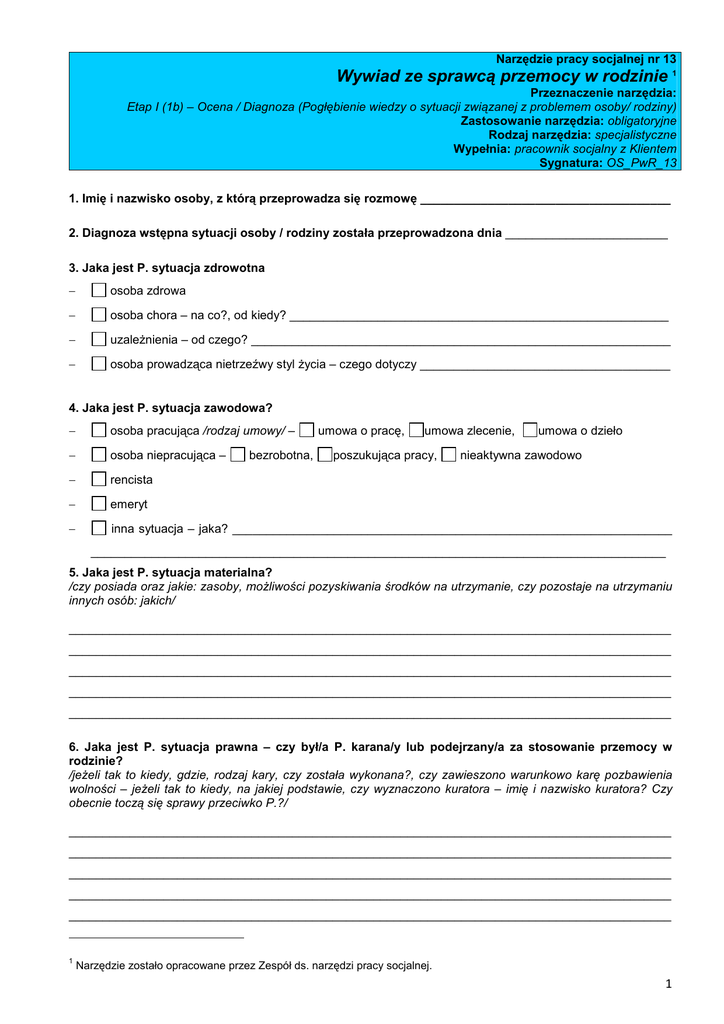 Narzędzie pracy socjalnej nr 13 Wywiad ze sprawcą przemocy w rodzinie 1 Przeznaczenie narzędzia: Etap I (1b) – Ocena / Diagnoza (Pogłębienie wiedzy o sytuacji związanej z problemem osoby/ rodziny) Zastosowanie narzędzia: obligatoryjne Rodzaj narzędzia: specjalistyczne Wypełnia: pracownik socjalny z Klientem Sygnatura: OS_PwR_13 1. Imię i nazwisko osoby, z którą przeprowadza się rozmowę _____________________________________ 2. Diagnoza wstępna sytuacji osoby / rodziny została przeprowadzona dnia ________________________ 3. Jaka jest P. sytuacja zdrowotna − osoba zdrowa − osoba chora – na co?, od kiedy? ________________________________________________________ − uzależnienia – od czego? ______________________________________________________________ − osoba prowadząca nietrzeźwy styl życia – czego dotyczy _____________________________________ 4. Jaka jest P. sytuacja zawodowa? − osoba pracująca /rodzaj umowy/ – − osoba niepracująca – − rencista − emeryt − inna sytuacja – jaka? _________________________________________________________________ bezrobotna, umowa o pracę, umowa zlecenie, poszukująca pracy, umowa o dzieło nieaktywna zawodowo _____________________________________________________________________________________ 5. Jaka jest P. sytuacja materialna? /czy posiada oraz jakie: zasoby, możliwości pozyskiwania środków na utrzymanie, czy pozostaje na utrzymaniu innych osób: jakich/ _________________________________________________________________________________________ _________________________________________________________________________________________ _________________________________________________________________________________________ _________________________________________________________________________________________ _________________________________________________________________________________________ 6. Jaka jest P. sytuacja prawna – czy był/a P. karana/y lub podejrzany/a za stosowanie przemocy w rodzinie? /jeżeli tak to kiedy, gdzie, rodzaj kary, czy została wykonana?, czy zawieszono warunkowo karę pozbawienia wolności – jeżeli tak to kiedy, na jakiej podstawie, czy wyznaczono kuratora – imię i nazwisko kuratora? Czy obecnie toczą się sprawy przeciwko P.?/ _________________________________________________________________________________________ _________________________________________________________________________________________ _________________________________________________________________________________________ _________________________________________________________________________________________ _________________________________________________________________________________________ 1 Narzędzie zostało opracowane przez Zespół ds. narzędzi pracy socjalnej. 1 7. Co dla P. znaczy przemoc w rodzinie? /proszę uwzględnić czym jest przemoc w rodzinie dla osoby ją stosującej i jak ona ją rozumie/ _________________________________________________________________________________________ _________________________________________________________________________________________ _________________________________________________________________________________________ _________________________________________________________________________________________ _________________________________________________________________________________________ _________________________________________________________________________________________ 8. Czy wie P. jakie są konsekwencje karne dla osoby stosującej przemoc w rodzinie? /jeżeli nie to należy zapoznać osobę stosującą przemoc w rodzinie z konsekwencjami jej stosowania/ _________________________________________________________________________________________ _________________________________________________________________________________________ _________________________________________________________________________________________ _________________________________________________________________________________________ _________________________________________________________________________________________ _________________________________________________________________________________________ 9. Kiedy i w jakich okolicznościach stosuje P. przemoc w rodzinie i wobec kogo? /proszę uwzględnić możliwie najszerzej opis okoliczności wskazanych przez sprawcę przemocy w rodzinie/ _________________________________________________________________________________________ _________________________________________________________________________________________ _________________________________________________________________________________________ _________________________________________________________________________________________ _________________________________________________________________________________________ _________________________________________________________________________________________ 10. Czy chce P. zaprzestać stosowania przemocy w rodzinie, jeżeli tak to czy podejmował/a P. próby rozwiązania tego problemu i z jakim skutkiem? /proszę uwzględnić wszystkie możliwe okoliczności związane z postrzeganiem zaprzestania stosowania przemocy rodzinie i wszystkimi działaniami podjętymi w tym zakresie/ _________________________________________________________________________________________ _________________________________________________________________________________________ _________________________________________________________________________________________ _________________________________________________________________________________________ _________________________________________________________________________________________ _________________________________________________________________________________________ 11. Jakiej pomocy i od kogo oczekiwałby/aby P. aby zaprzestać stosowania przemocy w rodzinie? /proszę uwzględnić wszystkie oczekiwania dotyczące możliwej pomocy w
