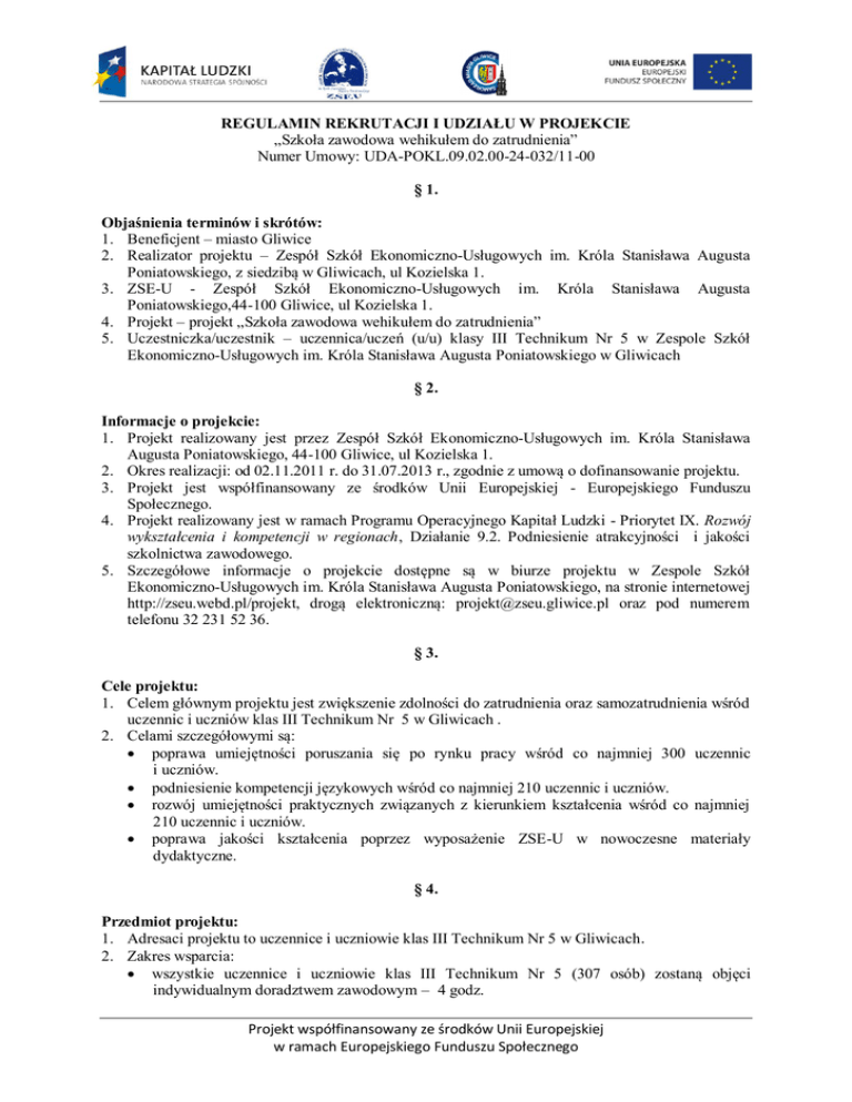 REGULAMIN REKRUTACJI I UDZIAŁU W PROJEKCIE „Szkoła zawodowa wehikułem do zatrudnienia” Numer Umowy: UDA-POKL.09.02.00-24-032/11-00 § 1. Objaśnienia terminów i skrótów: 1. Beneficjent – miasto Gliwice 2. Realizator projektu – Zespół Szkół Ekonomiczno-Usługowych im. Króla Stanisława Augusta Poniatowskiego, z siedzibą w Gliwicach, ul Kozielska 1. 3. ZSE-U - Zespół Szkół Ekonomiczno-Usługowych im. Króla Stanisława Augusta Poniatowskiego,44-100 Gliwice, ul Kozielska 1. 4. Projekt – projekt „Szkoła zawodowa wehikułem do zatrudnienia” 5. Uczestniczka/uczestnik – uczennica/uczeń (u/u) klasy III Technikum Nr 5 w Zespole Szkół Ekonomiczno-Usługowych im. Króla Stanisława Augusta Poniatowskiego w Gliwicach § 2. Informacje o projekcie: 1. Projekt realizowany jest przez Zespół Szkół Ekonomiczno-Usługowych im. Króla Stanisława Augusta Poniatowskiego, 44-100 Gliwice, ul Kozielska 1. 2. Okres realizacji: od 02.11.2011 r. do 31.07.2013 r., zgodnie z umową o dofinansowanie projektu. 3. Projekt jest współfinansowany ze środków Unii Europejskiej - Europejskiego Funduszu Społecznego. 4. Projekt realizowany jest w ramach Programu Operacyjnego Kapitał Ludzki - Priorytet IX. Rozwój wykształcenia i kompetencji w regionach, Działanie 9.2. Podniesienie atrakcyjności i jakości szkolnictwa zawodowego. 5. Szczegółowe informacje o projekcie dostępne są w biurze projektu w Zespole Szkół Ekonomiczno-Usługowych im. Króla Stanisława Augusta Poniatowskiego, na stronie internetowej http://zseu.webd.pl/projekt, drogą elektroniczną: [email protected] oraz pod numerem telefonu 32 231 52 36. § 3. Cele projektu: 1. Celem głównym projektu jest zwiększenie zdolności do zatrudnienia oraz samozatrudnienia wśród uczennic i uczniów klas III Technikum Nr 5 w Gliwicach . 2. Celami szczegółowymi są: poprawa umiejętności poruszania się po rynku pracy wśród co najmniej 300 uczennic i uczniów. podniesienie kompetencji językowych wśród co najmniej 210 uczennic i uczniów. rozwój umiejętności praktycznych związanych z kierunkiem kształcenia wśród co najmniej 210 uczennic i uczniów. poprawa jakości kształcenia poprzez wyposażenie ZSE-U w nowoczesne materiały dydaktyczne. § 4. Przedmiot projektu: 1. Adresaci projektu to uczennice i uczniowie klas III Technikum Nr 5 w Gliwicach. 2. Zakres wsparcia: wszystkie uczennice i uczniowie klas III Technikum Nr 5 (307 osób) zostaną objęci indywidualnym doradztwem zawodowym – 4 godz. Projekt współfinansowany ze środków Unii Europejskiej w ramach Europejskiego Funduszu Społecznego zakwalifikowane uczennice i uczniowie (220 osób) odbędą staże u pracodawców z którymi ZSE-U współpracuje – 30 godz. zakwalifikowane uczennice i uczniowie (220 osób) wezmą udział w kursie języka obcego zawodowego (do wyboru: język angielski, język niemiecki, język francuski) każdy z uczestników i uczestniczek projektu (220 osób), po konsultacji z doradcą zawodowym, skierowany zostanie na 1 dodatkowy kurs, rozwijający umiejętności społeczne i/lub zawodowe. 3. W ramach projektu przeprowadzone zostaną następujące kursy: a) Kurs barmański I stopnia (4 gr. x 10 os x 30h) b) Kurs baristy (4 gr. x 10 os x 22h) c) Kurs someliera (2 gr. x 10 os x 22h) d) Kurs księgowości dla MŚP (2 gr. x 10 os x 40h) e) Kurs carvingu (4 gr. x 10 os x 12h) f) Kurs kompleksowa obsługa grup konferencyjnych i turystycznych (2 gr. x 10 os x 20h) g) Kurs komputerowy "Skuteczna reklama firmy z wykorzystaniem technologii informacyjnej" (2 gr. x 10 os. X 30h) h) Warsztaty kreowania wizerunku (2 gr. x 10 os x 10h) Kursy realizowane będą na terenie ZSE-U. 4. Kursy kwalifikacyjne wymienione w pkt.: 3a), 3b), 3c), 3d) prowadzone będą przez firmy szkoleniowe posiadające certyfikaty uprawniające do organizacji kursów i egzaminów zgodnie z tematyką szkolenia. Po ich zakończeniu uczennica/uczeń otrzymają certyfikat potwierdzający zdobyte umiejętności. Pozostałe szkolenia zawodowe prowadzone będą przez wykwalifikowanych wykładowców. Po ich zakończeniu uczennica/uczeń otrzymają zaświadczenie potwierdzające udział w szkoleniu. 5. Udział uczestników/czek w projekcie jest bezpłatny. § 5. Kryteria naboru: Uczestnikiem/uczestniczką Projektu może być osoba, która spełnia łącznie niżej wymagane warunki formalne: a) jest uczniem/uczennicą klasy III Technikum Nr 5 w Zespole Szkół Ekonomiczno-Usługowym w Gliwicach, b) jest zameldowana na terenie województwa śląskiego, c) wyraża dobrowolną chęć udziału we wszystkich formach wsparcia projektu (indywidualne konsultacje z doradcą zawodowym, udział w stażu, udział w kursie języka obcego zawodowego, udział w jednym z kursów zawodowych) poprzez złożenie deklaracji. d) w wyznaczonym terminie zgłosi się na konsultacje z doradcą zawodowym. § 6. Kryteria rekrutacji: udział w konsultacjach z doradcą zawodowym, w wyznaczonych terminach, w tym w soboty, wyniki w nauce (trudności, jakie mają u/u), predyspozycje zawodowe (oczekiwania zawodowe i możliwości ich realizacji), zainteresowanie nabyciem nowych, uzupełnianiem, podwyższaniem kwalifikacji i umiejętności poza godzinami zajęć lekcyjnych, w tym w soboty. Projekt współfinansowany ze środków Unii Europejskiej w ramach Europejskiego Funduszu Społecznego Ogłoszenie o rozpoczęciu rekrutacji - zapisach na konsultacje u doradcy zawodowego zamieszczone zostanie na stronie internetowej projektu, tablicy ogłoszeniowej w szkole, o rekrutacji poinformowani zostaną uczniowie klas biorących udział w projekcie. Rekrutacja poprzedzona będzie akcją promocyjno-informacyjną polegającą na rozprowadzeniu ulotek wśród uczniów klas III Technikum Nr 5 w ZSE-U oraz umieszczenie informacji o projekcie na stronie internetowej projektu i tablicy ogłoszeniowej w szkole. Uczennica/uczeń przystępujący do rekrutacji wypełnia kartę zgłoszeniową (załącznik nr 1). Uczennica/ucze