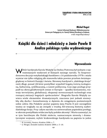 2010, nr 2 (5) Michał Rogoż Instytut Informacji Naukowej i Bibliotekoznawstwa Uniwersytet Pedagogiczny im. Komisji Edukacji Narodowej w Krakowie e-mail: [email protected] Książki dla dzieci i młodzieży o Janie Pawle II Wprowadzenie U ni w er sy te tu M ik oł aj a Ko pe rn ik a Analiza polskiego rynku wydawniczego w e W © C op yr ig ht by W yd aw ni ct w o N au ko ybór kardynała Karola Wojtyły na Stolicę Piotrową był jednym z najważniejszych wydarzeń w dziejach naszego narodu. Ta bezprecedensowa decyzja watykańskiego konklawe z 16 października 1978 r. miała wymiar nie tylko religijny, ale stanowiła także pewien przełom światopoglądowy w historii Europy i świata. Skromny kardynał z „dalekiego kraju” swój długi, ponad 26-letni pontyfikat wypełnił bogatą treścią teologiczną, kulturową, cywilizacyjną, a nawet polityczną. Czas jego posługi przypadł na okres gwałtownych zmian w Europie − upadku komunizmu, rozwoju terroryzmu, globalizacji, ekspansji nowoczesnych technologii oraz rosnącej ateizacji bogatych społeczeństw1. Biografia Karola Wojtyły zawiera wiele elementów dramatycznych, znaczona jest jednak niezwykłą siłą ducha i konsekwencją w dążeniu do osiągnięcia postawionych sobie celów. Dla Polaków postać papieża Jana Pawła II jest szczególnie ważna ze względu na jej związki z trudną XX-wieczną historią nadwiślańskiego kraju. Przy całym nacisku na uniwersalizm papieskiej posługi, w okresie pontyfikatu widoczne były polskie akcenty2. Warto zauważyć, że w tym burzliwym dla Polski stuleciu, naznaczonym niewolą i dramatycznymi wojnami, wybór krakowskiego kardynała na papieża to jeden 1 2 B. Lecomte, Pasterz, Kraków 2006, s. 7. G. Weigel, Świadek nadziei, Kraków 2000, s. 5−10. 32 Michał Rogoż © C op yr ig ht by W yd aw ni ct w o N au ko w e U ni w er sy te tu M ik oł aj a Ko pe rn ik a z nielicznych faktów pozytywnych. Od samego początku szczególne relacje łączyły go z ludźmi młodymi. Były one zauważalne zarówno w kazaniach wygłaszanych do młodego pokolenia, luźnych „pogadankach”, m.in. ze słynnego krakowskiego okna, jak i w świadectwach bezpośredniego z nim kontaktu. Szczerość i bliskość, niekonwencjonalność zachowań oraz młodzieńcza żywotność stanowiły charakterystyczne rysy papieża Polaka. Nic więc dziwnego, że był on postacią budzącą zainteresowanie młodych ludzi, umiejącą rozmawiać z nimi nie tylko o rzeczach codziennych i błahych, ale też o ważnych problemach życiowych. Wymiar tej akceptacji mieści się w spontanicznym określeniu „pokolenie JP II”3. W biografii Karola Wojtyły istnieje zatem wiele różnorodnych aspektów czyniących ją atrakcyjnym tematem książek przeznaczonych dla dzieci i młodzieży. Niewątpliwie ma ona wymiar dydaktyczny, obecne są w niej elementy patriotyczne i uniwersalne wzorce ideowe, a nawet wątki humorystyczne i sensacyjne. Tak więc zasadne wydaje się postawienie pytania o obecność na polskim rynku wydawniczym książek przeznaczonych dla dzieci i młodzieży, które przedstawiają postać Jana Pawła II. Z przeprowadzonych badań wyłączono adresowane do dzieci i młodzieży wypowiedzi samego papieża. Warto tylko nadmienić, że ukazało się co najmniej kilkanaście takich pozycji, z których większość ma formę antologii4. Korzystanie z bogatej spuścizny piśmienniczej Karola Wojtyły jest oczywiście naturalnym i nader częstym zabiegiem w pracach innych autorów, poświęconych papieżowi i jego nauczaniu. Stąd również w analizowanym przez nas zbiorze pojawiają się fragmenty bezpośrednio zaczerpnięte z jego nauki5. Trzeba także nadmienić, że opisywane teksty dla dzieci i młodzieży stanowią stosunkowo niewielki odsetek ogółu produkcji wydawniczej poświęconej Janowi Pawłowi II6. 3 Por. Pokolenie JP II. Przeszłość i przyszłość zjawiska religijnego, pod red. T. Szawiela, Warszawa 2008; P. Zuchniewicz, Narodziny pokolenia JP 2, Warszawa 2007. 4 Na przykład Jan Paweł II do dzieci, wybór tekstów G. Grochowski, Sandomierz 2005; Jan Paweł II, List do dzieci, Warszawa 2007; Jan Paweł II − spotkania z dziećmi, wybór tekstów R. Bocian, Częstochowa 2007; Podręcznik pokolenia JP 2. Ojcowskie słowa do młodych świata, Polski i Lednicy, pod red. H. Koźmińskiej, Poznań 2008; Halo urwisy! Tu mówi Papież. Słowa Jana Pawła II do dzieci, oprac. D. Madejczyk, Kielce 2000; Wy jesteście nadzieją świata! Jan Paweł II do młodzieży, oprac. A. Wojciechowska, Kraków 2005. 5 E. Berndsen, Pieśń o chłopcu spod wadowickiego błękitu, Bielsko-Biała 2006, s. 30−31. 6 Por. J. Wolak, Tytuły, tematy, tendencje, [w:] K. Frołow, J. Wolak, Raport o książce katolickiej. Edycja 2007, Warszawa 2007, s. 12−13. 33 Książki dla dzieci i młodzieży o Janie Pawle II. Analiza polskiego rynku wydawniczego Chronologia i geografia wydawnicza W latach 1989−2009 na polskim rynku wydawniczym pojawiło się blisko 40 pozycji7 mieszczących się w interesującej nas kategorii, przy czym niektóre z nich miały więcej niż jedno wydanie. Uwagę zwraca charakterystyczna tendencja rynkowa, przejawiająca się w wyraźnym okolicznościowym wzroście publikacji oraz wznowień bezpośrednio po śmierci papieża w 2005 r.8 (zob. tab. 1). W tym wznowienia aj a Ko Liczba tytułów 3 1990−1996 − 1997 1 1998 2 1999 2 − 1 − 1 − 1 1 2 − au ko e U ni w er sy te tu M ik oł Do 1989 r. w Rok pe rn ik a Tabela 1. Książki o Janie Pawle II przeznaczone dla dzieci i młodzieży według lat wydania − w o N 2000 − aw ni ct 2001 ht by W yd 2002 © C op yr ig Pierwszorzędną rolę w obliczeniach statystycznych, jak również kategoryzacji poszczególnych tytułów odegrał dostępny w Internecie „Przewodnik Bibliograficzny. Urzędowy Wykaz Druków Wydanych w Rzeczypospolitej Polskiej” (http://www.bn.org.pl/ katalogi-i-bibliografie). Mając świadomość, że z uwagi na niewielką objęt