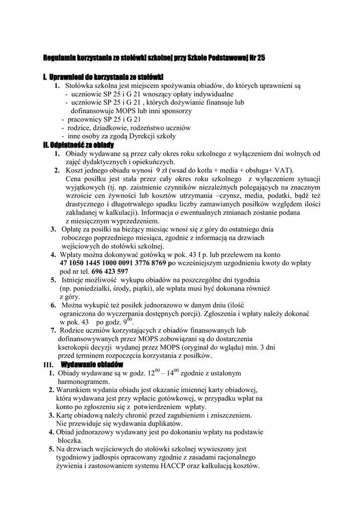 Regulamin korzystania ze stołówki szkolnej przy Szkole Podstawowej Nr 25 I. Uprawnieni do korzystania ze stołówki 1. Stołówka szkolna jest miejscem spożywania obiadów, do których uprawnieni są - uczniowie SP 25 i G 21 wnoszący opłaty indywidualne - uczniowie SP 25 i G 21 , których dożywianie finansuje lub dofinansowuje MOPS lub inni sponsorzy - pracownicy SP 25 i G 21 - rodzice, dziadkowie, rodzeństwo uczniów - inne osoby za zgodą Dyrekcji szkoły II. Odpłatność za obiady 1. Obiady wydawane są przez cały okres roku szkolnego z wyłączeniem dni wolnych od zajęć dydaktycznych i opiekuńczych. 2. Koszt jednego obiadu wynosi 9 zł (wsad do kotła + media + obsługa+ VAT). Cena posiłku jest stała przez cały okres roku szkolnego z wyłączeniem sytuacji wyjątkowych (tj. np. zaistnienie czynników niezależnych polegających na znacznym wzroście cen żywności lub kosztów utrzymania –czynsz, media, podatki, bądź też drastycznego i długotrwałego spadku liczby zamawianych posiłków względem ilości zakładanej w kalkulacji). Informacja o ewentualnych zmianach zostanie podana z miesięcznym wyprzedzeniem. 3. Opłatę za posiłki na bieżący miesiąc wnosi się z góry do ostatniego dnia roboczego poprzedniego miesiąca, zgodnie z informacją na drzwiach wejściowych do stołówki szkolnej. 4. Wpłaty można dokonywać gotówką w pok. 43 I p. lub przelewem na konto 47 1050 1445 1000 0091 3776 8769 po wcześniejszym uzgodnieniu kwoty do wpłaty pod nr tel. 696 423 597 5. Istnieje możliwość wykupu obiadów na poszczególne dni tygodnia (np. poniedziałki, środy, piątki), ale wpłata musi być dokonana również z góry. 6. Można wykupić też posiłek jednorazowo w danym dniu (ilość ograniczona do wyczerpania dostępnych porcji). Zgłoszenia i wpłaty należy dokonać w pok. 43 po godz. 900. 7. Rodzice uczniów korzystających z obiadów finansowanych lub dofinansowywanych przez MOPS zobowiązani są do dostarczenia kserokopii decyzji wydanej przez MOPS (oryginał do wglądu) min. 3 dni przed terminem rozpoczęcia korzystania z posiłków. III. Wydawanie obiadów 1. Obiady wydawane są w godz. 1200 – 1400 zgodnie z ustalonym harmonogramem. 2. Warunkiem wydania obiadu jest okazanie imiennej karty obiadowej, która wydawana jest przy wpłacie gotówkowej, w przypadku wpłat na konto po zgłoszeniu się z potwierdzeniem wpłaty. 3. Kartę obiadową należy chronić przed zagubieniem i zniszczeniem. Nie przewiduje się wydawania duplikatów. 4. Obiad jednorazowy wydawany jest po dokonaniu wpłaty na podstawie bloczka. 5. Na drzwiach wejściowych do stołówki szkolnej wywieszony jest tygodniowy jadłospis opracowany zgodnie z zasadami racjonalnego żywienia i zastosowaniem systemu HACCP oraz kalkulacją kosztów. IV. Odwoływanie obiadów, rozliczanie nieobecności, całkowita rezygnacja z obiadów 1. W przypadku nieplanowanej nieobecności dziecka na obiedzie (choroba, zdarzenie losowe) istnieje możliwość dokonania odpisu tzn. przeniesienia wpłaconej w danym miesiącu kwoty na poczet następnego miesiąca pod warunkiem dokonania zgłoszenia o nieobecności dziecka w pierwszym dniu nieobecności do godz. 830 pod nr tel. 696 423 597. 2. Planowane zmiany w podziale godzin (wyjścia do kina, teatru itp.) zgłaszają organizatorzy (wychowawcy) min. 2 dni robocze wcześniej. W takich przypadkach obiad może być wydany wcześniej lub później do godz. 1500 i nie ma możliwości odpisu. 3. Wycieczki całodniowe podlegają odpisowi w przypadku zgłoszenia min. 3 dni robocze wcześniej przez organizatora (wychowawcę). 4. W przypadkach losowych obiady mogą być odbierane na wynos, po wcześniejszym uzgodnieniu telefonicznym i zgłoszeniu się do kuchni z pojemnikami jednorazowymi posiadającym atest do kontaktu z żywnością. 5. W miesiącach grudniu i czerwcu z uwagi na koniec okresów rozliczeniowych odpisy nie będą przyjmowane. Wszelkie planowane nieobecności należy zgłosić dokonując wpłaty, w przypadku zdarzeń losowych obiad należy odebrać na wynos. 6. W przypadku całkowitej rezygnacji z obiadów fakt ten należy zgłosić min. 3 dni robocze wcześniej przed rozpoczęciem nowego miesiąca. V. Zasady zachowania w stołówce szkolnej 1. Uczniowie korzystający z obiadów przychodzą do stołówki bez odzieży wierzchniej, plecaki pozostawiają ułożone na krzesłach przy drzwiach wejściowych. 2. Podczas spożywania obiadu obowiązują zasady kulturalnego zachowania (nie należy prowadzić głośnych rozmów, biegać lub prezentować innych niestosownych zachowań). 3. Wszyscy korzystający z obiadów po spożytym posiłku odnoszą naczynia i sztućce w wyznaczone miejsce, zostawiają czyste miejsce na stoliku i pod nim, zasuwają krzesło. 4. Podczas wydawania obiadów w stołówce szkolnej przebywają wyłącznie uczniowie korzystający z obiadów. 5. Zabrania się wynoszenia ze stołówki naczyń, sztućców i innych elementów wyposażenia. 6. Nad bezpieczeństwem uczniów podczas spożywania obiadów czuwa dyżurujący nauczyciel (wyznaczony przez Dyrektora SP 25 i Dyrektora G 21). 7. Za straty materialne spowodowane przez ucznia w stołówce szkolnej wynikające ze świadomego i celowego działania odpowiadają jego rodzice lub opiekunowie prawni. 8. Rodzice uczniów proszeni są o nie wchodzenie do stołówki podczas wydawania obiadów. Dlaczego warto korzystać z obiadów w stołówce szkolnej? 1. Aby zapewnić dziecku prawidłowe wyżywienie niezbędne dla prawidłowego wzrostu i funkcjonowania organizmu. Dobrze odżywione szare komórki to lepsza koncentracja i lepsze wyniki w nauce. 2. Aby Twoje dziecko zawsze otrzymywało ciepły posiłek w porze obiadowej. 3. Aby dziecko uczyło się odpowiednich nawyków żywieniowych. Fast food nie może zastąpić pełnego dwudaniowego posiłku. 4. Aby umożliwić dziecku zjedzenie posiłku z zachowaniem kultury jedzenia. Spożywanie kanapek w pośpiechu i w przypadkowych miejscach może do