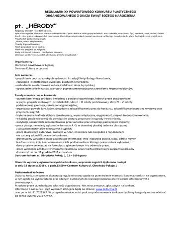 REGULAMIN XX POWIATOWEGO KONKURSU PLASTYCZNEGO ORGANIZOWANEGO Z OKAZJI ŚWIĄT BOŻEGO NARODZENIA pt. „HERODY” Kolędnicy z królem Herodem na czele. Była to duża grupa, złożona z kilkunastu kolędników. Oprócz króla w skład grupy wchodzili: marszałkowie, ułan Turek, Żyd, żołnierze, anioł, diabeł, śmierć. Szedł z nimi grajek – skrzypek lub harmonista. Chodzili po miasteczkach i wsiach w okresie od Bożego Narodzenia do Matki Boskiej Gromnicznej (2 luty). Przychodzili pod dom i śpiewali: „Wiwat, wiwat zaśpiewajmy, Chwałę Bogu oddawajmy. Niech gospodarz wesół będzie, Niech nas przyjmie po kolędzie. Kiedy król Herod królował i nad Żydami panował, Wtenczas się Chrystus narodził, aby ludzi z grzechu oswobodził.” Organizatorzy : Starostwo Powiatowe w Łęcznej Centrum Kultury w Łęcznej Cele konkursu: - przybliżanie poprzez sztukę obrzędowości i tradycji Świąt Bożego Narodzenia, - rozwijanie i kształtowanie wyobraźni plastycznej Herodami, - rozbudzanie zainteresowań kulturą i folklorem ziemi Łęczyńskiej, - upowszechnianie inicjatyw twórczych poprzez prezentację prac szerokiemu kręgowi odbiorców, Zasady uczestnictwa w konkursie: - uczestnikami mogą być dzieci i młodzież z powiatu łęczyńskiego, których prace będą oceniane w pięciu grupach wiekowych: przedszkolaki, klasy I – III szkoły podstawowej, klasy IV – VI szkoły podstawowej, gimnazja, szkoły ponadgimnazjalne, - organizator powoła Jury, które zdecyduje o zakwalifikowaniu prac do konkursu, zakwalifikowaniu prac na wystawę oraz przyznaniu nagród, - kryteria oceny: trafność doboru tematu pracy, wyraz artystyczny, oryginalność, stopień trudności wykonania, - w każdej grupie wiekowej dla zwycięzców zostaną przyznane 3 nagrody i wyróżnienia, - instytucje i nauczyciele reprezentowane przez autorów prac otrzymają pamiątkowe dyplomy, - prace plastyczne należy wykonać w formacie A -3, w dowolnej płaskiej technice plastycznej z wyjątkiem materiałów nietrwałych i sypkich, - prace zbiorowego autorstwa, zwinięte w rulon, zniszczone lub niezgodne z regulaminem nie zostaną zakwalifikowane do konkursu, - przyjmujemy wyłącznie prace zawierające informacje: imię i nazwisko autora, klasa, adres i numer telefonu szkoły, imię i nazwisko nauczyciela pod kierunkiem którego praca została wykonana, dane prosimy umieszczać na formularzu zgłoszeniowym i na odwrocie pracy, - prace wykonane zgodnie z wymogami regulaminu wraz z kartą zgłoszenia (w załączeniu) prosimy dostarczyć do dn. 18 grudnia 2015 r. na adres: Centrum Kultury, ul. Obrońców Pokoju 1, 21 – 010 Łęczna Otwarcie wystawy, ogłoszenie wyników konkursu, wręczenie nagród i dyplomów nastąpi w dniu 12 stycznia 2016 r. o godz.13.00 w Centrum Kultury ul. Obrońców Pokoju 1 Postanowieni końcowe Udział w konkursie oznacza akceptację regulaminu oraz zgodę na przeniesienie własności i praw autorskich na organizatora, w tym zgodę na wykorzystanie prac i danych osobowych do realizacji konkursu oraz w celach informacyjnych i promocyjnych. Przysłane prace przechodzą na własność organizatora. Nie zwracamy prac zgłoszonych na konkurs. Informacje o konkursie i jego wynikach dostępne będą na stronie: www.ck.leczna.pl oraz po nr tel. 81 7521547. W przypadku nieobecności podczas podsumowania konkursu dyplomy i nagrody można odebrać do końca stycznia 2016 r. w CK. KARTA ZGŁOSZENIA DO XX EDYCJI KONKURSU PLASTYCZNEGO ORGANIZOWANEGO Z OKAZJI ŚWIĄT BOŻEGO NARODZENIA Pt. „HERODY” Placówka delegująca (nazwa, adres, telefon) …………………………………………………………………………………………………… …………………………………………………………………………………………………………………………………………………………………………. Imię i nazwisko nauczyciela/instruktora………………………………………………………………………………………………………….. …………………………………………………………………………………………………………………………………………………………………………. Uwaga! Prosimy wypełniać czytelnie LP. Imię i nazwisko autora 1 2 3 4 5 6 7 8 9 10 Klasa i wiek Wyrażam zgodę na przetwarzanie przez Centrum Kultury w Łęcznej danych osobowych zawartych w zgłoszeniu do celów organizacji konkursu zgodnie z ustawą o ochronie danych osobowych z 29.08.1997 r. (Dz.u.2014poz.1182, z późniejszymi zmianami). Dn……………………… …………………………………………………………………. Czytelny podpis nauczyciela/instruktora pod kierunkiem którego wykonano pracę