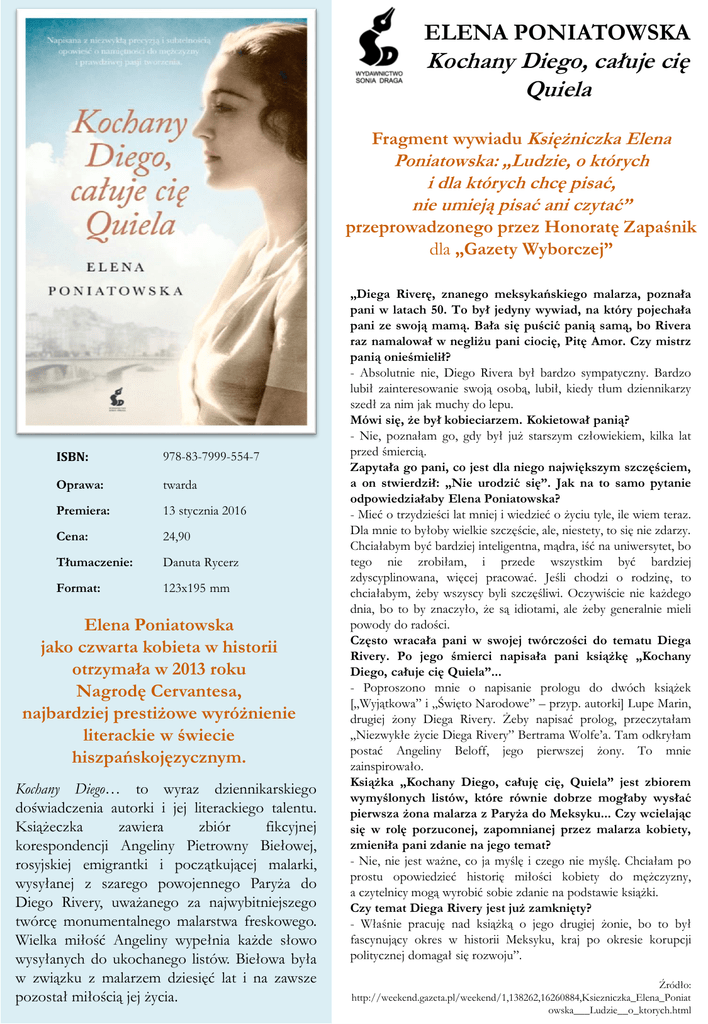 ELENA PONIATOWSKA Kochany Diego, całuje cię Quiela Fragment wywiadu Księżniczka Elena Poniatowska: „Ludzie, o których i dla których chcę pisać, nie umieją pisać ani czytać” przeprowadzonego przez Honoratę Zapaśnik dla „Gazety Wyborczej” ISBN: 978-83-7999-554-7 Oprawa: twarda Premiera: 13 stycznia 2016 Cena: 24,90 Tłumaczenie: Danuta Rycerz Format: 123x195 mm Elena Poniatowska jako czwarta kobieta w historii otrzymała w 2013 roku Nagrodę Cervantesa, najbardziej prestiżowe wyróżnienie literackie w świecie hiszpańskojęzycznym. Kochany Diego… to wyraz dziennikarskiego doświadczenia autorki i jej literackiego talentu. Książeczka zawiera zbiór fikcyjnej korespondencji Angeliny Pietrowny Biełowej, rosyjskiej emigrantki i początkującej malarki, wysyłanej z szarego powojennego Paryża do Diego Rivery, uważanego za najwybitniejszego twórcę monumentalnego malarstwa freskowego. Wielka miłość Angeliny wypełnia każde słowo wysyłanych do ukochanego listów. Biełowa była w związku z malarzem dziesięć lat i na zawsze pozostał miłością jej życia. „Diega Riverę, znanego meksykańskiego malarza, poznała pani w latach 50. To był jedyny wywiad, na który pojechała pani ze swoją mamą. Bała się puścić panią samą, bo Rivera raz namalował w negliżu pani ciocię, Pitę Amor. Czy mistrz panią onieśmielił? - Absolutnie nie, Diego Rivera był bardzo sympatyczny. Bardzo lubił zainteresowanie swoją osobą, lubił, kiedy tłum dziennikarzy szedł za nim jak muchy do lepu. Mówi się, że był kobieciarzem. Kokietował panią? - Nie, poznałam go, gdy był już starszym człowiekiem, kilka lat przed śmiercią. Zapytała go pani, co jest dla niego największym szczęściem, a on stwierdził: „Nie urodzić się”. Jak na to samo pytanie odpowiedziałaby Elena Poniatowska? - Mieć o trzydzieści lat mniej i wiedzieć o życiu tyle, ile wiem teraz. Dla mnie to byłoby wielkie szczęście, ale, niestety, to się nie zdarzy. Chciałabym być bardziej inteligentna, mądra, iść na uniwersytet, bo tego nie zrobiłam, i przede wszystkim być bardziej zdyscyplinowana, więcej pracować. Jeśli chodzi o rodzinę, to chciałabym, żeby wszyscy byli szczęśliwi. Oczywiście nie każdego dnia, bo to by znaczyło, że są idiotami, ale żeby generalnie mieli powody do radości. Często wracała pani w swojej twórczości do tematu Diega Rivery. Po jego śmierci napisała pani książkę „Kochany Diego, całuje cię Quiela”... - Poproszono mnie o napisanie prologu do dwóch książek [„Wyjątkowa” i „Święto Narodowe” – przyp. autorki] Lupe Marin, drugiej żony Diega Rivery. Żeby napisać prolog, przeczytałam „Niezwykłe życie Diega Rivery” Bertrama Wolfe’a. Tam odkryłam postać Angeliny Beloff, jego pierwszej żony. To mnie zainspirowało. Książka „Kochany Diego, całuję cię, Quiela” jest zbiorem wymyślonych listów, które równie dobrze mogłaby wysłać pierwsza żona malarza z Paryża do Meksyku... Czy wcielając się w rolę porzuconej, zapomnianej przez malarza kobiety, zmieniła pani zdanie na jego temat? - Nie, nie jest ważne, co ja myślę i czego nie myślę. Chciałam po prostu opowiedzieć historię miłości kobiety do mężczyzny, a czytelnicy mogą wyrobić sobie zdanie na podstawie książki. Czy temat Diega Rivery jest już zamknięty? - Właśnie pracuję nad książką o jego drugiej żonie, bo to był fascynujący okres w historii Meksyku, kraj po okresie korupcji politycznej domagał się rozwoju”. Źródło: http://weekend.gazeta.pl/weekend/1,138262,16260884,Ksiezniczka_Elena_Poniat owska___Ludzie__o_ktorych.html ELENA PONIATOWSKA Pisarka i dziennikarka. Urodziła się w Paryżu w 1932 roku jako córka Meksykanki i Francuza o polskich korzeniach, księcia Jeana E. Poniatowskiego. Jest laureatką wielu nagród, m. in. jako pierwsza kobieta otrzymała Premio Nacional de Periodismo, a w 2013 roku została uhonorowana najwyższym literackim wyróżnieniem w świecie hiszpańskojęzycznym, Nagrodą Cervantesa. Jest doktorem honoris causa wielu uczelni w Stanach Zjednoczonych i Europie. Elena Poniatowska jest autorką licznych powieści, które przetłumaczono na 20 języków, a także tomiku poezji i opowiadań dla dzieci. Na rynku polskim ukazała się powieść Do sępów pójdę. Wkrótce Wydawnictwo Sonia Draga opublikuje dwie kolejne. Obcojęzyczne okładki książki Recenzja Elżbiety Sadowskiej, zamieszczona w Tygodniku „TIM” (Tygodniowy Ilustrowany Magazyn) 3 kwietnia 1986 roku „Nazwisko Eleny Poniatowskiej brzmi co prawda swojsko, ale niewielu czytelników kojarzy je zapewne z literaturą meksykańską. W roku 1965 znana dziennikarka i pisarka odwiedziła Polskę w poszukiwaniu «korzeni», a w roku 1976 w serii «Prozy iberoamerykańskiej» WL zaprezentowano u nas jej pisarstwo po raz pierwszy. Była to powieść dokumentalna «Do sępów pójdę» […]. Pochodząca z roku 1978 książeczka «Kochany Diego, całuję cię Quiela» wyrasta także z doświadczeń dziennikarskich, ale tym razem fikcja bierze górę nad dokumentem. […] W interesującym posłowiu autorka przekładu Danuta Rycerz ukazuje fakty składające się na autentyczne dzieje romansu dwojga artystów i dramat opuszczonej Angeliny. Jest to bardzo cenne uzupełnienie tekstu Poniatowskiej, tekstu przesyconego poezją, subtelnością, kobiecą wrażliwością. Nie bez powodu jest dziś meksykańska pisarka jedną z najwybitniejszych przedstawicielek hispanoamerykańskiej literatury kobiecej, literatury, która dopiero od niedawna mówi o sprawach kobiet głosem ich samych, demistyfikując przy tym stereotypy kulturowe dominujące w Ameryce Łacińskiej. Postać Diego Rivery – mimo idealizującej pasji Angeliny – jawi się nam przede wszystkim jako archetyp latynoskiego macho, zwłaszcza w świetle informacji podanych w posłowiu. Warto zatem odczytać książkę Poniatowskiej także z tej perspektywy, jako zapis