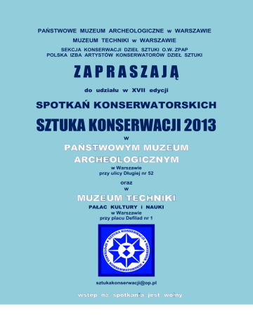 PAŃSTWOWE MUZEUM ARCHEOLOGICZNE w WARSZAWIE MUZEUM TECHNIKI w WARSZAWIE SEKCJA KONSERWACJI DZIEŁ SZTUKI O.W. ZPAP POLSKA IZBA ARTYSTÓW KONSERWATORÓW DZIEŁ SZTUKI ZAPRASZAJĄ do udziału w XVII edycji SPOTKAŃ KONSERWATORSKICH SZTUKA KONSERWACJI 2013 w PAŃSTWOWYM MUZEUM ARCHEOLOGICZNYM w Warszawie przy ulicy Długiej nr 52 oraz w MUZEUM TECHNIKI PAŁAC KULTURY i NAUKI w Warszawie przy placu Defilad nr 1 [email protected] wstęp na spotkania jest wolny SZTUKA KONSERWACJI 2013 4 KWIETNIA 2013 - CZWARTEK PAŃSTWOWE MUZEUM ARCHEOLOGICZNE w WARSZAWIE przy ulicy Długiej nr 52 ________________________________________________________________ 10:00 POWITANIE UCZESTNIKÓW I OTWARCIE SPOTKAŃ 10:30 Sławomir Safarzyński – GALVANO-AURUM Konserwacja zapobiegawcza elementów wystroju architektonicznego dekorowanego bursztynem 11:20 Rajmund Gazda – ZPAP Problemy ochrony zabytków egipskich Teb zachodnich z perspektywy lotu balonem 12:00 Rudolf Juszczyk – SOPRO Rewitalizacja i modernizacja powierzchni z kostki brukowej na staromiejskich placach i ciągach komunikacyjnych 12:30 Igor Pilutkiewicz – RHEINZINK Najnowsze technologie firmy RHEINZINK w konserwacji zabytków 13:00 Jacek Wieczorek – TEZANA Mikroczyszczarka IBIX w konserwacji zabytków i nie tylko 13:30 Janusz Mróz Żeliwna kaplica generała Andreja Kucyńskiego w Orle - zabytek kłopotliwy 14:00 Andrzej Dyga Korozja podpowłokowa żelaza na przykładzie zabytków archeologicznych - skutki - przyczyny - zapobieganie 14:30 Radomir Pałka – KABE KABE - najnowsza oferta farb dla konserwatorów zabytków 15:00 Andrzej Karolczak – KEIM Kolorystyka wschodniej fasady Zamku Królewskiego w Warszawie 15:30 Katarzyna Jakiel, Jerzy Ostapczuk Konserwacja zabytkowych obiektów wykonanych ze skór ze zbiorów Muzeum Podlaskiego w Białymstoku 16.00 ZAKOŃCZENIE PIERWSZEGO DNIA SPOTKAŃ KONSERWATORSKICH - SZTUKA KONSERWACJI 2013 warsztaty firmy PRECOPTIC – zastosowanie mikroskopów optycznych warsztaty firmy REMMERS – zastosowanie ARTE MUNDIT warsztaty firmy ROTHRONIC – zastosowanie mierników wilgotności warsztaty firmy TEZANA – używanie mikroczyszczarki IBIX SZTUKA KONSERWACJI 2013 5 KWIETNIA 2013 - PIĄTEK PAŃSTWOWE MUZEUM ARCHEOLOGICZNE w Warszawie przy ulicy Długiej nr 52 ________________________________________________________________ 10:00 OTWARCIE DRUGIEGO DNIA SESJI I WYSTAWY SZTUKA KONSERWACJI 2013 11:00 Ewa Maryniak-Piaszczyńska – STROTMANN UND PARTNERS Zastosowanie wapna hydratyzowanego w konserwacji zabytków według aktualnego stanu wiedzy 11:40 Jacek Olesiak – REMMERS Zastosowanie ARTE MUNDIT w konserwacji obiektów zabytkowych 12:40 Marta Maciąga Wyniki przeprowadzonych badań konserwatorskich w warszawskim kościele p.w. Niepokalanego Poczęcia NMP - Res Sacra Miser 13:10 Anna Suwała – ZPAP Elegant niekompletny - identyfikacja, konserwacja i rekonstrukcja międzywojennego portretu art déco 13:50 Bożena Boba-Dyga – ZPAP Konserwacje elewacji w stylu art déco 14:30 Przemysław Siwek, Paweł Brochocki – B & L INTERNATIONAL Produkty firmy ROTHRONIC w ochronie zabytków 15:00 Zbigniew Gil – CAPAROL POLSKA Produkty wapienne - tradycja i nowoczesność 15:30 Irena Rodzik Centralne Muzeum Morskie w Gdańsku - nowa pracownia konserwatorska … nowe możliwości … nowe problemy 16.00 ZAKOŃCZENIE DRUGIEGO DNIA SPOTKAŃ KONSERWATORSKICH - SZTUKA KONSERWACJI 2013 warsztaty firmy PRECOPTIC – zastosowanie mikroskopów optycznych warsztaty firmy REMMERS – zastosowanie ARTE MUNDIT warsztaty firmy ROTHRONIC – zastosowanie mierników wilgotności warsztaty firmy TEZANA – używanie mikroczyszczarki IBIX SZTUKA KONSERWACJI 2013 6 KWIETNIA 2013 - SOBOTA MUZEUM TECHNIKI Warszawa - Pałac Kultury i Nauki - Plac Defilad nr 1 ________________________________________________________________ 10:00 OTWARCIE TRZECIEGO DNIA SESJI - SZTUKA KONSERWACJI 2013 10:20 Ewa Maryniak-Piaszczyńska – STROTMANN UND PARTNERS Szerokie możliwości zastosowania nano-wapna w konserwacji zabytków 11:00 Magda Niewiadomska, Elżbieta Bogdanowicz – ZPAP Prezentacja fresku „Zwiastowanie” z XIV wieku z kościoła świętego Michała w Murato na Korsyce 11:30 Maria Pokorna-Paruszkiewicz Technika i technologia ikony rosyjskiej z warsztatu staroobrzędowców 12:00 Małgorzata Paździora-Sattler Przywrócenie barokowego wystroju malarskiego podczas kompleksowych prac konserwatorskich w kolegiacie pod wezwaniem Niepokalanego Poczęcia NMP i świętego Michała Archanioła w Łasku 12:40 Jan Zięba Panoramiczna dokumentacja kościoła świętych Piotra i Pawła we Lwowie oraz panoramy płaskiej bardzo dużych malowideł na przykładzie plafonu w Sali Książęcej w Lubiążu 13:20 Piotr Grzegorz Mądrach – ZPAP- PIAKDS Współczesna aranżacja muru rozstrzeliwań na przykładzie fragmentu elewacji Hali Mirowskiej w Warszawie 13:50 Monika Stachurska Problemy badawcze przy XVI-wiecznym hafcie reliefowym z preteksty ornatu ze Skarbca Jasnogórskiego 14:20 Joanna Lang Zamek w Broniszowie - 3 sezon prac - zakresy rekonstrukcji 14:50 Alicja Kuberska Problemy konserwacji zabytków drewnianych na wybranych przykładach 15:20 Szymon Jaraczewski Badania i konserwacje zabytków przy zastosowaniu maszyn specjalnych 15:50 ZAKOŃCZENIE SPOTKAŃ - SZTUKA KONSERWACJI 2013 Piotr Grzegorz Mądrach komisarz SZTUKI KONSERWACJI 2013 tel. 601 25 70 04 Władysław Weker kurator SZTUKI KONSERWACJI 2013 tel. 501 58 45 68
