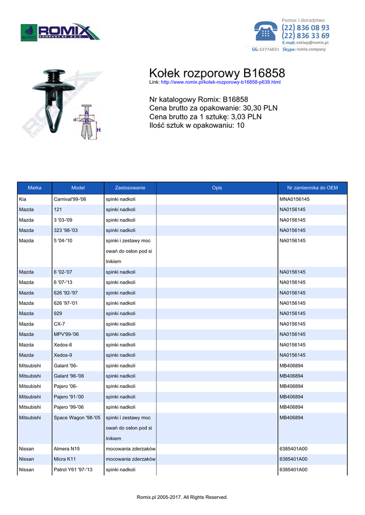 Kołek rozporowy B16858 Link: http://www.romix.pl/kolek-rozporowy-b16858-p639.html Nr katalogowy Romix: B16858 Cena brutto za opakowanie: 30,30 PLN Cena brutto za 1 sztukę: 3,03 PLN Ilość sztuk w opakowaniu: 10 Marka Model Zastosowanie Opis Nr zamiennika do OEM Kia Carnival'99-'06 spinki nadkoli MNA0156145 Mazda 121 spinki nadkoli NA0156145 Mazda 3 '03-'09 spinki nadkoli NA0156145 Mazda 323 '98-'03 spinki nadkoli NA0156145 Mazda 5 '04-'10 spinki i zestawy moc NA0156145 owań do osłon pod si lnikiem Mazda 6 '02-'07 spinki nadkoli NA0156145 Mazda 6 '07-'13 spinki nadkoli NA0156145 Mazda 626 '92-'97 spinki nadkoli NA0156145 Mazda 626 '97-'01 spinki nadkoli NA0156145 Mazda 929 spinki nadkoli NA0156145 Mazda CX-7 spinki nadkoli NA0156145 Mazda MPV'99-'06 spinki nadkoli NA0156145 Mazda Xedos-6 spinki nadkoli NA0156145 Mazda Xedos-9 spinki nadkoli NA0156145 Mitsubishi Galant '06- spinki nadkoli MB406894 Mitsubishi Galant '96-'06 spinki nadkoli MB406894 Mitsubishi Pajero '06- spinki nadkoli MB406894 Mitsubishi Pajero '91-'00 spinki nadkoli MB406894 Mitsubishi Pajero '99-'06 spinki nadkoli MB406894 Mitsubishi Space Wagon '98-'05 spinki i zestawy moc MB406894 owań do osłon pod si lnikiem Nissan Almera N15 mocowania zderzaków 6385401A00 Nissan Micra K11 mocowania zderzaków 6385401A00 Nissan Patrol Y61 '97-'13 spinki nadkoli 6385401A00 Romix.pl 2005-2017. All Rights Reserved. Nissan Primera P10 mocowania zderzaków 6385401A00 Nissan Primera P11 mocowania zderzaków 6385401A00 Nissan Primera P12 mocowania zderzaków 6385401A00 Nissan Sunny'95-'98 mocowania zderzaków 6385401A00 Romix.pl 2005-2017. All Rights Reserved.