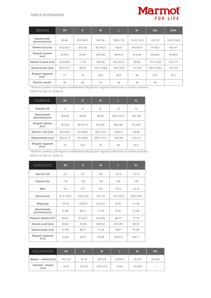 TABELE ROZMIARÓW MĘSKIE XS S M L XL XXL XXXL Obwód klatki piersiowej [cm] 84-89 91,5-96,5 99-104 106,5-112 114,5-119,5 122-127 129,5-134,5 Obwód szyi [cm] 34,5-35,5 36,5-38 39,5-40,5 42-43 44,5-45,5 47-48,5 49,5-51 Długość rękawa [cm] 76-78,5 81-84 86,5-89 89-91,5 91,5-94 94-96,5 94-96,5 Obwód w pasie [cm] 63,5-68,5 71-76 78,5-84 86,5-91,5 94-99 101,5-109 112-117 Obwód bioder [cm] 86,5-91,5 94-99 101,5-106,5 109-114,5 117-122 124,5-129,5 132-137 Długość nogawek [cm]* 71 75 78,5 82,5 84 87,5 87.5 Rozmiar spodni 28 30 32 34 36 38 --- *Niektóre spodnie są dostępne w dodatkowych długościach nogawek (informacje na stronie produktu) SHORT 30; REG 32; LONG 34 DAMSKIE XS S M L XL Rozmiar US 4 6 8 10 12 Obwód klatki piersiowej [cm] 78,5-84 84-89 89-94 96,5-101,5 104-109 Długość rękawa [cm] 76-78,5 78,5-81,5 81,5-84 86,5-89 91,5-94 Obwód w talii [cm] 58,5-63,5 63,5-68,5 68,5-73,5 76-81,5 84-89 Obwód bioder [cm] 86,5-91,5 91,5-96,5 96,5-101,5 104-109 112-117 Długość nogawek [cm]* 70 72,5 76 80 81,5 *Niektóre spodnie są dostępne w dodatkowych długościach nogawek (informacje na stronie produktu) SHORT 29; REG 31; LONG 33 DZIECIĘCE XS S M L XL Rozmiar US 4-5 6-7 8-9 10-12 13-15 Rozmiar EU 116 128 140 164 176 Wiek 4-5 6-7 8-9 10-12 13-15 Wzrost [cm] 91,5-106,5 106,5-122 122-137 137-152,5 152,5-165 Waga [kg] 16-19 19-22,5 22,5-27 32-41 41-52 Obwód klatki piersiowej [cm] 61-66 66-71 71-76 76-81 81-86 Długość rękawa [cm] 56-61 61-63,5 63,5-66 66-71 71-76 Obwód w talii [cm] 48-53 53-58 58-63,5 63,5-69 69-74 Obwód bioder [cm] 61-66 66-71 71-76 76-81 81-86 Długość nogawek [cm] 43-46 48-51 53-56 58-63,5 66-71 RĘKAWICZKI XS S M L XL XXL Męskie – obwód [cm] 16,5-18 18-19 20,5-22 23-24,5 25,5-27 28-29,5 Damskie - obwód [cm] 14-15 15-16,5 16,5-17,5 19-20 21,5-23 ---