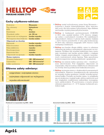 ŚRODKI OCHRONY ROŚLIN HELLTOP PIEKIELNIE DOBRE ŻYTO Hodowca Typ odmiany MTZ Krzewienie Wysokość roślin Odporność na wyleganie Wymagania stanowiskowe Odporność na choroby: Mączniak Rdza brunatna Rdza źdźbłowa Rynchosporioza Septorioza liści Odporność na sporysz Norma wysiewu: Wczesny (zalecany) Optymalny Lekko opóźniony ®®Helltop został wyhodowany przez firmę Monsanto – hodowcę z dużym doświadczeniem, który wprowadził nowy dla żyta system hybrydyzacji. Jego efektem jest bardzo wysoki potencjał plonowania. Monsanto hybrydowa 40 g średnie ok. 152 cm bardzo wysoka bardzo niskie ®®Helltop w badaniach porównawczych COBORU w 2011 roku uzyskał średnio 117% wzorca, osiągając jeden z najwyższych wyników. Na najsłabszych stanowiskach różnica w plonie była jeszcze większa – 121% wzorca pozostawiło w tyle całą konkurencję. W 2014 roku odmiana osiągnęła 123% wzorca i była najlepszą z badanych. bardzo wysoka bardzo wysoka wysoka średnia wysoka bardzo wysoka ®®Helltop ma bardzo długie źdźbło, mimo to odmiana odznacza się jedną z najwyższych odporności na wyleganie. Źródłem tak wysokiej stabilności łanu mimo jego wysokości jest bardzo grube źdźbło o większej liczbie wiązek przewodzących i ścianach komórkowych wyścielonych silnie ligniną. Taka specyficzna budowa zapewnia wysoką stabilność i sprężystość. 190 - 200 ziaren/m² 200 - 220 ziaren/m² 220 - 260 ziaren/m² ®®Helltop ma jeszcze jeden ogromny atut – wysoki poziom zdrowotności. Pod względem odporności na mączniaka, rdzę brunatną i źdźbłową ta odmiana jest na chwilę obecną praktycznie bezkonkurencyjna. Główne zalety odmiany: ®®Helltop wytwarza ziarno o doskonałych parametrach młynarskich. Nasiona charakteryzują się optymalną do wypieku liczbą opadania i bardzo wysoką zawartością białka. Ponadto są bardzo jasne, co przekłada się na atrakcyjny wygląd mąki, zdolny zadowolić pod tym względem oczekiwania najbardziej wymagających użytkowników. W porównaniu z innymi żytami odmiana zapewnia o 5 - 10 % lepszą wydajność produkcji mąki. ® najgrubsze i najcięższe ziarno ® najwyższa odporność na wyleganie ® wysoka zdrowotność ODMIANY JĘCZMIENIA ODMIANY ŻYTA HYBRYDOWEGO ODMIANY PSZENICY NASZE REKOMENDACJE Cechy użytkowo-rolnicze: ODMIANY PSZENŻYTA Podatność na mączniaka (wg BSA – 2010) Zawartość białka (wg BSA – 2010) 7 7 6 6 5 5 4 4 3 3 2 2 1 1 0 Helltop Amato Ballistic Brasetto Guttino Gonello 0 Palazzo Helltop Amato Ballistic Brasetto Guttino Gonello BSA (Bundessortenamt) - niemiecki odpowiednik COBORU 22 Palazzo