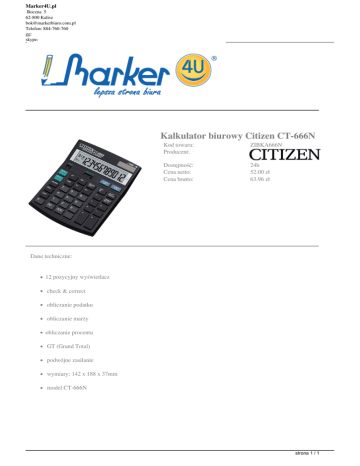 Marker4U.pl Boczna 5 62-800 Kalisz [email protected] Telefon: 884-760-760 gg: skype: Kalkulator biurowy Citizen CT-666N Kod towaru: Producent: ZIBKA666N Dostępność: Cena netto: Cena brutto: 24h 52.00 zł 63.96 zł Dane techniczne: 12 pozycyjny wyświetlacz check & correct obliczanie podatku obliczanie marży obliczanie procentu GT (Grand Total) podwójne zasilanie wymiary: 142 x 188 x 37mm model CT-666N strona 1 / 1 Powered by TCPDF (www.tcpdf.org)