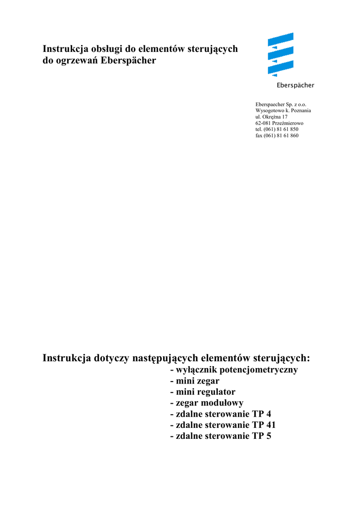 Instrukcja obsługi do elementów sterujących do ogrzewań Eberspächer Eberspächer Eberspaecher Sp. z o.o. Wysogotowo k. Poznania ul. Okrężna 17 62-081 Przeźmierowo tel. (061) 81 61 850 fax (061) 81 61 860 Instrukcja dotyczy następujących elementów sterujących: - wyłącznik potencjometryczny - mini zegar - mini regulator - zegar modułowy - zdalne sterowanie TP 4 - zdalne sterowanie TP 41 - zdalne sterowanie TP 5 Wyłącznik potencjometryczny Wyłącznik potencjometryczny pracuje jako wyłącznik i jako potencjometryczny regulator temperatury jaką chcemy uzyskać w ogrzewanej przestrzeni w zakresie od 10 do 30 stopni Celsjusza. W wyłączniku znajdują się dwie diody świecące czerwona do podświetlenia wyłącznika i zielona sygnalizująca pracę urządzenia. W przypadku pracy wyłącznika potencjometrycznego bez wyłącznika zegarowego na wyłączniku znajduje się tarcza skali posiadająca pozycję 0, jeżeli elementem włączającym jest wyłącznik zegarowy to na wyłączniku znajduje się tarcza skali bez pozycji 0. Regulacja temperatury Regulacja temperatury odbywa się na wyłączniku Poprzez odpowiednie ustawienie potencjometru. Regulacja następuje w zakresie od 10 do 30 stopni Celsjusza. W zależności od wielkości temperatury zadanej na wyłączniku potencjometrycznym i zmierzonej przez sterownik urządzenia grzewczego w ogrzewanej przestrzeni przez odpowiedni czujnik temperatury znajdujący się w ogrzewaniu urządzenie pracuje z odpowiednią mocą grzewczą na jednym ze stopni pracy aby uzyskać zadaną temperaturę a następnie ją utrzymać. Odbywa się to automatycznie bez konieczności ingerencji kierowcy, ponieważ czuwa nad tym elektroniczny sterownik urządzenia grzewczego. Jeżeli urządzenie ma pracować w obiegu zewnętrznym należy zastosować dodatkowy zewnętrzny czujnik temperatury (odłączając czujnik temperatury zabudowany w urządzeniu, podłączenie patrz schemat elektryczny). Zewnętrznego czujnika temperatury nie wolno mocować na nieizolowanej ścianie kabiny, nie należy także mocować go w miejscu narażonym na działanie promieni słonecznych lub przeciągów. 2 Mini zegar 1. Przycisk programowania 2. Przycisk zmniejszania wielkości 3. Przycisk zwiększania wielkości 4. Przycisk grzania 5. Wyświetlacz czasu 6. Wskaźnik włączonej pamięci 7. Wskaźnik grzania 8. Wskaźnik pamięci Wskazówki ogólne ustawiania i programowania mini zegara żadnego przycisku - po chwili zegar przeskoczy w stan wskazania czasu pracy urządzenia. Na wyświetlaczu miga symbol grzania i czas pracy, który można zmieniać przyciskami (2) i (3) w zakresie od 10 do 120 minut. Po wybraniu czasu pracy urządzenia wcisnąć przycisk (1). Na wyświetlaczu pojawi się aktualny czas. Dwukropek miga. - Jeżeli w ciągu 15 sekund nie zostanie naciśnięty żaden przycisk, to wyświetlacz powraca do stanu początkowego wyświetlając aktualny czas. - Przy ustawianiu czasu przyciskami (2) i (3) przy dłuższym wciśnięciu przycisku następuje szybsze przesuwanie czasu. Zegar ten umożliwia jednoczesne zaprogramowanie i aktywowanie trzech czasów włączenia, co oznacza, że urządzenie może trzy razy włączać się zgodnie z zaprogramowanymi czasami włączenia. Po przepracowaniu zaktywowanego czasu, aby urządzenie mogło ponownie włączyć się na przepracowany już czas, należy go ponownie zaktywować. Programowanie godziny włączenia urządzenia Poprzez 1-, 2 lub 3 krotne przyciśnięcie przycisku (1) wywołuje się 1-, 2 lub 3 pamięć. Przy pomocy przycisków (2) i (3) można ustawić wybrany czas włączenia urządzenia. Aktywowanie i dezaktywowanie wybranego programu następuje przyciskiem (4). Po zaktywowaniu programu pojawia się na wyświetlaczu symbol "ON". Przy zaktywowanym czasie 1-, 2 lub 3 na wyświetlaczu pojawia się odpowiedni symbol 1, 2 lub 3. Programowanie mini zegara Pierwsze ustawienie Po podłączeniu napięcia zasilającego na wyświetlaczu zostaną wyświetlone migająco wszystkie symbole. W tym momencie urządzenie grzewcze nie może zostać włączone, najpierw należy bowiem ustawić aktualny czas: Nacisnąć przycisk (1) - symbol aktualnego czasu miga. Ustawić aktualny czas przyciskami (2) i (3). Nacisnąć ponownie przycisk (1) w celu zatwierdzenia aktualnego czasu - miga dwukropek . Obsługa mini zegara Włączanie urządzenia Wcisnąć przycisk (4). Wyświetlacz wskazuje pozostały czas grzania w minutach oraz symbol (7). Wyłączenie urządzenia Wcisnąć przycisk (4). Urz¹dzenie wyłączy się po trwającym około 3 minut przedmuchu. Na wyświetlaczu zostanie wskazany aktualny czas. Ustawianie aktualnego czasu Nacisnąć przycisk (1) dłużej niż 3 sekundy, miga symbol czasu, ustawić aktualny czas przyciskami (2) i (3). W celu zatwierdzenia aktualnego czasu nacisnąć ponownie przycisk (1) krócej niż 5 sek., aktualny czas zostanie wskazany, dwukropek miga. Wskazówka Jeżeli po ustawieniu czasu przycisk (1) wciśniemy na czas dłuższy niż 5 sekund, to zegar przejdzie w tryb programowania czasu pracy urz¹dzenia. Praca ciągła urządzenia Wcisnąć przycisk (3) i przytrzymać wciśnięty następnie nacisnąć przycisk (4). W tej chwili urządzenie będzie pracować w trybie ciągłym do momentu jego manualnego wyłączenia poprzez ponowne naciśnięcie przycisku (4). Ustawianie czasu pracy Nacisnąć przycisk (1) i przytrzymać dłużej niż 3 sekundy - aktualny czas miga - nie naciskać teraz 3 Miniregulator AIRTRONIC 1. Pokrętło wyboru wstępnego temperatury - lewy ogranicznik ok. 8 0 C -mała ilość ciepła - prawy ogranicznik ok. 34 0 C - duża ilość ciepła 2. Grzanie 3. Czerwona LED - kontrola ogrzewania 4. Wyłączanie (nie w połączeniu z minizegarem) 5. Wentylacja 6. Niebieska LED - kontrola wentylacji Nr katal. 22 1000 32 07 00 Wskazówka: W połączeniu z minizegarem przycisk ‘4’ nie pełni żadnej funkcji. Włączanie / wyłączanie ogrzewania odbywa się tylko za pośrednictwem minizegara. 