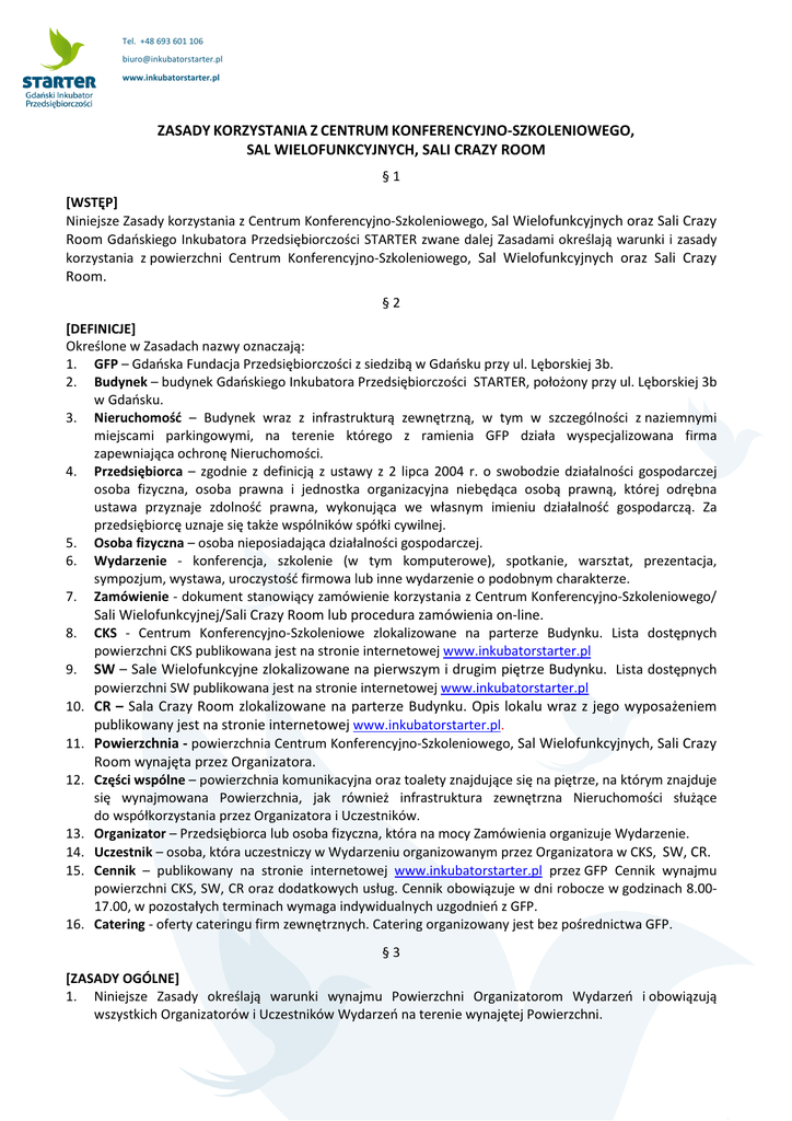 Tel. +48 693 601 106 [email protected] www.inkubatorstarter.pl ZASADY KORZYSTANIA Z CENTRUM KONFERENCYJNO-SZKOLENIOWEGO, SAL WIELOFUNKCYJNYCH, SALI CRAZY ROOM §1 [WSTĘP] Niniejsze Zasady korzystania z Centrum Konferencyjno-Szkoleniowego, Sal Wielofunkcyjnych oraz Sali Crazy Room Gdańskiego Inkubatora Przedsiębiorczości STARTER zwane dalej Zasadami określają warunki i zasady korzystania z powierzchni Centrum Konferencyjno-Szkoleniowego, Sal Wielofunkcyjnych oraz Sali Crazy Room. §2 [DEFINICJE] Określone w Zasadach nazwy oznaczają: 1. GFP – Gdańska Fundacja Przedsiębiorczości z siedzibą w Gdańsku przy ul. Lęborskiej 3b. 2. Budynek – budynek Gdańskiego Inkubatora Przedsiębiorczości STARTER, położony przy ul. Lęborskiej 3b w Gdańsku. 3. Nieruchomość – Budynek wraz z infrastrukturą zewnętrzną, w tym w szczególności z naziemnymi miejscami parkingowymi, na terenie którego z ramienia GFP działa wyspecjalizowana firma zapewniająca ochronę Nieruchomości. 4. Przedsiębiorca – zgodnie z definicją z ustawy z 2 lipca 2004 r. o swobodzie działalności gospodarczej osoba fizyczna, osoba prawna i jednostka organizacyjna niebędąca osobą prawną, której odrębna ustawa przyznaje zdolność prawna, wykonująca we własnym imieniu działalność gospodarczą. Za przedsiębiorcę uznaje się także wspólników spółki cywilnej. 5. Osoba fizyczna – osoba nieposiadająca działalności gospodarczej. 6. Wydarzenie - konferencja, szkolenie (w tym komputerowe), spotkanie, warsztat, prezentacja, sympozjum, wystawa, uroczystość firmowa lub inne wydarzenie o podobnym charakterze. 7. Zamówienie - dokument stanowiący zamówienie korzystania z Centrum Konferencyjno-Szkoleniowego/ Sali Wielofunkcyjnej/Sali Crazy Room lub procedura zamówienia on-line. 8. CKS - Centrum Konferencyjno-Szkoleniowe zlokalizowane na parterze Budynku. Lista dostępnych powierzchni CKS publikowana jest na stronie internetowej www.inkubatorstarter.pl 9. SW – Sale Wielofunkcyjne zlokalizowane na pierwszym i drugim piętrze Budynku. Lista dostępnych powierzchni SW publikowana jest na stronie internetowej www.inkubatorstarter.pl 10. CR – Sala Crazy Room zlokalizowane na parterze Budynku. Opis lokalu wraz z jego wyposażeniem publikowany jest na stronie internetowej www.inkubatorstarter.pl. 11. Powierzchnia - powierzchnia Centrum Konferencyjno-Szkoleniowego, Sal Wielofunkcyjnych, Sali Crazy Room wynajęta przez Organizatora. 12. Części wspólne – powierzchnia komunikacyjna oraz toalety znajdujące się na piętrze, na którym znajduje się wynajmowana Powierzchnia, jak również infrastruktura zewnętrzna Nieruchomości służące do współkorzystania przez Organizatora i Uczestników. 13. Organizator – Przedsiębiorca lub osoba fizyczna, która na mocy Zamówienia organizuje Wydarzenie. 14. Uczestnik – osoba, która uczestniczy w Wydarzeniu organizowanym przez Organizatora w CKS, SW, CR. 15. Cennik – publikowany na stronie internetowej www.inkubatorstarter.pl przez GFP Cennik wynajmu powierzchni CKS, SW, CR oraz dodatkowych usług. Cennik obowiązuje w dni robocze w godzinach 8.0017.00, w pozostałych terminach wymaga indywidualnych uzgodnień z GFP. 16. Catering - oferty cateringu firm zewnętrznych. Catering organizowany jest bez pośrednictwa GFP. §3 [ZASADY OGÓLNE] 1. Niniejsze Zasady określają warunki wynajmu Powierzchni Organizatorom Wydarzeń i obowiązują wszystkich Organizatorów i Uczestników Wydarzeń na terenie wynajętej Powierzchni. Tel. +48 693 601 106 [email protected] www.inkubatorstarter.pl 2. 3. 4. 5. GFP oferuje Organizatorom wynajem Powierzchni na warunkach określonych w niniejszych Zasadach i w Cenniku. GFP oferuje Organizatorom wynajem Powierzchni w dni robocze od godziny 8.00 do 17.00. Wynajem Powierzchni poza godzinami 8.00-17.00 nie jest objęty ofertą i wymaga indywidualnych uzgodnień z GFP. W ramach wynajmu Powierzchni Organizator i Uczestnicy mają prawo do współkorzystania z Części wspólnych. §4 [ZASADY ZAMÓWIENIA WSPÓLNE] 1. Wynajem Powierzchni może nastąpić tylko w celu zorganizowania Wydarzenia. Organizator nie ma prawa wynajęcia Powierzchni na magazyn, powierzchnię produkcyjną, powierzchnię handlową lub przeznaczoną do świadczenia usług innych niż Wydarzenie. 2. Organizator nie może bez pisemnej zgody GFP pod rygorem nieważności podnająć lub użyczyć wynajętej Powierzchni innym podmiotom. 3. Do wynajęcia Powierzchni dochodzi poprzez dokonanie przez Organizatora zamówienia CKS/ SW/CR oraz potwierdzenie jego przyjęcia przez GFP. 4. Zamówienie Powierzchni dokonywane jest przez Organizatora za pomocą Zamówienia dostępnego na stronie internetowej www.inkubatorstarter.pl (zakładka Centrum Konferencyjno-Szkoleniowe) lub bezpośrednio w GFP. Potwierdzenie zamówienia CKS/SW/CR dokonywane jest przez GFP drogą mailową na adres e-mailowy wskazany przez Organizatora najpóźniej następnego dnia roboczego od daty jego dokonania. Potwierdzenie zamówienia CKS/SW/CR jest skuteczne wyłącznie poprzez otrzymanie e-maila zwrotnego. 5. GFP ma prawo do potwierdzenia zamówienia CKS /SW/CR z wyłączeniem części oczekiwań Organizatora wobec wynajmowanej Powierzchni niemożliwych do spełnienia przez GFP. W takim przypadku, Organizator ma prawo w ciągu jednego dnia roboczego od otrzymania informacji drogą e-mailową na adres e-mailowy wskazany w Zamówieniu do odstąpienia od wynajmu Powierzchni o czym informuje GFP e-mailowo na adres, z którego otrzymał informację o wyłączeniach. 6. Stawki wynajmu Powierzchni oraz minimalne czasy wynajmu określone są w Cenniku. 7. Zamówienie usług niezawartych w Cenniku wymaga indywidualnych uzgodnień z GFP. 8. Opłata za wynajętą Powierzchnię i dodatkowe usługi zamówione przez Organizatora naliczana jest zgodnie z dokonanym przez Organizatora Zamówieniem, niezależnie od faktycznego czasu wykorzystania wynajętej powierzchni CKS oraz niezależnie od faktycznego w