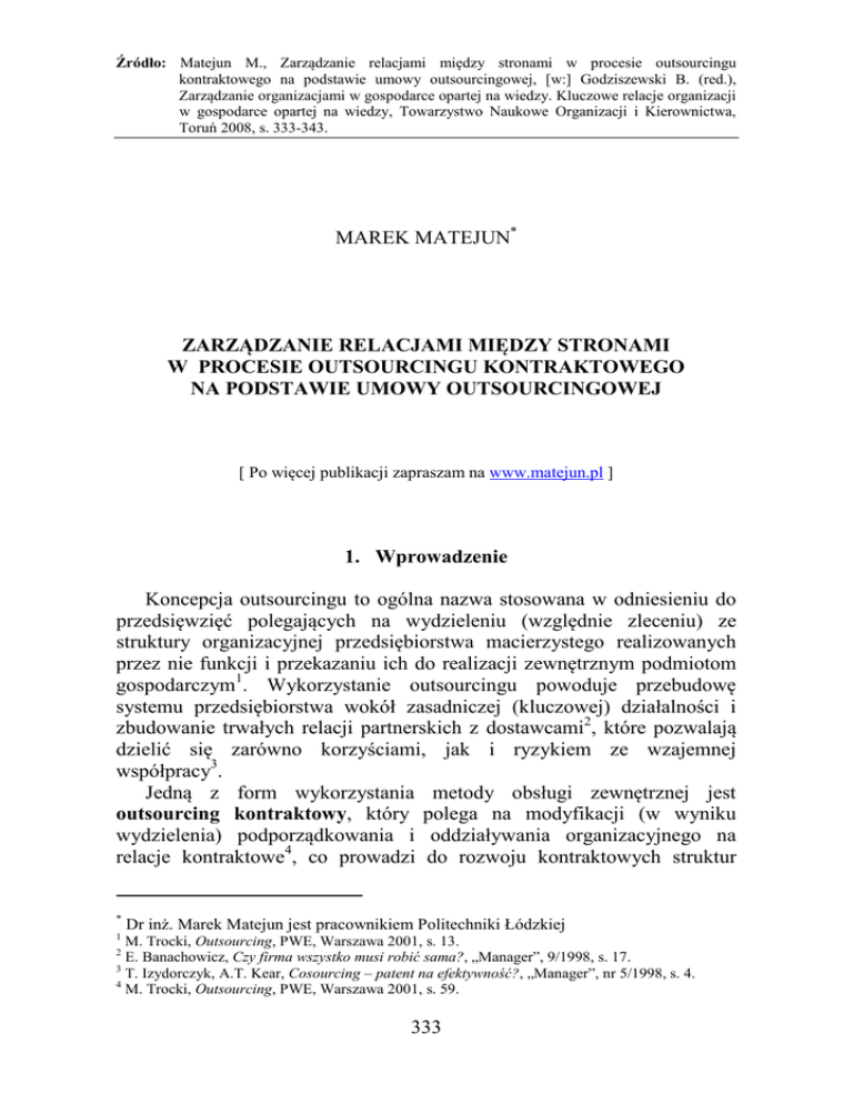 Źródło: Matejun M., Zarządzanie relacjami między stronami w procesie outsourcingu kontraktowego na podstawie umowy outsourcingowej, [w:] Godziszewski B. (red.), Zarządzanie organizacjami w gospodarce opartej na wiedzy. Kluczowe relacje organizacji w gospodarce opartej na wiedzy, Towarzystwo Naukowe Organizacji i Kierownictwa, Toruń 2008, s. 333-343. MAREK MATEJUN* ZARZĄDZANIE RELACJAMI MIĘDZY STRONAMI W PROCESIE OUTSOURCINGU KONTRAKTOWEGO NA PODSTAWIE UMOWY OUTSOURCINGOWEJ [ Po więcej publikacji zapraszam na www.matejun.pl ] 1. Wprowadzenie Koncepcja outsourcingu to ogólna nazwa stosowana w odniesieniu do przedsięwzięć polegających na wydzieleniu (względnie zleceniu) ze struktury organizacyjnej przedsiębiorstwa macierzystego realizowanych przez nie funkcji i przekazaniu ich do realizacji zewnętrznym podmiotom gospodarczym1. Wykorzystanie outsourcingu powoduje przebudowę systemu przedsiębiorstwa wokół zasadniczej (kluczowej) działalności i zbudowanie trwałych relacji partnerskich z dostawcami2, które pozwalają dzielić się zarówno korzyściami, jak i ryzykiem ze wzajemnej współpracy3. Jedną z form wykorzystania metody obsługi zewnętrznej jest outsourcing kontraktowy, który polega na modyfikacji (w wyniku wydzielenia) podporządkowania i oddziaływania organizacyjnego na relacje kontraktowe4, co prowadzi do rozwoju kontraktowych struktur * Dr inż. Marek Matejun jest pracownikiem Politechniki Łódzkiej 1 M. Trocki, Outsourcing, PWE, Warszawa 2001, s. 13. 2 E. Banachowicz, Czy firma wszystko musi robić sama?, „Manager”, 9/1998, s. 17. 3 T. Izydorczyk, A.T. Kear, Cosourcing – patent na efektywność?, „Manager”, nr 5/1998, s. 4. 4 M. Trocki, Outsourcing, PWE, Warszawa 2001, s. 59. 333 Źródło: Matejun M., Zarządzanie relacjami między stronami w procesie outsourcingu kontraktowego na podstawie umowy outsourcingowej, [w:] Godziszewski B. (red.), Zarządzanie organizacjami w gospodarce opartej na wiedzy. Kluczowe relacje organizacji w gospodarce opartej na wiedzy, Towarzystwo Naukowe Organizacji i Kierownictwa, Toruń 2008, s. 333-343. organizacyjnych działalności gospodarczej. W tej sytuacji cechą koncepcji outsourcingu jest sformalizowanie współpracy na podstawie umowy (kontraktu), co pozwala na przeniesienie odpowiedzialności za realizowaną funkcję na dostawcę5, jak również umożliwia wprowadzenie określonych relacji, w tym również zadań i obowiązków pomiędzy strony transakcji. Obecnie outsourcing traktowany jest przede wszystkim jako metoda strategicznego kształtowania struktury działalności gospodarczej i ewoluuje w stronę przechodzenia od układu kupujący-sprzedający w kierunku relacji partnerstwa strategicznego. Nastawienie na własne korzyści zastępuje tu nadzieja, że relacja wymiany jest sytuacją, w której obie strony wygrywają uzyskując synergiczną przewagę konkurencyjną6. Nie jest to więc zwykły związek dostawca-odbiorca (umowa-zlecenie), lecz układ partnerski, w którym obie strony są mocno osadzone7 i zachodzą między nimi różnorodne relacje, określone między innymi poprzez przyjęte rozwiązania umowne. Biorąc to pod uwagę, jako cel artykułu wyznaczono prezentację umowy outsourcingowej jest podstawowego aktu regulującego organizację i obowiązki stron oraz inne obszary relacji zachodzących pomiędzy partnerami w procesie outsourcingu. Rozważania teoretyczne uzupełnione zostały wynikami badań prowadzonych na podstawie 21 kontraktów outsourcingowych zawieranych przez biura rachunkowe z firmami sektora MSP w zakresie stałej obsługi zewnętrznej w sferze rachunkowości i doradztwa podatkowego. 2. Umowa outsourcingowa jako narzędzie zarządzania relacjami w procesie outsourcingu kontraktowego W wyniku wykorzystania outsourcingu kontraktowego rozwijają się kontraktowe struktury organizacyjne, które składają się z samodzielnych prawnie, niezależnych organizacyjnie i kapitałowo podmiotów gospodarczych, występujących w różnorodnych formach organizacyjnoprawnych i realizujących określone zadania przekazane w ramach kontraktu. Relacje w tych strukturach wynikają w znacznym stopniu z faktu zawarcia 5 6 7 M. Matejun, Outsourcing rachunkowości i doradztwa podatkowego, [w:] Doskonalenie systemów zarządzania w społeczeństwie informacyjnym, tom 2, red. A. Stabryła, AE w Krakowie, Kraków 2006, s. 23. A. Krejner-Nowecka, Jakość partnerstwa a sukces outsourcing’u w przedsiębiorstwie, [w:] Przedsiębiorstwo partnerskie, red. M. Romanowska, M. Trocki, Difin, Warszawa 2002, s. 103. J. Matejuk, Budowa konkurencyjności przedsiębiorstw w okresie transformacji, Wydawnictwo Pret, Warszawa 2003, s. 62. 334 Źródło: Matejun M., Zarządzanie relacjami między stronami w procesie outsourcingu kontraktowego na podstawie umowy outsourcingowej, [w:] Godziszewski B. (red.), Zarządzanie organizacjami w gospodarce opartej na wiedzy. Kluczowe relacje organizacji w gospodarce opartej na wiedzy, Towarzystwo Naukowe Organizacji i Kierownictwa, Toruń 2008, s. 333-343. przez niezależne podmioty kontraktów (porozumień, umów) na realizację określonego obszaru działalności gospodarczej (funkcji, zadania, procesu, działania, modułu itp.) 8. Relacje zachodzące w tych strukturach są w znacznym stopniu regulowane przez zapisy kontraktu oraz rozwiązania wypracowane w trakcie współpracy i dotyczą między innymi egzekwowania warunków i obowiązków wynikających z umowy. Uzasadnienia dla tak pojmowanej koncepcji outsourcingu można poszukiwać między innymi na gruncie teorii kontraktualnej przedsiębiorstwa A. Alchiana i H. Demsetza. Opisuje ona firmę jako splot kontraktów, które są zawierane przez organizatora, w celu uzyskania kontroli nad różnymi zasobami tworzącymi organizację. Głównym elementem budowy przedsiębiorstwa jest w tym przypadku „kontrakt”, a firma jawi się jako szczególne urządzenie ekonomiczne, które można wytłumaczyć jako wiązkę kont