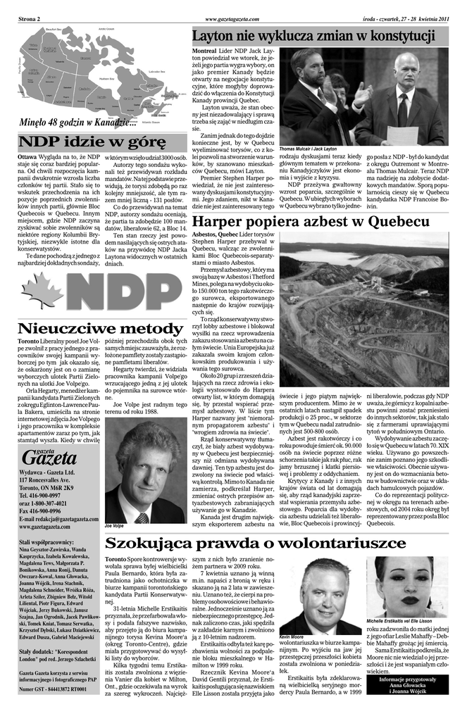 środa - czwartek, 27 - 28 kwietnia 2011 www.gazetagazeta.com Strona 2 Layton nie wyklucza zmian w konstytucji Minęło 48 godzin w Kanadzie... NDP idzie w górę Ottawa Wygląda na to, że NDP staje się coraz bardziej popularna. Od chwili rozpoczęcia kampanii dwukrotnie wzrosła liczba członków tej partii. Stało się to wskutek przechodzenia na ich pozycje poprzednich zwolenników innych partii, głównie Bloc Quebecois w Quebecu. Innym miejscem, gdzie NDP zaczyna zyskiwać sobie zwolenników są niektóre regiony Kolumbii Brytyjskiej, niezwykle istotne dla konserwatystów. Te dane pochodzą z jednego z najbardziej dokładnych sondaży, w którym wzięło udział 3000 osób. Autorzy tego sondażu wykonali też przewidywań rozkładu mandatów. Na tej podstawie przewidują, że torysi zdobędą po raz kolejny mniejszość, ale tym razem mniej liczną - 131 posłów. Co do przewidywań na temat NDP, autorzy sondażu oceniają, że partia ta zdobędzie 100 mandatów, liberałowie 62, a Bloc 14. Ten stan rzeczy jest powodem nasilających się ostrych ataków na przywódcę NDP Jacka Laytona widocznych w ostatnich dniach. Nieuczciwe metody Toronto Liberalny poseł Joe Volpe zwolnił z pracy jednego z pracowników swojej kampanii wyborczej po tym jak okazało się, że oskarżony jest on o zamianę wyborczych ulotek Partii Zielonych na ulotki Joe Volpe'go. Orla Hegarty, menedżer kampanii kandydata Partii Zielonych z okręgu Eglinton-Lawrence Paula Bakera, umieściła na stronie internetowej zdjęcia Joe Volpego i jego pracownika w kompleksie apartamentów zaraz po tym, jak stamtąd wyszła. Kiedy w chwilę później przechodziła obok tych samych miejsc zauważyła, że rozłożone pamflety zostały zastąpione pamfletami liberałów. Hegarty twierdzi, że widziała pracownika kampanii Volpe'go wrzucającego jedną z jej ulotek do pojemnika na surowce wtórne. Joe Volpe jest radnym tego terenu od roku 1988. gazeta Gazeta Wydawca - Gazeta Ltd. 117 Roncesvalles Ave. Toronto, ON M6R 2K9 Tel. 416-900-0997 oraz 1-800-307-4021 Fax 416-900-0996 E-mail [email protected] www.gazetagazeta.com Stali współpracownicy: Nina Geysztor-Zawirska, Wanda Kasprzycka, Izabela Kowalewska, Magdalena Tews, Małgorzata P. Bonikowska, Anna Ronij, Danuta Owczarz-Kowal, Anna Głowacka, Joanna Wójcik, Irena Stachnik, Magdalena Schneider, Wróżka Róża, Arleta Sziler, Zbigniew Bełz, Witold Liliental, Piotr Figura, Edward Wójciak, Jerzy Bukowski, Janusz Szajna, Jan Ogrodnik, Jacek Pawlikowski, Tomek Kniat, Tomasz Serwatka, Krzysztof Dębski, Łukasz Dziatkiewicz, Edward Dusza, Gabriel Maciejewski Stały dodatek: "Korespondent London" pod red. Jerzego Szlachetki Gazeta Gazeta korzysta z serwisu informacyjnego i fotograficznego PAP Numer GST - 844413872 RT0001 Joe Volpe Montreal Lider NDP Jack Layton powiedział we wtorek, że jeżeli jego partia wygra wybory, on jako premier Kanady będzie otwarty na negocjacje konstytucyjne, które mogłyby doprowadzić do włączenia do Konstytucji Kanady prowincji Quebec. Layton uważa, że stan obecny jest niezadowalający i sprawą trzeba się zająć w niedługim czasie. Zanim jednak do tego dojdzie konieczne jest, by w Quebecu wyeliminować torysów, co z1kolei pozwoli na stworzenie warunków, by szanowano mieszkańców Quebecu, mówi Layton. Premier Stephen Harper powiedział, że nie jest zainteresowany dyskusjami konstytucyjnymi. Jego zdaniem, nikt w Kanadzie nie jest zainteresowany tego Thomas Mulcair i Jack Layton rodzaju dyskusjami teraz kiedy głównym tematem w przekonaniu Kanadyjczyków jest ekonomia i wyjście z1kryzysu. NDP przeżywa gwałtowny wzrost poparcia, szczególnie w Quebecu. W ubiegłych wyborach w Quebecu wybrano tylko jedne- go posła z1NDP - był do kandydat z1okręgu Outremont w Montrealu Thomas Mulcair. Teraz NDP ma nadzieję na zdobycie dodatkowych mandatów. Sporą popularnością cieszy się w Quebecu kandydatka NDP Francoise Boivin. Harper popiera azbest w Quebecu Asbestos, Quebec Lider torysów Stephen Harper przebywał w Quebecu, walcząc ze zwolennikami Bloc Quebecois-separatystami o miasto Asbestos. Przemysł azbestowy, który ma swoją bazę w Asbestos i Thetford Mines, polega na wydobyciu około 150.000 ton tego rakotwórczego surowca, eksportowanego następnie do krajów rozwijających się. To rząd konserwatywny stworzył lobby azbestowe i blokował wysiłki na rzecz wprowadzenia zakazu stosowania azbestu na całym świecie. Unia Europejska już zakazała swoim krajom członkowskim produkowania i używania tego surowca. Około 20 grup i zrzeszeń działających na rzecz zdrowia i ekologii wystosowało do Harpera otwarty list, w którym domagają się, by przestał wspierać przemysł azbestowy. W liście tym Harper nazwany jest "niemoralnym propagatorem azbestu" i "wrogiem zdrowia na świecie". Rząd konserwatywny tłumaczył, że biały azbest wydobywany w Quebecu jest bezpieczniejszy niż odmiana wydobywana dawniej. Ten typ azbestu jest dozwolony na świecie pod właściwą kontrolą. Mimo to Kanada nie zamierza, podkreślał Harper, zmieniać ostrych przepisów antyazbestowych zabraniających używanie go w Kanadzie. Kanada jest drugim największym eksporterem azbestu na świecie i jego piątym największym producentem. Mimo że w ostatnich latach nastąpił spadek produkcji o 25 proc., w sektorze tym w Quebecu nadal zatrudnionych jest 500-800 osób. Azbest jest rakotwórczy i co roku powoduje śmierć ok. 90.000 osób na świecie poprzez różne schorzenia takie jak rak płuc, rak jamy brzusznej i klatki piersiowej i problemy z1oddychaniem. Krytycy z1Kanady i z1innych krajów świata od lat domagają się, aby rząd kanadyjski zaprzestał wspierania przemysłu azbestowego. Poparcia dla wydobycia azbestu udzielali też liberałowie, Bloc Quebecois i prowincyj- ni liberałowie, podczas gdy NDP uważa, że górnicy z1kopalni azbestu powinni zostać przeniesieni do innych sektorów, tak jak stało się z1farmerami uprawiającymi tyto