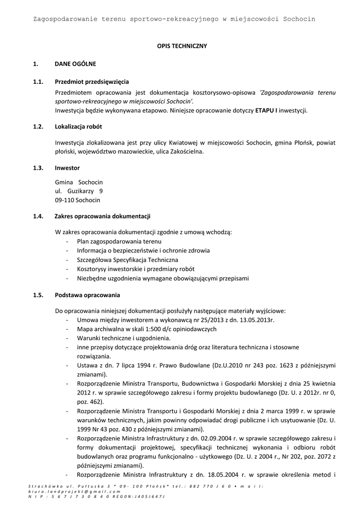 Zagospodarowanie terenu sportowo-rekreacyjnego w miejscowości Sochocin OPIS TECHNICZNY 1. DANE OGÓLNE 1.1. Przedmiot przedsięwzięcia Przedmiotem opracowania jest dokumentacja kosztorysowo-opisowa 'Zagospodarowania terenu sportowo-rekreacyjnego w miejscowości Sochocin'. Inwestycja będzie wykonywana etapowo. Niniejsze opracowanie dotyczy ETAPU I inwestycji. 1.2. Lokalizacja robót Inwestycja zlokalizowana jest przy ulicy Kwiatowej w miejscowości Sochocin, gmina Płońsk, powiat płoński, województwo mazowieckie, ulica Zakościelna. 1.3. Inwestor Gmina Sochocin ul. Guzikarzy 9 09-110 Sochocin 1.4. Zakres opracowania dokumentacji W zakres opracowania dokumentacji zgodnie z umową wchodzą: - Plan zagospodarowania terenu - Informacja o bezpieczeństwie i ochronie zdrowia - Szczegółowa Specyfikacja Techniczna - Kosztorysy inwestorskie i przedmiary robót - Niezbędne uzgodnienia wymagane obowiązującymi przepisami 1.5. Podstawa opracowania Do opracowania niniejszej dokumentacji posłużyły następujące materiały wyjściowe: - Umowa między inwestorem a wykonawcą nr 25/2013 z dn. 13.05.2013r. - Mapa archiwalna w skali 1:500 d/c opiniodawczych - Warunki techniczne i uzgodnienia. - inne przepisy dotyczące projektowania dróg oraz literatura techniczna i stosowne rozwiązania. - Ustawa z dn. 7 lipca 1994 r. Prawo Budowlane (Dz.U.2010 nr 243 poz. 1623 z późniejszymi zmianami). - Rozporządzenie Ministra Transportu, Budownictwa i Gospodarki Morskiej z dnia 25 kwietnia 2012 r. w sprawie szczegółowego zakresu i formy projektu budowlanego (Dz. U. z 2012r. nr 0, poz. 462). - Rozporządzenie Ministra Transportu i Gospodarki Morskiej z dnia 2 marca 1999 r. w sprawie warunków technicznych, jakim powinny odpowiadać drogi publiczne i ich usytuowanie (Dz. U. 1999 Nr 43 poz. 430 z późniejszymi zmianami). - Rozporządzenie Ministra Infrastruktury z dn. 02.09.2004 r. w sprawie szczegółowego zakresu i formy dokumentacji projektowej, specyfikacji technicznej wykonania i odbioru robót budowlanych oraz programu funkcjonalno - użytkowego (Dz. U. z 2004 r., Nr 202, poz. 2072 z późniejszymi zmianami). - Rozporządzenie Ministra Infrastruktury z dn. 18.05.2004 r. w sprawie określenia metod i Strachówko ul. Pułtuska 3 * 09- 100 Płońsk* tel.: 882 770 J 6 0 • m a i I: [email protected] N I P : 5 6 7 J 7 3 0 8 4 0 REG0N:J405J647J Zagospodarowanie terenu sportowo-rekreacyjnego w miejscowości Sochocin - 1.6. podstaw sporządzania kosztorysu inwestorskiego, obliczania planowanych kosztów prac projektowych oraz planowanych kosztów robót budowlanych określonych w programie funkcjonalno - użytkowym (Dz. U. 2004 r. Nr 130 poz. 1389) Rozporządzenie z dn. 09.11.2010 r. w sprawie przedsięwzięć mogących znacząco oddziaływać na środowisko (Dz. U. 2010 r. Nr 213 poz. 1397) Ustawa Prawo Ochrony Środowiska z dn. 27 kwietnia 2001r. (Dz.U. 2008 nr 25 poz. 150 z późniejszymi zmianami). Zakres robót Niniejszy projekt obejmuje następujące roboty: - Roboty przygotowawcze - oczyszczenie terenu - Geodezyjne wytyczenie elementów przedsięwzięcia - Zdjęcie humusu i magazynowanie w hałdy - Roboty ziemne - wykonanie wykopów pod konstrukcje jezdni, chodników i placów - Ustawienie krawężników i obrzeży chodnikowych - Wykonanie podbudowy nawierzchni jezdni, chodników, placów - Wykonanie nawierzchni z brukowych kostek betonowych i płyt chodnikowych - Wykonanie nawierzchni bezpiecznej placu zabaw - Wykonanie nawierzchni żwirowych drenażowych - Ustawienie ogrodzenia terenu, placu zabaw, montaż bram i furtek - Roboty porządkowe - Wykonanie nasadzeń roślinami ozdobnymi - Wykonanie trawników dywanowych siewem - Montaż elementów wyposażenia boiska i placu zabaw - Roboty wykończeniowe - ustawienie elementów małej architektury 2. 2.1. ISTNIEJĄCE ZAGOSPODAROWANIE TERENU Otoczenie Sochocin jest siedzibą władz samorządowych Gminy. Położony jest w jej centralnej części. Teren przeznaczony pod inwestycję zlokalizowany jest na działce nr ewid. 872/2, przy ulicy Kwiatowej. Teren zlokalizowany jest na osiedlu domów jednorodzinnych. Od strony południowej graniczy z pasem drogowym ulicy Kwiatowej o nawierzchni żwirowej, od wschodniej, zachodniej i północnej strony graniczy z terenami prywatnymi. 2.2. Stan istniejący Teren jest niezagospodarowany, a jego ukształtowanie nieregularne z licznymi nierównościami, powierzchnia porośnięta jest trawą. Działka ma kształt prostokąta o bokach 40x80 metrów i powierzchni zagospodarowania 3184 m2. 2.3. Istniejąca infrastruktura techniczna Teren przeznaczony pod inwestycje nie posiada infrastruktury podziemnej. Strachówko ul. Pułtuska 3 * 09- 100 Płońsk* tel.: 882 770 J 6 0 • m a i I: [email protected] N I P : 5 6 7 J 7 3 0 8 4 0 REG0N:J405J647J Zagospodarowanie terenu sportowo-rekreacyjnego w miejscowości Sochocin 3. 3.1. PROJEKTOWANE ZAGOSPODAROWANIE TERENU Granica inwestycji W granicach inwestycji w etapie I zostaną wykonane droga dojazdowa z brukowej kostki betonowej gr. 8 cm do boiska wielofunkcyjnego o nawierzchni trawiastej oraz placu zabaw z bezpieczną nawierzchnią z EPDM oraz chodniki z brukowej kostki betonowej gr. 6 cm. Aby ograniczyć koszt robót ziemnych, z materiału pochodzącego z wykopów pod konstrukcje nawierzchni zostanie usypane wzniesienie. W północno wschodniej części terenu zlokalizowana zostanie część rekreacyjna z kamiennym grillem i miejscem przeznaczonym pod ognisko. Zostaną również wykonane nasadzenia ozdobnymi roślinami, które znacznie zwiększą dekoracyjność miejsca i korzystnie wpłyną na walory estetyczne i wizualne. 3.2. Projektowana geometria Roboty przygotowujące teren pod inwestycję polegać będą na wykarczowaniu krzaków i wyrównaniu nierówności terenu. Projektuje się przygotowanie miejsca pod boisko wielofunkcyjne o nawierzchni trawiastej o wym. 19x32 m oraz wykonanie placu zabaw o wym. 12,50x20 m z bezpieczna nawierzchnią z EPDM, wraz z towarzyszącą 