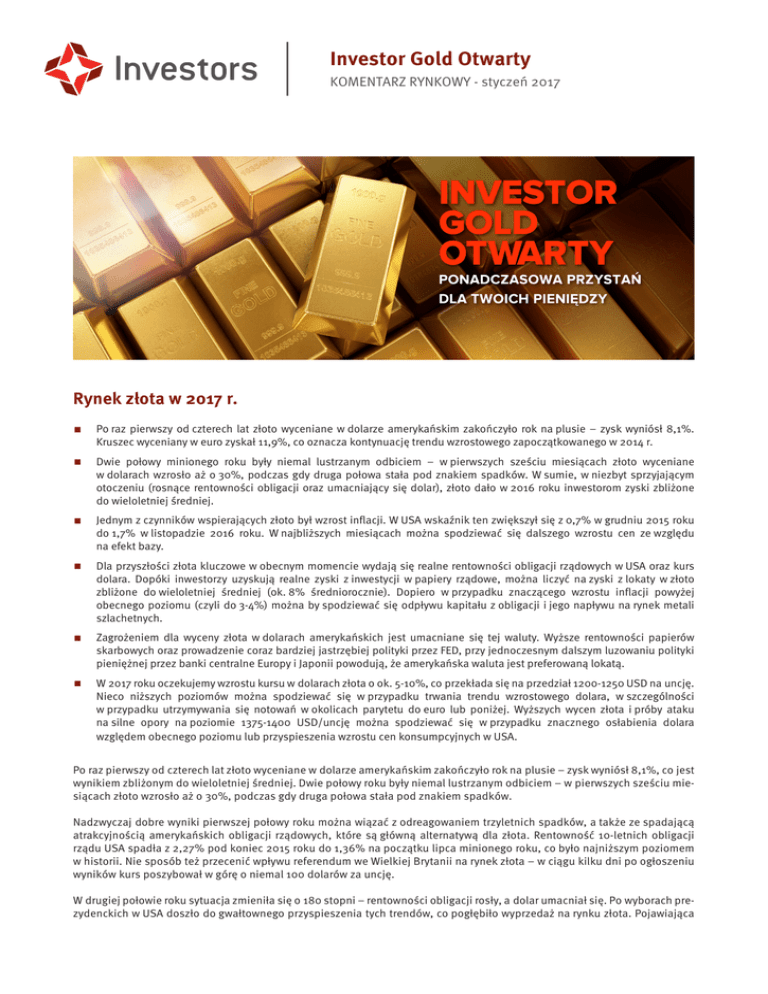 Investor Gold Otwarty KOMENTARZ RYNKOWY - styczeń 2017 Rynek złota w 2017 r. ▪▪ ▪▪ ▪▪ ▪▪ ▪▪ ▪▪ Po raz pierwszy od czterech lat złoto wyceniane w dolarze amerykańskim zakończyło rok na plusie – zysk wyniósł 8,1%. Kruszec wyceniany w euro zyskał 11,9%, co oznacza kontynuację trendu wzrostowego zapoczątkowanego w 2014 r. Dwie połowy minionego roku były niemal lustrzanym odbiciem – w pierwszych sześciu miesiącach złoto wyceniane w dolarach wzrosło aż o 30%, podczas gdy druga połowa stała pod znakiem spadków. W sumie, w niezbyt sprzyjającym otoczeniu (rosnące rentowności obligacji oraz umacniający się dolar), złoto dało w 2016 roku inwestorom zyski zbliżone do wieloletniej średniej. Jednym z czynników wspierających złoto był wzrost inflacji. W USA wskaźnik ten zwiększył się z 0,7% w grudniu 2015 roku do 1,7% w listopadzie 2016 roku. W najbliższych miesiącach można spodziewać się dalszego wzrostu cen ze względu na efekt bazy. Dla przyszłości złota kluczowe w obecnym momencie wydają się realne rentowności obligacji rządowych w USA oraz kurs dolara. Dopóki inwestorzy uzyskują realne zyski z inwestycji w papiery rządowe, można liczyć na zyski z lokaty w złoto zbliżone do wieloletniej średniej (ok. 8% średniorocznie). Dopiero w przypadku znaczącego wzrostu inflacji powyżej obecnego poziomu (czyli do 3‑4%) można by spodziewać się odpływu kapitału z obligacji i jego napływu na rynek metali szlachetnych. Zagrożeniem dla wyceny złota w dolarach amerykańskich jest umacniane się tej waluty. Wyższe rentowności papierów skarbowych oraz prowadzenie coraz bardziej jastrzębiej polityki przez FED, przy jednoczesnym dalszym luzowaniu polityki pieniężnej przez banki centralne Europy i Japonii powodują, że amerykańska waluta jest preferowaną lokatą. W 2017 roku oczekujemy wzrostu kursu w dolarach złota o ok. 5‑10%, co przekłada się na przedział 1200‑1250 USD na uncję. Nieco niższych poziomów można spodziewać się w przypadku trwania trendu wzrostowego dolara, w szczególności w przypadku utrzymywania się notowań w okolicach parytetu do euro lub poniżej. Wyższych wycen złota i próby ataku na silne opory na poziomie 1375‑1400 USD/uncję można spodziewać się w przypadku znacznego osłabienia dolara względem obecnego poziomu lub przyspieszenia wzrostu cen konsumpcyjnych w USA. Po raz pierwszy od czterech lat złoto wyceniane w dolarze amerykańskim zakończyło rok na plusie – zysk wyniósł 8,1%, co jest wynikiem zbliżonym do wieloletniej średniej. Dwie połowy roku były niemal lustrzanym odbiciem – w pierwszych sześciu mie‑ siącach złoto wzrosło aż o 30%, podczas gdy druga połowa stała pod znakiem spadków. Nadzwyczaj dobre wyniki pierwszej połowy roku można wiązać z odreagowaniem trzyletnich spadków, a także ze spadającą atrakcyjnością amerykańskich obligacji rządowych, które są główną alternatywą dla złota. Rentowność 10-letnich obligacji rządu USA spadła z 2,27% pod koniec 2015 roku do 1,36% na początku lipca minionego roku, co było najniższym poziomem w historii. Nie sposób też przecenić wpływu referendum we Wielkiej Brytanii na rynek złota – w ciągu kilku dni po ogłoszeniu wyników kurs poszybował w górę o niemal 100 dolarów za uncję. W drugiej połowie roku sytuacja zmieniła się o 180 stopni – rentowności obligacji rosły, a dolar umacniał się. Po wyborach pre‑ zydenckich w USA doszło do gwałtownego przyspieszenia tych trendów, co pogłębiło wyprzedaż na rynku złota. Pojawiająca Investor Gold Otwarty KOMENTARZ RYNKOWY - styczeń 2017 się w komentarzach wielu analityków teza o powstawaniu silnego, wieloletniego trendu wzrostowego notowań kruszcu prze‑ stała być wiodącą. Przy rosnącym kursie dolara amerykańskiego bardziej prawdopodobne jest trwanie trendu bocznego. Spadek kursu złota spowodował niemal całkowity odpływ kapitału spekulacyjnego z rynku kontraktów terminowych w USA. O ile na początku lipca fundusze utrzymywały rekordową pozycję długą netto w wysokości 273 tys. kontraktów, na koniec 2016 roku wartość ta spadła o 85% do zaledwie 43 tys. kontraktów. Inwestorzy w funduszach ETF byli bardziej powściągliwi w likwidacji pozycji – podczas spadków odpłynęło jedynie ok. 40% środków, które zostały zainwestowane od początku roku. W sumie, w niezbyt sprzyjającym otoczeniu (rosnące rentowności obligacji oraz umacniający się dolar), złoto dało w 2016 roku inwestorom zyski zbliżone do wieloletniej średniej: Zmiana w 2016 roku Kurs złota w USD Rentowność obligacji USA Obligacje 10-letnie USA Kurs EUR/USD 8,1% 0,17 pp 1,0% -3,6% źródło: Bloomberg Jednym z czynników wspierających złoto był wzrost inflacji. W USA poziom tego wskaźnika zwiększył się z 0,7% w grudniu 2015 roku do 1,7% w listopadzie 2016 roku. W najbliższych miesiącach można spodziewać się dalszego wzrostu ze względu na efekt bazy – w pierwszych dwóch miesiącach 2016 roku baryłka ropy kosztowała średnio ok. 30‑32 USD, obecnie jest droższa o ok. 70% i kosztuje ok. 54 dolary. W lutym 2017 roku inflacja w USA może sięgnąć poziomu 2,3‑2,5%. Przy niezmie‑ nionej cenie ropy naftowej efekt bazy powinien stopniowo zmniejszać się i zaniknąć w maju. Dla przyszłości złota kluczowe w obecnym momencie wydają się realne rentowności obligacji rządowych w USA oraz kurs dolara. Dopóki inwestorzy uzyskują realne zyski z inwestycji w papiery rządowe, można liczyć na zyski z lokaty w złoto zbli‑ żone do wieloletniej średniej (ok. 8% średniorocznie). Dopiero w przypadku znaczącego wzrostu inflacji powyżej obecnego poziomu (czyli do 3‑4%) można by spodziewać się odpływu kapitału z obligacji i jego napływu na rynek metali szlachet‑ nych. Taki scenariusz ma szansę zrealizować się pod rządami nowej administracji USA. Obniżka podatków oraz zwi