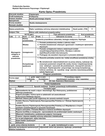 Politechnika Opolska Wydział Wychowania Fizycznego i Fizjoterapii Karta Opisu Przedmiotu Kierunek studiów Profil kształcenia Poziom studiów Specjalność Forma studiów Semestr studiów Fizjoterapia Praktyczny Studia pierwszego stopnia Nazwa przedmiotu Etyka i podstawy ochrony własności intelektualnej Subject Title Całk. 2 Wymagania wstępne w zakresie przedmiotu Studia niestacjonarne I Nauki podst. (T/N) T Ethics with intellectual property policy ECTS (pkt.) Tryb zaliczenia przedmiotu Kod przedmiotu Kont. 0,4 Prakt. Zaliczenie na ocenę IF-I-10 Nazwy anatomia prawidłowa człowieka, biologia medyczna, fizjologia przedmiotów 1. Posiada podstawową wiedze z zakresu etyki. Wiedza 2. Posiada świadomość własnych ograniczeń i możliwych dylematów etycznych. 1. Posiada umiejętności doboru właściwych źródeł uzupełniających(podręczników, literatyry z zakresu Umiejętności etyki/filozofii,żródeł internetowych). 2. Posługuje się zasadami etycznymi w procesie edukacji. 1. Rozumie potrzebę uczenia się i stałej weryfikacji posiadanej wiedzy. Kompetencje społeczne 2. Ma świadomość odpowiedzialności za pracę własną, wykazuje się znacznym poziomem empatii dla osoby chorej i niepełnosprawnej oraz należnym szacunek dla przełożonych, nauczycieli zawodu i starszych fizjoterapeutów przyczniając się swoją kompetencją, kulturą i postawą do wysokiej rangi szeroko rozumianej polskiej szkoły fizjoterapii. Program przedmiotu Forma zajęć Wykład L. godz. zajęć w sem. Prowadzący zajęcia Całkowita Kontaktowa (tytuł/stopień naukowy, imię i nazwisko) 57 12 Dr hab. Kazimiera Waśniowska | Treści kształcenia Wykład 3. Sposób realizacji wykład, prezentacja multimedialna Tematyka zajęć Wprowadzenie do nauki o etyce i deontologii. Rys Historyczny, podstawowe definicje przedmiotu. Pojęcia początku i końca zycia w zależnośći od uwarunkowań kulturowych.Refleksja etyczna Wartość własna jako punkt wyjściowy do uznania wartośći innych 1 4. Kodeks Etyczny Fizjoterapeuty Rzeczypospolitej Polskiej cz.1 Relacje fizjoterapeuta - pacjent Kodeks Etyczny Fizjoterapeuty Rzeczypospolitej Polskiej cz.2 Współpraca z innymi osobami uczestniczącymi w procesie leczniczym Pojęcie autorytetu. Potrzeba Mistrza w świecie konfliktów etycznych 1 Etyczne konflikty w medycynie - wprowadzenie do problematyki badań naukowych 1 Własność intelektualna, podstawowe pojęcia i koncepcje Prawne i etyczne aspekty ochrony własności intelektualnej Co to jest plagiaryzm, etyka internetu Etyka badań naukowych Zaliczenie 1 1 1 1 1 Lp. 1. 2. 5. 6. 7. 8. 9. 10. 11. 12. L. godz. pracy własnej studenta 45 L. godz. kontaktowych w sem. Sposoby sprawdzenia zamierzonych odpowiedź ustna lub pisemna, dyskusje, prezentacje efektów kształcenia Liczba godzin 1 1 1 1 12 Wiedza Efekty kształcenia dla przedmiotu - po zakończonym cyklu kształcenia Umiejętności Kompetencje społeczne 1. KF_W20 zna obowiązujące normy społeczne w kontakcie z drugim człoweiekiem 2. KF_W26 zna podstawowe zasady z zakresu ochrony prawa i prawa własności autorskiego 1. KF_U07 potrafi rozpoznać i zinterpretować podstawowe problemy psychologiczne i natury etycznej 1. KF_K03 przestrzega właściwych relacji z pacjentem, jego rodziną, najbliższym otoczeniem oraz społeczeństwem 2. KF_K04 okazuje szacunek i tolerancję wobec pacjenta oraz dba o jego dobro Metody dydaktyczne: wykład, prezentacja przygotowana w systemie Power Point, dyskusja, konsultacje Forma i warunki zaliczenia przedmiotu: Pozytywna ocena z kolokwium (uzyskanie co najmniej 50% punktów), obecnośc na wykladach i udział w dyskusji lub przygotowanie prezentacji może mieć wpływ na podniesenie oceny końcowej z przedmiotu. Literatura podstawowa: [1] M.Środa „Etyka dla myślących” Wydawnictwo Czarna Owca, Warszawa 2010 [2] J. Tischner „ Jak żyć” Wydawnictwo TUM Wrocław, 2000 [3] Vardy Grosch „Etyka” Wydawnictwo Zysk i Sk-a, Poznań 2010 [4] K. Wojtyła „Elementarz Etyczny” Wydawnictwo TUM,Wrocław 1988 [5] H.P. Dunn "Etyka dla lekarzy, pielęgniarek i pacjentów" Wydawnictwo Biblos, Tarnów 1997. [6] T. Ślipko Spacerem po etyce Wydawnictwo Petrus 2010 [7] Kodeks Etyczny Fizjoterapeuty 2009 [8] Kodeks Etyki Studenta Politechniki Opolskiej 2011 Literatura uzupełniająca: [1] W.J. Bober Powinność w świecie cyfrowym. Etyka komputerowa w świetle współczesnej filozofii [2] J.Gaarder Świat Zofii Wydawnictwo Czarna Owca,Warszawa 2007 [3] Jan Paweł II Evangelium Vitae Wydawnictwo TUM, Wrocław 1995 [4] artykuly w czasopismach naukowych [5] Bioetyka. Wprowadzenie dla studentów nauk biologicznych. B. Mepham PWN 2008 [6] Jan Paweł II Redemptor Hominis Wydawnictwo Znak, Kraków 1977 [7] artykuly naukowe w internecie ______________ * niewłaściwe przekreślić ………………………………………………….. ………………………………………………………. (kierownik jednostki organizacyjnej/bezpośredni przełożony: pieczęć/podpis (Dziekan Wydziału pieczęć/podpis)