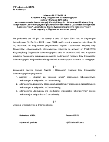 V Posiedzenie KRDL IV Kadencja Uchwała Nr 57/IV/2016 Krajowej Rady Diagnostów Laboratoryjnych z dnia 19 lutego 2016 roku w sprawie zatwierdzenia decyzji Komisji Nagród i Odznaczeń Krajowej Izby Diagnostów Laboratoryjnych o przyznaniu odznaczenia „Zasłużony Diagnosta Laboratoryjny", „Zasłużony dla medycznej diagnostyki laboratoryjnej", oraz nagrody - „Dyplom za wzorową pracę" Na podstawie art. 47 pkt 12) ustawy z dnia 27 lipca 2001 roku o diagnostyce laboratoryjnej (tj.: Dz. U. z 2014 r., poz. 1384 z późn. zm.), w związku z pkt. 6 ust. 3) i 4) Rozdziału VI Regulaminu przyznawania nagród i odznaczeń Krajowej Izby Diagnostów Laboratoryjnych, stanowiącego załącznik do uchwały nr 113/III/2013 Krajowej Rady Diagnostów Laboratoryjnych z dnia 14 września 2013 roku w sprawie przyjęcia Regulaminu przyznawania nagród i odznaczeń Krajowej Izby Diagnostów Laboratoryjnych, Krajowa Rada Diagnostów Laboratoryjnych uchwala, co następuje: §1 Zatwierdzić decyzję Komisji Nagród i Odznaczeń Krajowej Izby Diagnostów Laboratoryjnych o przyznaniu: 1. nagrody – „Dyplom za wzorową pracę” diagnostom laboratoryjnym, wskazanym w załączniku nr 1 do uchwały; 2. odznaczenia „Zasłużony Diagnosta Laboratoryjny" diagnostom laboratoryjnym wskazanym w załączniku nr 2 do uchwały; 3. odznaczenia „Zasłużony dla medycznej diagnostyki laboratoryjnej" osobie wskazanej w załączniku nr 3 do uchwały; §2 Uchwała wchodzi życie z dniem podjęcia. Sekretarz KRDL Prezes KRDL (-) Anna Lipnicka (-) Elżbieta Puacz 1 Załącznik nr 1 do uchwały: Dyplom „Za wzorową pracę”: 1. Białecka Anna Katarzyna 2. Błaszczyk Grażyna Małgorzata 3. Jakubowicz Bernadetta Katarzyna 4. Lipka Małgorzata 5. Madej Teresa Janina 6. Pacyna Anna Magdalena 7. Pasowska Krystyna Barbara 8. Patora Danuta 9. Raczyńska Danuta Bronisława 10. Siemieniako Małgorzata 11. Wajda Robert 12. Wojtasik Jadwiga 13. Zawiasa Jolanta Anna 1 Załącznik nr 2 do uchwały: „Zasłużony Diagnosta Laboratoryjny”: 1. Aulich-Kucal Barbara 2. Baranowska Dorota 3. Bryndza Małgorzata Elżbieta 4. Chrzanowska Teresa Zuzanna 5. Chrząstek Barbara Maria 6. Dołęgowska Barbara Bożena 7. Dorman Małgorzata 8. Fischer Katarzyna Maria 9. Gąsiorek Józefa Danuta 10. Golec Krzysztof Jerzy 11. Gospodarek-Komkowska Eugenia 12. Grześko Ewa Danuta 13. Grzyb Krystyna 14. Jarocka Katarzyna 15. Jastrzębska Maria 16. Kozłowska Sylwia Małgorzata 17. Krasoń Lesław Józef 18. Lewczyk Ewa Olga 19. Majda Jacek Artur 20. Majsnerowicz Marek Bogusław 21. Mozdyniewicz Maksymilian 22. Myk Zdzisława 23. Olkowicz Iwona 24. Ostrasz Halina Franciszka 25. Rucińska Jadwiga 26. Sajewicz Lilianna 27. Seroka Agata Barbara 28. Sękowska Alicja Magdalena 29. Smolińska Dorota Urszula 1 30. Szwajkowska-Chwalisz Ewa Maria 31. Wais Anna Elżbieta 32. Warzyńska-Kuncio Renata Maria 33. Wawrzyniak Jolanta 34. Wendycz-Domalewska Danuta 35. Wieczarek Wiesława 36. Wnuk Arkadiusz Wiktor 37. Wudkowska Anna Agnieszka 38. Zaródzka Zofia Grażyna 39. Zubowicz Iwona 40. Zubowicz Krzysztof 41. Żabczyńska Joanna 1 Załącznik nr 3 do uchwały: „Zasłużony dla medycznej diagnostyki laboratoryjnej”: 1. Bąbiewska-Rzepka Krystyna 2. Paluszkiewicz Piotr 3. Potracka Ewa 4. Prus Danuta Bogusława 1 1