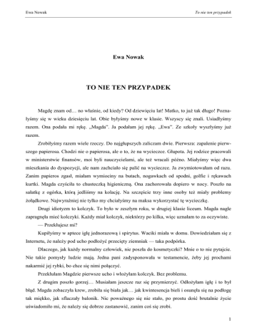 Ewa Nowak To nie ten przypadek Ewa Nowak TO NIE TEN PRZYPADEK Magdę znam od… no właśnie, od kiedy? Od dziewięciu lat! Matko, to już tak długo! Poznałyśmy się w wieku dziesięciu lat. Obie byłyśmy nowe w klasie. Wszyscy się znali. Usiadłyśmy razem. Ona podała mi rękę. „Magda”. Ja podałam jej rękę. „Ewa”. Ze szkoły wyszłyśmy już razem. Zrobiłyśmy razem wiele rzeczy. Do najgłupszych zaliczam dwie. Pierwsza: zapalenie pierwszego papierosa. Chodzi nie o papierosa, ale o to, że na wycieczce. Głupota. Jej rodzice pracowali w ministerstwie finansów, moi byli nauczycielami, ale też wracali późno. Miałyśmy więc dwa mieszkania do dyspozycji, ale nam zachciało się palić na wycieczce. Ja zwymiotowałam od razu. Zanim papieros zgasł, miałam wymiociny na butach, nogawkach od spodni, golfie i rękawach kurtki. Magda czyściła to chusteczką higieniczną. Ona zachorowała dopiero w nocy. Poszło na sałatkę z ogórka, którą jedliśmy na kolację. Na szczęście trzy inne osoby też miały problemy żołądkowe. Najwyraźniej nie tylko my chciałyśmy na maksa wykorzystać tę wycieczkę. Drugi idiotyzm to kolczyk. To było w zeszłym roku, w drugiej klasie liceum. Magda nagle zapragnęła mieć kolczyki. Każdy miał kolczyk, niektórzy po kilka, więc uznałam to za oczywiste. — Przekłujesz mi? Kupiłyśmy w aptece igłę jednorazową i spirytus. Waciki miała w domu. Dowiedziałam się z Internetu, że należy pod ucho podłożyć przecięty ziemniak — taka podpórka. Dlaczego, jak każdy normalny człowiek, nie poszła do kosmetyczki? Mnie o to nie pytajcie. Nie takie pomysły ludzie mają. Jedna pani zadysponowała w testamencie, żeby jej prochami nakarmić jej rybki, bo chce się nimi połączyć. Przekłułam Magdzie pierwsze ucho i włożyłam kolczyk. Bez problemu. Z drugim poszło gorzej… Musiałam jeszcze raz się przymierzyć. Odłożyłam igłę i to był błąd. Magda zobaczyła krew, zrobiła się biała jak… jak kwintesencja bieli i osunęła się na podłogę tak miękko, jak sflaczały balonik. Nic poważnego się nie stało, po prostu dość brutalnie życie uświadomiło mi, że należy się dobrze zastanowić, zanim coś się zrobi. 1 Ewa Nowak To nie ten przypadek Potem Magda poznała Krzyśka. Właściwie obie go poznałyśmy — nad Jeziorem Rajgrodzkim, gdzie rodzice Magdy mieli domek. Mocowałyśmy się z jakimś kajakiem na stojaku. Podszedł Krzysiek. Pomóc? Jasne! Był mniej więcej w naszym wieku, jego rodzice też mieli tam domek. Wróciliśmy do Warszawy, zaczął się rok szkolny, a oni zaczęli ze sobą chodzić. Też miałam chłopaka, więc ucieszyłam się, bo symetria jest w przyrodzie pożądana. Czwartego lutego Magda przysyła wiadomość: „Spotkaj mnie, błagam!”. Mam do końca pół zadania z chemii, ale wstaję. Chemia nie zając, a Magda to Magda. Jadę do niej. Trzy przystanki ode mnie. Mamy fart, że tak blisko. Otwiera mi drzwi zapłakana. Rzuca mi się na szyję. Szlocha. Przytulam ją. Jest mi jej żal. Co się stało? Mieli iść do kina na Autora widmo. Umówili się. Jeszcze wczoraj potwierdził. Kazał jej kupić bilety, bo ona niby ma bliżej. Nie chciałam nic mówić, ale to jakieś chore — ona lata po bilety, ona kupuje mu podręczniki, ona… Rano wysłał esemesa, żeby kupiła na jedenastą. Magdzie to nie pasuje i on o tym wie, bo mu mówiła tysiąc milionów razy, że od września chodzi na włoski. Ale on chce wcześniej… O dziesiątej zadzwonił i powiedział, że nie może iść, bo przyjechała do nich babcia i matka by mu tego nie darowała. — Zostałam jak ta głupia z dwoma biletami, a on nawet nie zapytał, czy je oddam, czy z kimś pójdę. — I co? — Najbardziej jestem ciekawa, dlaczego do mnie nie zadzwoniła i nie poszła ze mną. — Nie byłam w stanie iść, ale powiedziałam już mamie, że idziemy z Krzyśkiem, więc głupio mi było wrócić. A więc jednak poszła z kimś innym. Słucham. — Nie byłam w stanie iść do kina. Polazłam do kasy i oddałam. Nie było problemu, ale w kolejce stały same pary i wszyscy się na mnie gapili. Uciekłam stamtąd kłusem. Poszłam do knajpy, zamówiłam herbatę i patrzę na zegarek, kiedy już mogę wracać do domu. I teraz uważaj! On wchodzi. Nie jest sam. „Z babcią!” — chciałam krzyknąć złośliwie, ale na szczęście się nie wyrwałam. — Są z nim jacyś ludzie, jakiś chłopak i dwie dziewczyny. Normalnie podwójna randka. Jestem kompletnie załamana. A ja jestem kompletnie oburzona. 2 Ewa Nowak To nie ten przypadek — Nie wiem, co robić, biję się z myślami. Udawać, że mnie tu nie ma, i zobaczyć, co mi potem powie, czy podejść i jak gdyby nigdy nic zapytać, jak tam babcia? Krzysiek mnie zauważa. Udaję, że to nie ja, kulę się, upuszczam łyżeczkę pod stół, nurkuję, a gdy się podnoszę, on gapi się prosto na mnie i robi taki gest… Magda przejeżdża dłonią po szyi. Robi to tak dramatycznie, że aż kolczyki jej drżą. — Zapłaciłam i idę do domu. Po chwili przyszedł esemes: „Potem ci wszystko wytłumaczę”. Bezczelny! Jestem… wiadomo, ale powstrzymuję się ze wszystkich sił, bo przecież wiem, że nie ma nic gorszego, niż wtrącać się między dwoje zakochanych. Oni się potem pogodzą, a tobie tego, co nagadałaś, nikt już nie zapomni. Mam absolutnie żelazną zasadę, że nie wtrącam się w skargi koleżanek na chłopaków. Po prostu jestem na takie gadki głucha. Nigdy nie daję wciągać się w bagno pod tytułem: „Jaka ja jestem przez niego nieszczęśliwa”. Tylko że tym razem to coś innego — poważna sprawa, a nie jakaś tam zwyczajna kłótnia. Magda jest tak roztrzęsiona, że muszę ją wesprzeć, a zresztą po czymś takim przecież się już nigdy nie zejdą, więc mogę szczerze powiedzieć, co sądzę o tym chamie. Nie chodzi o to, że łamię zasadę. Okoliczności są po prostu całkiem inne. To inny przypadek. Oni już
