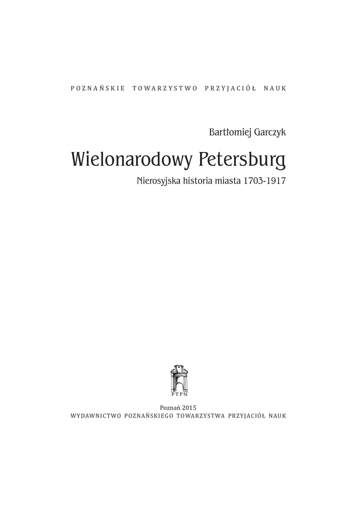 POZNAŃSKIE T O WA R Z Y S T WO PRZYJACIÓŁ NAUK Bartłomiej Garczyk Wielonarodowy Petersburg Nierosyjska historia miasta 1703-1917 Poznań 2015 WYDAWNICTWO POZNAŃSKIEGO TOWARZYSTWA PRZYJACIÓŁ NAUK SPIS TREŚCI Słowo wstępne . . . . . . . . . . . . . . . . . . . . . . . . . . . . . . . . . . . . . . . . . . . . . . . . . . . . . . . . . . . . . . . . . . . . 7 Rozdział I. Geneza polietnicznego i polikonfesjonalnego Petersburga – historia, skład etniczny, struktura wyznaniowa . . . . . . . . . . . . . . . . . . . . . . . . . . . . . . . . . . . 15 Rozdział II. Rozmieszczenie i struktura społeczno-zawodowa diaspor narodowych . . . . . . . . . . . . . . . . . . . . . . . . . . . . . . . . . . . . . . . . . . . . . . . . . . . . . . . . . . . . . . 37 Rozdział III. Narody . . . . . . . . . . . . . . . . . . . . . . . . . . . . . . . . . . . . . . . . . . . . . . . . . . . . . . . . . . . . . . 47 Tendencje w polityce narodowościowej caratu . . . . . . . . . . . . . . . . . . . . . . . . . . . . . . . . . 47 Niemcy . . . . . . . . . . . . . . . . . . . . . . . . . . . . . . . . . . . . . . . . . . . . . . . . . . . . . . . . . . . . . . . . . . . . . . . . 53 Polacy . . . . . . . . . . . . . . . . . . . . . . . . . . . . . . . . . . . . . . . . . . . . . . . . . . . . . . . . . . . . . . . . . . . . . . . . . 68 Finowie . . . . . . . . . . . . . . . . . . . . . . . . . . . . . . . . . . . . . . . . . . . . . . . . . . . . . . . . . . . . . . . . . . . . . . . 84 Żydzi . . . . . . . . . . . . . . . . . . . . . . . . . . . . . . . . . . . . . . . . . . . . . . . . . . . . . . . . . . . . . . . . . . . . . . . . . . 93 Tatarzy . . . . . . . . . . . . . . . . . . . . . . . . . . . . . . . . . . . . . . . . . . . . . . . . . . . . . . . . . . . . . . . . . . . . . . . . 104 Inne narodowości . . . . . . . . . . . . . . . . . . . . . . . . . . . . . . . . . . . . . . . . . . . . . . . . . . . . . . . . . . . . . 109 Rozdział IV. Życie religijne starego Petersburga . . . . . . . . . . . . . . . . . . . . . . . . . . . . . . . . . 119 Rola prawosławia . . . . . . . . . . . . . . . . . . . . . . . . . . . . . . . . . . . . . . . . . . . . . . . . . . . . . . . . . . . . . 119 Cmentarze . . . . . . . . . . . . . . . . . . . . . . . . . . . . . . . . . . . . . . . . . . . . . . . . . . . . . . . . . . . . . . . . . . . . 123 Protestanci . . . . . . . . . . . . . . . . . . . . . . . . . . . . . . . . . . . . . . . . . . . . . . . . . . . . . . . . . . . . . . . . . . . . 125 Katolicy . . . . . . . . . . . . . . . . . . . . . . . . . . . . . . . . . . . . . . . . . . . . . . . . . . . . . . . . . . . . . . . . . . . . . . . 134 Buddyści, muzułmanie, wyznawcy judaizmu . . . . . . . . . . . . . . . . . . . . . . . . . . . . . . . . . . . 145 Zamiast zakończenia – wielonarodowy Petersburg dziś . . . . . . . . . . . . . . . . . . . . . . . . . . 153 5 SPIS TREŚCI Wykaz wybranych pochówków przedstawicieli diaspor narodowych na cmentarzach Petersburga . . . . . . . . . . . . . . . . . . . . . . . . . . . . . . . . . . . . . . . . . . . . . . . . . . . . 163 Bibliogra ia . . . . . . . . . . . . . . . . . . . . . . . . . . . . . . . . . . . . . . . . . . . . . . . . . . . . . . . . . . . . . . . . . . . . . . . . . 171 Indeks nazwisk . . . . . . . . . . . . . . . . . . . . . . . . . . . . . . . . . . . . . . . . . . . . . . . . . . . . . . . . . . . . . . . . . . . . . 193 Резюме . . . . . . . . . . . . . . . . . . . . . . . . . . . . . . . . . . . . . . . . . . . . . . . . . . . . . . . . . . . . . . . . . . . . . . . . . . . . . 201 Summary . . . . . . . . . . . . . . . . . . . . . . . . . . . . . . . . . . . . . . . . . . . . . . . . . . . . . . . . . . . . . . . . . . . . . . . . . . . 203
