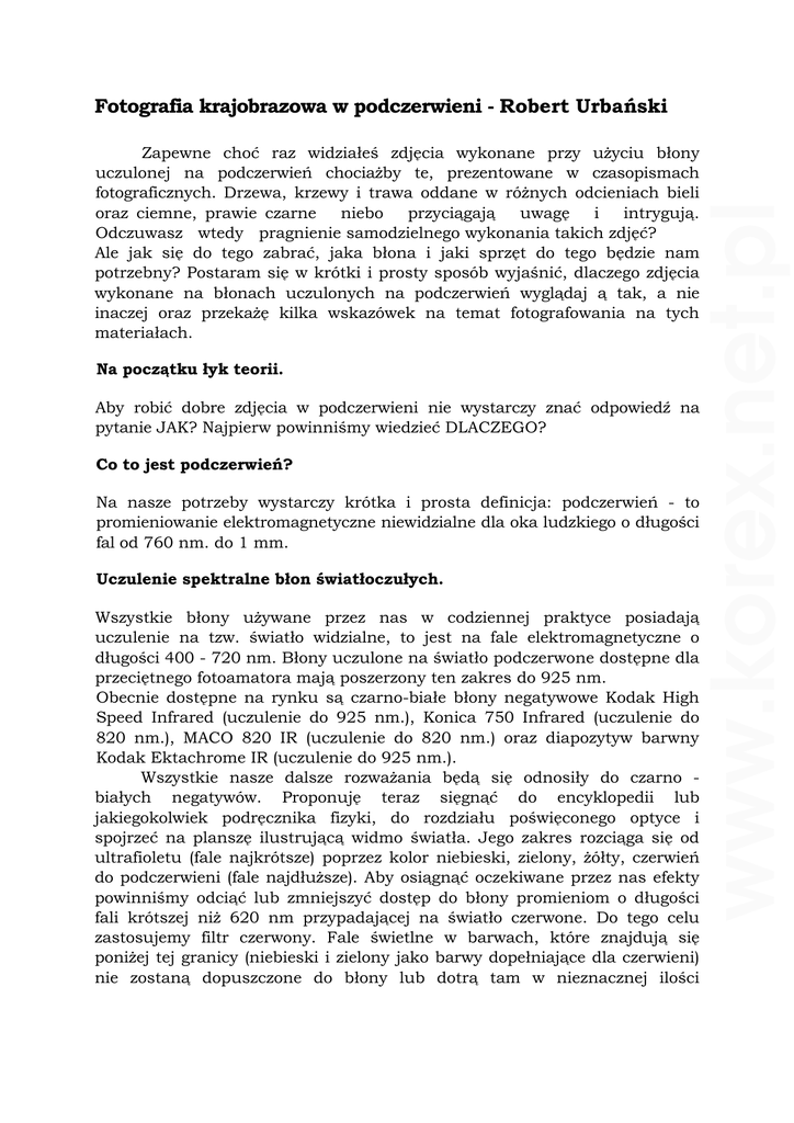Fotografia krajobrazowa w podczerwieni - Robert Urbański Na początku łyk teorii. www.korex.net.pl Zapewne choć raz widziałeś zdjęcia wykonane przy uŜyciu błony uczulonej na podczerwień chociaŜby te, prezentowane w czasopismach fotograficznych. Drzewa, krzewy i trawa oddane w róŜnych odcieniach bieli oraz ciemne, prawie czarne niebo przyciągają uwagę i intrygują. Odczuwasz wtedy pragnienie samodzielnego wykonania takich zdjęć? Ale jak się do tego zabrać, jaka błona i jaki sprzęt do tego będzie nam potrzebny? Postaram się w krótki i prosty sposób wyjaśnić, dlaczego zdjęcia wykonane na błonach uczulonych na podczerwień wyglądaj ą tak, a nie inaczej oraz przekaŜę kilka wskazówek na temat fotografowania na tych materiałach. Aby robić dobre zdjęcia w podczerwieni nie wystarczy znać odpowiedź na pytanie JAK? Najpierw powinniśmy wiedzieć DLACZEGO? Co to jest podczerwień? Na nasze potrzeby wystarczy krótka i prosta definicja: podczerwień - to promieniowanie elektromagnetyczne niewidzialne dla oka ludzkiego o długości fal od 760 nm. do 1 mm. Uczulenie spektralne błon światłoczułych. Wszystkie błony uŜywane przez nas w codziennej praktyce posiadają uczulenie na tzw. światło widzialne, to jest na fale elektromagnetyczne o długości 400 - 720 nm. Błony uczulone na światło podczerwone dostępne dla przeciętnego fotoamatora mają poszerzony ten zakres do 925 nm. Obecnie dostępne na rynku są czarno-białe błony negatywowe Kodak High Speed Infrared (uczulenie do 925 nm.), Konica 750 Infrared (uczulenie do 820 nm.), MACO 820 IR (uczulenie do 820 nm.) oraz diapozytyw barwny Kodak Ektachrome IR (uczulenie do 925 nm.). Wszystkie nasze dalsze rozwaŜania będą się odnosiły do czarno białych negatywów. Proponuję teraz sięgnąć do encyklopedii lub jakiegokolwiek podręcznika fizyki, do rozdziału poświęconego optyce i spojrzeć na planszę ilustrującą widmo światła. Jego zakres rozciąga się od ultrafioletu (fale najkrótsze) poprzez kolor niebieski, zielony, Ŝółty, czerwień do podczerwieni (fale najdłuŜsze). Aby osiągnąć oczekiwane przez nas efekty powinniśmy odciąć lub zmniejszyć dostęp do błony promieniom o długości fali krótszej niŜ 620 nm przypadającej na światło czerwone. Do tego celu zastosujemy filtr czerwony. Fale świetlne w barwach, które znajdują się poniŜej tej granicy (niebieski i zielony jako barwy dopełniające dla czerwieni) nie zostaną dopuszczone do błony lub dotrą tam w nieznacznej ilości www.korex.net.pl (promienie Ŝółte). Odpowiadające tym promieniom barwy nie zostaną zarejestrowane na błonie lub zostaną oddane na zdjęciu w bardzo ciemnej tonacji. Oto przyczyna, z powodu której otrzymujemy czarne lub prawie czarne niebo na zdjęciach (zwróćmy uwagę, Ŝe fotografując przy uŜyciu zwykłych błon czarnobiałych bez uŜycia filtrów, błękitne niebo zostaje oddane na odbitce jako białe, gdyŜ dla promieni niebieskich przypada maksymalna wartość uczulenia spektralnego). Zieleń powinna równieŜ zostać odwzorowana w bardzo ciemnej tonacji. Tak teŜ się dzieje. Jednak dotyczy to tylko zieleni "sztucznej" np. powierzchni pokrytych zieloną farbą itp.. KaŜdy, kto wykonywał zdjęcia przy uŜyciu czerwonego filtra zauwaŜył, Ŝe zieleń roślin odwzorowana jest w jasnych odcieniach szarości, a w przypadku błon do podczerwieni będzie nawet sięgać bieli. Mamy tu do czynienia ze zjawiskiem Wooda (od nazwiska jego odkrywcy). OtóŜ zielony barwnik występujący w roślinach - chlorofil pochłania prawie wszystkie składowe widma światła widzialnego, a odbija zieloną dlatego teŜ rośliny w większości przypadków są zielone. Promienie o długości fali większej niŜ 680 nm (ciemna czerwień i podczerwień) przenikają przez chlorofil i są obijane od znajdującej się głębiej warstwy gąbczastej docierając potem przez czerwony filtr do wnętrza naszego aparatu . Dlatego na zdjęciach otrzymujemy jasne rośliny, a w skrajnych przypadkach białe. Wspomniane tu zjawiska będą dawały najpełniej znać o sobie, gdy będziemy fotografować rano lub późnym popołudniem, kiedy to w oświetleniu dominuje czerwona składowa widma świetlnego. Fotografując na błonach do podczerwieni nie uzyskamy efektu perspektywy powietrznej. Zdjęcia wyglądaj ą tak, jakby były wykonane w krystalicznie czystym powietrzu. Na błonie nie zostaje zarejestrowana delikatna mgiełka (widoczna zwłaszcza na zdjęciach barwnych jako niebieska) powstająca w wyniku rozproszenia w atmosferze promieni światła o długości fali odpowiadającej niebieskiej składowej widma. Promienie niebieskie zostają bowiem zatrzymane prze filtr czerwony. Ta cecha błon do podczerwieni wykorzystywana jest w fotografii lotniczej. Jakie filtry powinniśmy zastosować? Najlepiej jeŜeli posiadamy filtry renomowanych producentów. Poza znakomitą jakością szkła dodatkowo wytwórca dołącza do filtra ulotkę z jego charakterystyką z której dowiemy się, jaka jest graniczna długość fali świetlnej, poniŜej której odcinane są "zbędne" składowe widma. Bardzo waŜne jest, aby graniczna długość tej fali nie przekraczała maksymalnej długości fali, do której sięga uczulenie naszej błony, poniewaŜ w tym przypadku nasza błona nie będzie w stanie zarejestrować Ŝadnego www.korex.net.pl obrazu (problem ten dotyczy wszystkich błon czarno- białych). JeŜeli nie znamy charakterystyki naszego filtra pozostaje nam wykonać kilka próbnych zdjęć w róŜnych rodzajach oświetlenia, wyciągnąć z tego odpowiednie wnioski, a potem kierować się własnym doświadczeniem. Aby trochę uprościć sprawę podaję w tabelce graniczne długości fal dla czerwonych filtrów Kodak Wratten. Oznaczenie filtra / Graniczna długość fali (nm) 87A 880 87B 820 87C 780 87 740 88A 720 89B 690 70 640 29 650 25 630 Filtry innych producentów oprócz własnych powinny posiadać na opakowaniu równieŜ to ozna