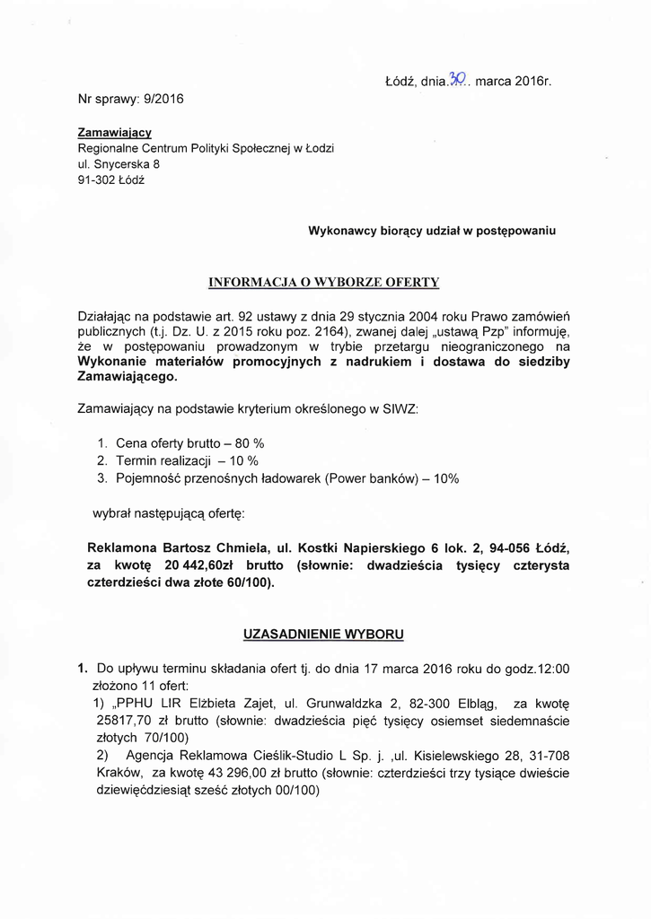 ŁodŹ, Nr sprawy 912016 dnia. ' marca 2016r. Zamawiaiącv Regionalne Centrum Polityki Społecznej w Łodzi ul. Snycerska 8 91-302 ŁÓdŹ Wykonawcy biorący udział w postępowaniu INFORMACJA O WYBORZE OFERTY Działając na podstawie ań. 92 ustawy z dnia 29 stycznia 2004 roku Prawo zamówień publicznych (t.j. Dz' U. z2015 roku poz.2164), zwanej dalej ,,ustawąPzp" informuję, Że W postępowaniu prowadzonym W trybie przetargu nieograniczonego na Wykonanie materiałów promocyjnych Zamawiającego. z nadrukiem i dostawa do siedziby Zamawiający na podstawie kryterium określonego w SlWZ: 1. Cena oferty brutto - 80 % 2. Termin realizacji - 10 % 3. Pojemnosc przenośnychładowarek (Power bankow) _ 10%o wybrał następującą ofertę: RekIamona Bartosz Chmiela, ul. Kostki Napierskiego 6 lok. 2, 94-056 ŁódŹ, za kwotę 20 442,60zł brutto (słownie: dwadzieścia tysięcy czterysta czterdzieści dwa złote 60/100). UZASADNIENIE WYBORU 1' Do upływu terminu składania oferttj. do dnia 17 marca2016 roku do godz'12''00 złoŻono 1'1 ofeń: 1) ,,PPHU LIR Elzbieta ZĄet, ul. Grunwaldzka 2,82-300 Elbląg, za kwotę 25817,70 zł brutto (słownie: dwadzieścia pięć tysięcy osiemset siedemnaście złotych 701100) 2) Agencja Reklamowa Cieślik-Studio L Sp. j. ,ul. Kisielewskiego 28, 31-708 Kraków, za kwotę 43 296,00 zł brutto (słownie: czterdzieści trzy tysiące dwieście dziewięcdziesiąt szeŚć złotych 00/1 00) 3) AW MARKET|NG Agnieszka Wolna, ul. Krokusowa 1-3, 92-101 ŁódŹ, , za kwotę 31 930,80 ż brutto (słownie: trzydziesci jeden tysięcy dziewięÓset trzydzieŚci złotych 80/1 00) 4) Reklamona Bańosz Chmiela, ul' Kostki Napierskiego 6 lok. 2,94-056 Łódż, za kwotę 20 442,60zł brutto (słownie: dwadzieścia tysięcy czterysta czterdzieści dwa złote 60/100). 5) GOMA Agencja Reklamy Mariusz Markut, ul. Ofiar Katynia 37,37-450 Stalowa Wola, za kwotę 21 549,60 zł brutto (słownie. dwadzieścia jeden tysięcy pięćset czterdzieści dziewięć złotych 60/1 00) 6) PRo-FACTUM spółka jawna, ul' Winogronowa 17, 05-831 Rozalin, za kwotę 39 330,48 zł brutto (słownie: trzydzieścidziewięć tysięcy trzysta trzydzieści złotych 481100) 7) Firma Kulik Sp. j. ,ul. Wrocławska 9, 55-100 Trzebnica,za kwotę 45254,00 zł (słownie: czterdzieści pięć tysięcy dwieściepięćdziesiątcztery złote 16/100). 8) Fundacja ,,lnstytut Społecznej odpowiedzialności organizacji'' ul. Dworcowa '18-8, 10-436 olsztyn, za kwotę 33471,36 zł (słownie: trzydzieści trzy tysiące czterysta siedemdziesiąt jeden złotych 36/100). 9) Agencja Reklamy Eureka Plus B. Fedorowicz, R. Fedorowicz, ul. 3 Maja 11110, 35-030 Rzeszów' za kwotę 25 131,36 zł (słownie: dwadzieścia pięć tysięcy sto trzydziesci jeden złotych 36/1 00). c' Jakubowski, E. Miszczak, ul. Boj.Getta Warszawskiego 16, 91-438 Łódż, za kwotę 32176,80 zł (słownie'' trzydzieści dwa tysiące sto siedemdziesiąt sześćzłotych 80/100). 11) XD GIFTS, ul. Bratnia 1, 60-185 Skórzewo, za kwotę 35 560,76 zł (słownie: 10) Consorts B. Golańska, trzydzieści pięć tysięcy pięćset sześćdziesiątzłotych 761100). 2. W postępowaniu odrzucono następującą ofertę: 1) GOMA Agencja Reklamy Mariusz Markut, ul. Ofiar Katynia 37,37-450 Stalowa Wola na podstawie art' 89 ust. 1 pkt. 4. Zamawiający wysłałdo Wykonawcy wezwanie do złoŻenia wyjaśnień skierowane na podstawie ań. 90 ust. 1 ustawy Pzp w celu wyjaśnieniaczy oferta zawiera rażąco niską cenę W stosunku do przedmiotu zamówienia. W zakreŚlonym terminie Wykonawca nie udzielił odpowiedzi na wezwanie do złoŻenia wyjaśnień . W związku z powyŻszym ofeńa podlega odrzuceniu na podstawie ań.89 ust. 1 pkt' 4 poniewaŻ zawiera raŻąco niską cenę W stosunku do przedmiotu zamowienia, a takŻe na podstawie art. 90 ust. 3 Zamawiający odrzuca ofeńę wykonawcy, ktory nie złoŻyłwyjasnień lub jeŻeli dokonana ocena wyjaśnień wrazz dostarczonymi dowodami potwierdza, Że ofeńa zawiera raŻąco niską cenę W stosunku do przedmiotu zamowienia. 3. Wybór najkorzystniejszej oferty: Nr ofeńy I Nazwa wykonawcy (imię i nazwisko Wykonawcy) PPHU LIR Elzbieta ZĄet, ul. Grunwaldzka 82-300 Elbląg 2 Cena Agencja Reklamowa Cieślik-Studio L sp Kryteriu m:cena ofeńy brutto Kryterium :Termin realizacji Kryterium: Razem Pojemnośó liczba przenośnyc punktó w h ładowarek 0 pkt. 0 pkt. 63,34 25817,70 zł 63,34 pkt. 43 296,00 zł 37,77 pkt. 31 930,80 zł 51,22 pkt. 10 pkt. 0 pkt. 61,22 pkt. 20 442,602 ł 80,00 pkt. 0 pkt. 0 pkt 80,00 Miejs ce llt pkt. 10 pkt. 0 pkt. 47,77 tx pkt. j. ul. Kisielewskiego 28 31-708 Krakow 3 AW MARKETING Agnieszka Wolna ul. Krokusowa 1-3 IV 92-101 ŁÓdż 4 Reklamona Bartosz Chmiela, ul. Kostki Napierskiego 6 lok.2 94-056ŁódŹ pkt. I PRO-FACTUM 6 spółka jawna ul. Winogronowa vil 39 330,48 zł 41,58 pkt. 45 254,00 zł 36,14 pkt. 5 pkt. 0 pkt. 41,14 pkt. x 33 471,36 48,47 pkt. 5 pkt. 0 pkt. 53,47 pkt. vilt 65,07 pkt. 0 pkt. 65,07 5 pkt. 10 pkt. 56,58 pkt. 17 05-831 Rozalin 7 8 9 10 11 Firma Kulik Sp. j. ul. Wrocławska 9 55-100 Trzebnica Fundacja ,,lnstytut Społecznej odpowiedzialności Organizacji" ul. Dworcowa 18-8 10-436 Olsztyn Agencja Reklamy Eureka Plus B. Fedorowicz, R. Fedorowicz, ul. 3 Maja 11110 35-030 Rzeszów Consorts B. Golańska, C. Jakubowski, E. Miszczak ul. Boj. Getta Warszawskiego '16 91-438 ŁódŹ XD GIFTS ul. Bratnia 1 60-185 Skorzewo zł 25 zł 131 ,36 0 pkt. !! pkt. 32176,80 zł 50,83 pkt. 35 560,76 zł 45,99 pkt. 10 pkt. 0 pkt. 60,83 VI pkt. 5 pkt. 10 pkt. 60,99 pkt. V Z powyŻszego rankingu wynika, iŻ najkorzystniejsza oferta została złoŻona przez Reklamona Bańosz Chmiela, ul. Kostki Napierskiego 6 lok. 2,94-056 ŁódŹ. oferta spełnia warunki S|WZ i jest zgodna z ustawą Prawo zamowień publicznych. Cena oferty mieściSię W kwocie jaką Zamawiający moŻe przeznaczyć na sfinansowanie zamówienia. W ocenie dokonanej na podstawie kryterium określonego w S|WZ oferta uzyskała 80,00 punktow. 4. Zgodnie z