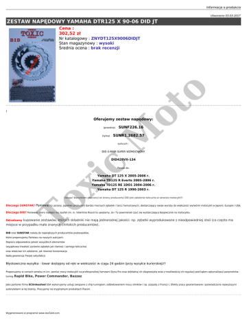 Informacje o produkcie Utworzono 03-03-2017 ZESTAW NAPĘDOWY YAMAHA DTR125 X 90-06 DID JT Cena : 302,52 zł ot o Nr katalogowy : ZNYDT125X9006DIDJT Stan magazynowy : wysoki Średnia ocena : brak recenzji ! Oferujemy zestaw napędowy: SUNF226.16 M (przednia) (tylna) SUNR1.2682.57 Łańcuch : DID X-RINR SUPER WZMOCNIONY c DID428VX-134 Pasuje do: xi Yamaha DT 125 X 2005-2006 r. Yamaha TD125 R Everts 2005-2006 r. Yamaha TD125 RE 1DO1 2004-2006 r. Yamaha DT 125 R 1990-2003 r. To Uwaga! Warunkiem gwarancji ze strony producenta DID jest założenie łańcucha w serwisie motocykli!! Dlaczego SUNSTAR? Ponieważ to uznany, japoński producent bardzo mocnych zębatek i tarcz hamulcowych, dostarczający swoje wyroby do większości wytwórni motocykli w Japonii, Europie i USA. Dlaczego DID? Ponieważ skoro najlepsi mu zaufali (m. in. Valentino Rossi) to uważamy, że i Ty powinieneś czuć się wystarczająco bezpiecznie na motocyklu. Odradzamy kupowanie zestawów, których składniki nie mają jednorodnej jakości: np. zębatki wyprodukowane z nieodpowiedniej stali (co często ma miejsce w przypadku mało znanych chińskich producentów). DID oraz SUNSTAR należą do największych producentów podzespołów, które proponujemy Państwu na naszych aukcjach. Dopiero odpowiednia jakość wszystkich elementów (wyjątkowa trwałość zarówno zębatek jak również i samego łańcucha) oraz właściwe ich założenie, jak również konserwacja będą gwarancją Twojej satysfakcji. Błyskawiczna wysyłka - towar dostępny od ręki w wiekszości w ciagu 24 godzin (przy wysyłce kurierskiej)!! Proponujemy w ramach serwisu m.inn. pomiar mocy motocykli na profesjonalnej hamowni Dyna Pro oraz dokładną ich diagnostykę wraz z możliwością ich regulacji pod kątem optymalizacji parametrów tuning Rapid Bike, Power Commander, Bazzaz. Jako partener firmy ECUnleashed USA wykonujemy usługi związane z chip tuningiem, odblokowaniem mocy silników ( np. pojazdy z Francji ). Efekty pracy gwarantowane i poświadczone najwyższymi autorytetami w tej branży. Pracujemy na oryginalnym produktach Piasini. Wygenerowano w programie www.oscGold.com