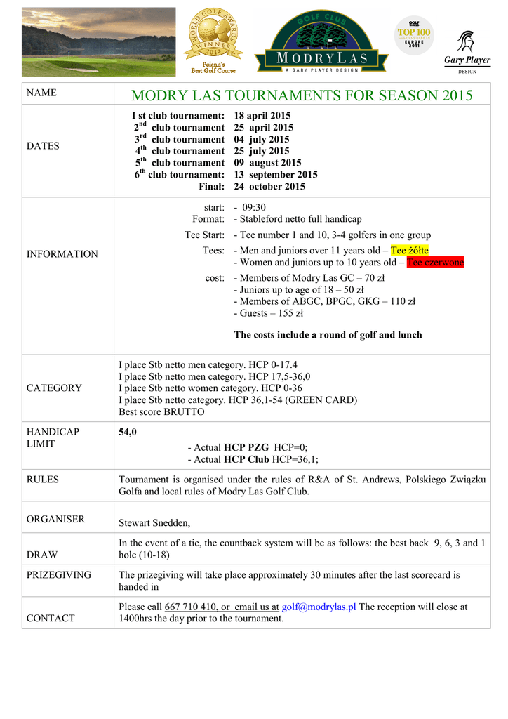 NAME MODRY LAS TOURNAMENTS FOR SEASON 2015 DATES I st club tournament: 2nd club tournament 3rd club tournament 4th club tournament 5th club tournament 6th club tournament: Finał: 18 april 2015 25 april 2015 04 july 2015 25 july 2015 09 august 2015 13 september 2015 24 october 2015 start: - 09:30 Format: - Stableford netto full handicap Tee Start: - Tee number 1 and 10, 3-4 golfers in one group Tees: - Men and juniors over 11 years old – Tee żółte - Women and juniors up to 10 years old – Tee czerwone INFORMATION cost: - Members of Modry Las GC – 70 zł - Juniors up to age of 18 – 50 zł - Members of ABGC, BPGC, GKG – 110 zł - Guests – 155 zł The costs include a round of golf and lunch CATEGORY I place Stb netto men category. HCP 0-17.4 I place Stb netto men category. HCP 17,5-36,0 I place Stb netto women category. HCP 0-36 I place Stb netto category. HCP 36,1-54 (GREEN CARD) Best score BRUTTO HANDICAP LIMIT 54,0 RULES Tournament is organised under the rules of R&A of St. Andrews, Polskiego Związku Golfa and local rules of Modry Las Golf Club. ORGANISER Stewart Snedden, DRAW In the event of a tie, the countback system will be as follows: the best back 9, 6, 3 and 1 hole (10-18) PRIZEGIVING CONTACT - Actual HCP PZG HCP=0; - Actual HCP Club HCP=36,1; The prizegiving will take place approximately 30 minutes after the last scorecard is handed in Please call 667 710 410, or email us at [email protected] The reception will close at 1400hrs the day prior to the tournament.