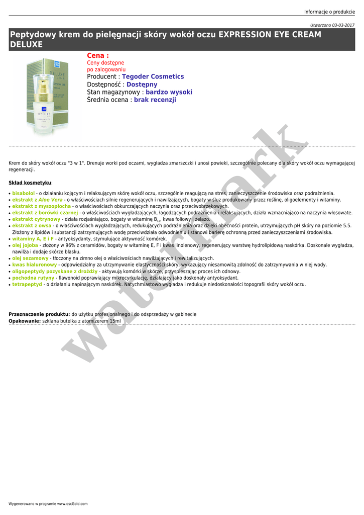 Informacje o produkcie Utworzono 03-03-2017 Peptydowy krem do pielęgnacji skóry wokół oczu EXPRESSION EYE CREAM DELUXE Cena : Ceny dostępne po zalogowaniu er m ar k Producent : Tegoder Cosmetics Dostępność : Dostępny Stan magazynowy : bardzo wysoki Średnia ocena : brak recenzji Krem do skóry wokół oczu "3 w 1". Drenuje worki pod oczami, wygładza zmarszczki i unosi powieki, szczególnie polecany dla skóry wokół oczu wymagającej regeneracji. Skład kosmetyku: ● ● ● ● ● ● ● ● ● ● ● ● at ● bisabolol - o działaniu kojącym i relaksującym skórę wokół oczu, szczególnie reagującą na stres, zanieczyszczenie środowiska oraz podrażnienia. ekstrakt z Aloe Vera - o właściwościach silnie regenerujących i nawilżających, bogaty w śluz produkowany przez roślinę, oligoelementy i witaminy. ekstrakt z myszopłocha - o właściwościach obkurczających naczynia oraz przeciwobrzękowych. ekstrakt z borówki czarnej - o właściwościach wygładzających, łagodzących podrażnienia i relaksujących, działa wzmacniająco na naczynia włosowate. ekstrakt cytrynowy - działa rozjaśniająco, bogaty w witaminę B12, kwas foliowy i żelazo. ekstrakt z owsa - o właściwościach wygładzających, redukujących podrażnienia oraz dzięki obecności protein, utrzymujących pH skóry na poziomie 5.5. Złożony z lipidów i substancji zatrzymujących wodę przeciwdziała odwodnieniu i stanowi barierę ochronną przed zanieczyszczeniami środowiska. witaminy A, E i F - antyoksydanty, stymulujące aktywność komórek. olej jojoba - złożony w 96% z ceramidów, bogaty w witaminę E, F i kwas linolenowy, regenerujący warstwę hydrolipidową naskórka. Doskonale wygładza, nawilża i dodaje skórze blasku. olej sezamowy - tłoczony na zimno olej o właściwościach nawilżających i rewitalizujących. kwas hialuronowy - odpowiedzialny za utrzymywanie elastyczności skóry, wykazujący niesamowitą zdolność do zatrzymywania w niej wody. oligopeptydy pozyskane z drożdży - aktywują komórki w skórze, przyspieszając proces ich odnowy. pochodna rutyny - flawonoid poprawiający mikrocyrkulację, działający jako doskonały antyoksydant. tetrapeptyd - o działaniu napinającym naskórek. Natychmiastowo wygładza i redukuje niedoskonałości topografii skóry wokół oczu. w Przeznaczenie produktu: do użytku profesjonalnego i do odsprzedaży w gabinecie Opakowanie: szklana butelka z atomizerem 15ml Wygenerowano w programie www.oscGold.com