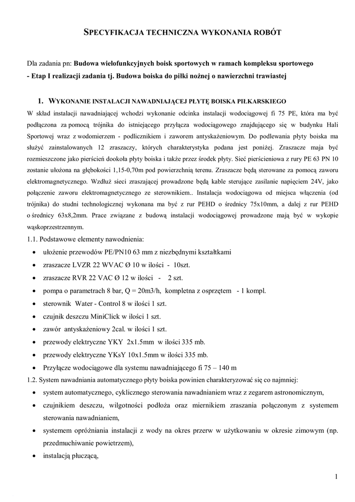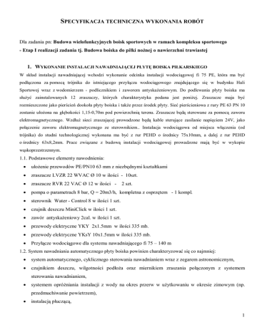 SPECYFIKACJA TECHNICZNA WYKONANIA ROBÓT Dla zadania pn: Budowa wielofunkcyjnych boisk sportowych w ramach kompleksu sportowego - Etap I realizacji zadania tj. Budowa boiska do piłki nożnej o nawierzchni trawiastej 1. WYKONANIE INSTALACJI NAWADNIAJĄCEJ PŁYTĘ BOISKA PIŁKARSKIEGO W skład instalacji nawadniającej wchodzi wykonanie odcinka instalacji wodociągowej fi 75 PE, która ma być podłączona za pomocą trójnika do istniejącego przyłącza wodociągowego znajdującego się w budynku Hali Sportowej wraz z wodomierzem - podlicznikiem i zaworem antyskażeniowym. Do podlewania płyty boiska ma służyć zainstalowanych 12 zraszaczy, których charakterystyka podana jest poniżej. Zraszacze maja być rozmieszczone jako pierścień dookoła płyty boiska i także przez środek płyty. Sieć pierścieniowa z rury PE 63 PN 10 zostanie ułożona na głębokości 1,15-0,70m pod powierzchnią terenu. Zraszacze będą sterowane za pomocą zaworu elektromagnetycznego. Wzdłuż sieci zraszającej prowadzone będą kable sterujące zasilanie napięciem 24V, jako połączenie zaworu elektromagnetycznego ze sterownikiem.. Instalacja wodociągowa od miejsca włączenia (od trójnika) do studni technologicznej wykonana ma być z rur PEHD o średnicy 75x10mm, a dalej z rur PEHD o średnicy 63x8,2mm. Prace związane z budową instalacji wodociągowej prowadzone mają być w wykopie wąskoprzestrzennym. 1.1. Podstawowe elementy nawodnienia: • ułożenie przewodów PE/PN10 63 mm z niezbędnymi kształtkami • zraszacze LVZR 22 WVAC Ø 10 w ilości - 10szt. • zraszacze RVR 22 VAC Ø 12 w ilości - • pompa o parametrach 8 bar, Q = 20m3/h, kompletna z osprzętem - 1 kompl. • sterownik Water - Control 8 w ilości 1 szt. • czujnik deszczu MiniClick w ilości 1 szt. • zawór antyskażeniowy 2cal. w ilości 1 szt. • przewody elektryczne YKY 2x1.5mm w ilości 335 mb. • przewody elektryczne YKsY 10x1.5mm w ilości 335 mb. • Przyłącze wodociągowe dla systemu nawadniającego fi 75 – 140 m 2 szt. 1.2. System nawadniania automatycznego płyty boiska powinien charakteryzować się co najmniej: • system automatycznego, cyklicznego sterowania nawadnianiem wraz z zegarem astronomicznym, • czujnikiem deszczu, wilgotności podłoża oraz miernikiem zraszania połączonym z systemem sterowania nawadnianiem, • systemem opróżniania instalacji z wody na okres przerw w użytkowaniu w okresie zimowym (np. przedmuchiwanie powietrzem), • instalacją płuczącą, 1 • oferowany system musi również umożliwiać wykonywanie prac konserwacyjnych i ewentualnej wymiany zraszacza bez konieczności demontażu nawierzchni trawiastej, 1.3. Podstawowe dane techniczne systemu: : • Zaopatrzenie w wodę. • Ciśnienie w dyszy zraszacza 5,5 bar. • Ciśnienie w źródle zasilania 7 bar. • Nawadnianie w 7 cyklach (automatycznie). • Maks. Zaopatrzenie na wodę w cyklu 20 m3/h. • Średni opad 2,5 mm/h. • Zraszacze z wbudowanymi elektrozaworami. • Zraszacze na obwodzie Q=10m3/h. • Zraszacze na środku Q=16m3/h. 1.4. System nawadniania automatycznego płyty boiska zawierać powinien również: • system automatycznego, cyklicznego sterowania nawadniania wraz z zegarem astronomicznym, • czujnik deszczu, wilgotności podłoża oraz miernik zraszania połączony z systemem sterowania nawadnianiem, • system opróżniania instalacji z wody na okres przerw w użytkowaniu w okresie zimowym (np. przedmuchiwanie powietrzem), • instalację płuczącą, • dostawę i montaż szaf sterujących wraz z elektrozaworami, • wykonanie systemu zapewniającego odpowiednie parametry wody w układzie nawadniania, • oferowany system musi umożliwiać wykonywanie prac konserwacyjnych i ewentualne wymiany zraszacza bez konieczności demontażu nawierzchni trawiastej, • wykonawca winien w ofercie określić parametry techniczne przyjętego systemu i zastosowanych materiałów, • wykonawca winien określić przewidywane zapotrzebowanie na wodę jako zużycie szczytowe w 3 litrach/minutę, średnio dobowe oraz w m /dobę, miesięczne w okresach użytkowania systemu, • należy podać wymagane ciśnienie robocze dla instalacji zasilającej system nawadniania. 2. BUDOWA PŁYTY BOISKA PIŁKARSKIEGO W BARUCHOWIE: • Pole do gry o wymiarach 61 x 104 = 6344,00 m2 Natomiast wraz z dodatkowymi przestrzeniami po za oznaczoną linią boiska: • po 2,0 m wzdłuż krótszych boków płyty boiska z każdej strony, • po 2,50 m wzdłuż bocznych pasów płyty boiska z każdej strony. Powierzchnia płyt boiska wraz z powyższymi pasami wynosi 108 x 66 m = 7128,00 m2. 2 Powierzchnia płyty boiska wraz z dodatkowymi przestrzeniami po za oznaczona linią boiska oraz dodatkowymi przestrzeniami do piłkochwytów wzdłuż krótszych boków i obrzeża określającego bieżnię wzdłuż bocznych pasów wynosi: 72,8 x 116 = 8444,80 m2. 2.1. Wykonanie płyty boiska piłkarskiego obejmuje następujące roboty: 1. Roboty pomiarowe, oraz niwelację terenu o powierzchni 10594,0 m2. 2. Mechaniczne zdjęcie ziemi urodzajnej (humusu) spycharkami na powierzchni 10594,0 m2 grub. 15 cm. 3. Składowanie zebranej ziemi - humusu. 4. Wykonanie warstwy odsączającej na powierzchni 7128 m2. 5. Rozścielenie ziemi urodzajnej na powierzchni 7128,0 m3 na uprzednio przygotowanym terenie z zachowaniem spadków. 6. Pięciokrotne zagęszczenie wykonanego podłoża walcem pierścieniowym. 7. UWAGA: Torf dostarczony zostanie przez Zamawiającego w ilości 150,00m3 o pH 5,6 - 6,5 8. Ręczne rozścielenie torfu na powierzchni 7128 m2. 9. Zakup i dostarczenie 500 m3 piasku gruboziarnistego 0,5 – 2 mm 10. Dokładne wymieszanie trzech komponentów glebowych: piasek, gleba urodzajna, torf w stosunku objętościowym 2:3:1 11. Rozłożenie przy użyciu niwelatora laserowego specjalnie przygotowanej mieszanki glebowej z zachowaniem spadku poprzecznego oraz podłużnego wynoszącego 0,5%. 12. Zagęszczenie uformowanego podłoża. 13. Ręczne wykonanie na