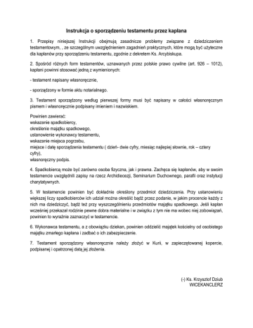 Instrukcja o sporządzeniu testamentu przez kapłana 1. Przepisy niniejszej Instrukcji obejmują zasadnicze problemy związane z dziedziczeniem testamentowym, , ze szczególnym uwzględnieniem zagadnień praktycznych, które mogą być użyteczne dla kapłanów przy sporządzeniu testamentu, zgodnie z dekretem Ks. Arcybiskupa. 2. Spośród różnych form testamentów, uznawanych przez polskie prawo cywilne (art. 926 – 1012), kapłani powinni stosować jedną z wymienionych: - testament napisany własnoręcznie, - sporządzony w formie aktu notarialnego. 3. Testament sporządzony według pierwszej formy musi być napisany w całości własnoręcznym pismem i własnoręcznie podpisany imieniem i nazwiskiem. Powinien zawierać: wskazanie spadkobiercy, określenie majątku spadkowego, ustanowienie wykonawcy testamentu, wskazanie miejsca pogrzebu, miejsce i datę sporządzenia testamentu ( dzień- dwie cyfry, miesiąc najlepiej słownie, rok – cztery cyfry), własnoręczny podpis. 4. Spadkobiercą może być zarówno osoba fizyczna, jak i prawna. Zachęca się kapłanów, aby w swoim testamencie uwzględnili zapisy na rzecz Archidiecezji, Seminarium Duchownego, parafii oraz instytucji charytatywnych. 5. W testamencie powinien być dokładnie określony przedmiot dziedziczenia. Przy ustanowieniu większej liczy spadkobierców ich udział można określić bądź przez podanie, w jakim procencie każdy z nich ma dziedziczyć, bądź też przy wyszczególnieniu przedmiotów majątku spadkowego. Jeśli kapłan wcześniej przekazał rodzinie pewne dobra materialne i w związku z tym nie ma wobec niej zobowiązań, powinien to wyraźnie zaznaczyć w testamencie. 6. Wykonawca testamentu, a z obowiązku dziekan, powinien oddzielić majątek kościelny od osobistego majątku zmarłego kapłana i zadbać o ich zabezpieczenie. 7. Testament sporządzony własnoręcznie należy złożyć w Kurii, w zapieczętowanej kopercie, podpisanej i opatrzonej datą jej złożenia. (-) Ks. Krzysztof Dziub WICEKANCLERZ Wzór testamentu kapłana W Imię Trójcy Przenajświętszej. Ja, ks. (imię i nazwisko), dziękując Bogu za dar życia i łaskę powołania do kapłaństwa oraz polecając przez wstawiennictwo NMP Matki Kościoła zbawienie moje miłosierdziu Bożemu, świadomy, że dobiega kres mego życia, z pokorą pochylam głowę przed zrządzeniami Opatrzności Bożej ( tu można zamieścić inny tekst np. zawierający podziękowania). W sposób w pełni świadomy i dobrowolny, na wypadek mojej śmierci rozporządzam, co następuje: Pogrzeb mój proszę odprawić w kościele parafialnym……………….. w ………………., a ciało moje złożyć na cmentarzu (parafialnym, komunalnym) w ……………..(miejscowość) w grobie (rodzinnym, kapłańskim, ziemnym). Pieniądze na pokrycie kosztów pogrzebu proszę pobrać z moich oszczędności. Spadkobiercą moim ustanawiam ( imię i nazwisko lub imiona i nazwiska). Wykonawcą niniejszego testamentu czynie księdza…………………………. i proszę, aby zechciał tę moją ostatnią wolę wykonać. Jak również, aby zatroszczył się o zwrot ewentualnych długów ciążących na mnie w chwili śmierci, szczególnie o zadośćuczynienie zobowiązaniom mszalnym. Wykaz moich zobowiązań znajduje się w księdze intencji mszalnych, przechowywanej w …….Gdyby to było niemożliwe, proszę Księdza Dziekana dekanatu, w którym ostatnio przebywałem o spełnienie tego zadania. Oświadczam, że naczynia i szaty liturgiczne, dzieła sztuki oraz sprzęt kościelny, które są u mnie przechowywane, a także pieniądze zdeponowane w Banku….. na rachunku……..stanowi własność parafii, w której ostatnio pracowałem. Proszę również, by z pozostawionych przez mnie pieniędzy przeznaczono odpowiednią kwotę na odprawienie za mnie Mszy św. Gregoriańskiej. Wszystkich Braci w kapłaństwie i wiernych świeckich proszę o pamięć w modlitwie. Jeśli kogoś skrzywdziłem lub obraziłem, przepraszam i proszę o darowanie mi win. ………….. (miejsce), dnia………………. (własnoręczny, czytelny podpis – imię i nazwisko)