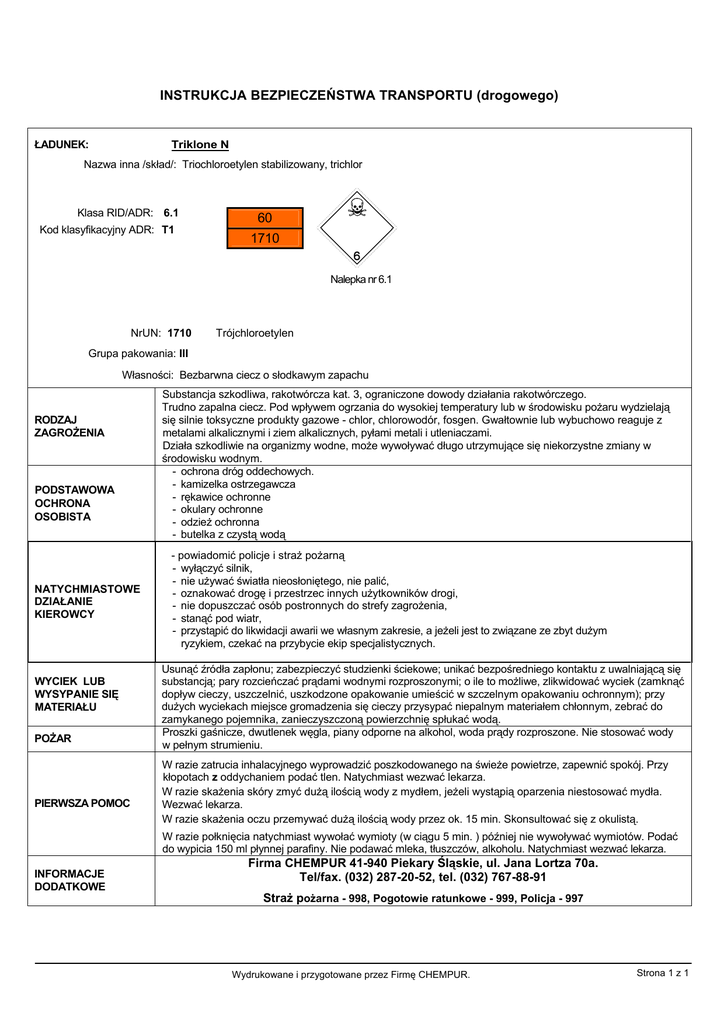 INSTRUKCJA BEZPIECZEŃSTWA TRANSPORTU (drogowego) ŁADUNEK: Triklone N Nazwa inna /skład/: Triochloroetylen stabilizowany, trichlor Klasa RID/ADR: 6.1 Kod klasyfikacyjny ADR: T1 60 1710 Nalepka nr 6.1 NrUN: 1710 Trójchloroetylen Grupa pakowania: III Własności: Bezbarwna ciecz o słodkawym zapachu RODZAJ ZAGROŻENIA PODSTAWOWA OCHRONA OSOBISTA NATYCHMIASTOWE DZIAŁANIE KIEROWCY WYCIEK LUB WYSYPANIE SIĘ MATERIAŁU POŻAR PIERWSZA POMOC Substancja szkodliwa, rakotwórcza kat. 3, ograniczone dowody działania rakotwórczego. Trudno zapalna ciecz. Pod wpływem ogrzania do wysokiej temperatury lub w środowisku pożaru wydzielają się silnie toksyczne produkty gazowe - chlor, chlorowodór, fosgen. Gwałtownie lub wybuchowo reaguje z metalami alkalicznymi i ziem alkalicznych, pyłami metali i utleniaczami. Działa szkodliwie na organizmy wodne, może wywoływać długo utrzymujące się niekorzystne zmiany w środowisku wodnym. - ochrona dróg oddechowych. - kamizelka ostrzegawcza - rękawice ochronne - okulary ochronne - odzież ochronna - butelka z czystą wodą - powiadomić policje i straż pożarną - wyłączyć silnik, - nie używać światła nieosłoniętego, nie palić, - oznakować drogę i przestrzec innych użytkowników drogi, - nie dopuszczać osób postronnych do strefy zagrożenia, - stanąć pod wiatr, - przystąpić do likwidacji awarii we własnym zakresie, a jeżeli jest to związane ze zbyt dużym ryzykiem, czekać na przybycie ekip specjalistycznych. Usunąć źródła zapłonu; zabezpieczyć studzienki ściekowe; unikać bezpośredniego kontaktu z uwalniającą się substancją; pary rozcieńczać prądami wodnymi rozproszonymi; o ile to możliwe, zlikwidować wyciek (zamknąć dopływ cieczy, uszczelnić, uszkodzone opakowanie umieścić w szczelnym opakowaniu ochronnym); przy dużych wyciekach miejsce gromadzenia się cieczy przysypać niepalnym materiałem chłonnym, zebrać do zamykanego pojemnika, zanieczyszczoną powierzchnię spłukać wodą. Proszki gaśnicze, dwutlenek węgla, piany odporne na alkohol, woda prądy rozproszone. Nie stosować wody w pełnym strumieniu. W razie zatrucia inhalacyjnego wyprowadzić poszkodowanego na świeże powietrze, zapewnić spokój. Przy kłopotach z oddychaniem podać tlen. Natychmiast wezwać lekarza. W razie skażenia skóry zmyć dużą ilością wody z mydłem, jeżeli wystąpią oparzenia niestosować mydła. Wezwać lekarza. W razie skażenia oczu przemywać dużą ilością wody przez ok. 15 min. Skonsultować się z okulistą. W razie połknięcia natychmiast wywołać wymioty (w ciągu 5 min. ) później nie wywoływać wymiotów. Podać do wypicia 150 ml płynnej parafiny. Nie podawać mleka, tłuszczów, alkoholu. Natychmiast wezwać lekarza. INFORMACJE DODATKOWE Firma CHEMPUR 41-940 Piekary Śląskie, ul. Jana Lortza 70a. Tel/fax. (032) 287-20-52, tel. (032) 767-88-91 Straż pożarna - 998, Pogotowie ratunkowe - 999, Policja - 997 Wydrukowane i przygotowane przez Firmę CHEMPUR. Strona 1 z 1