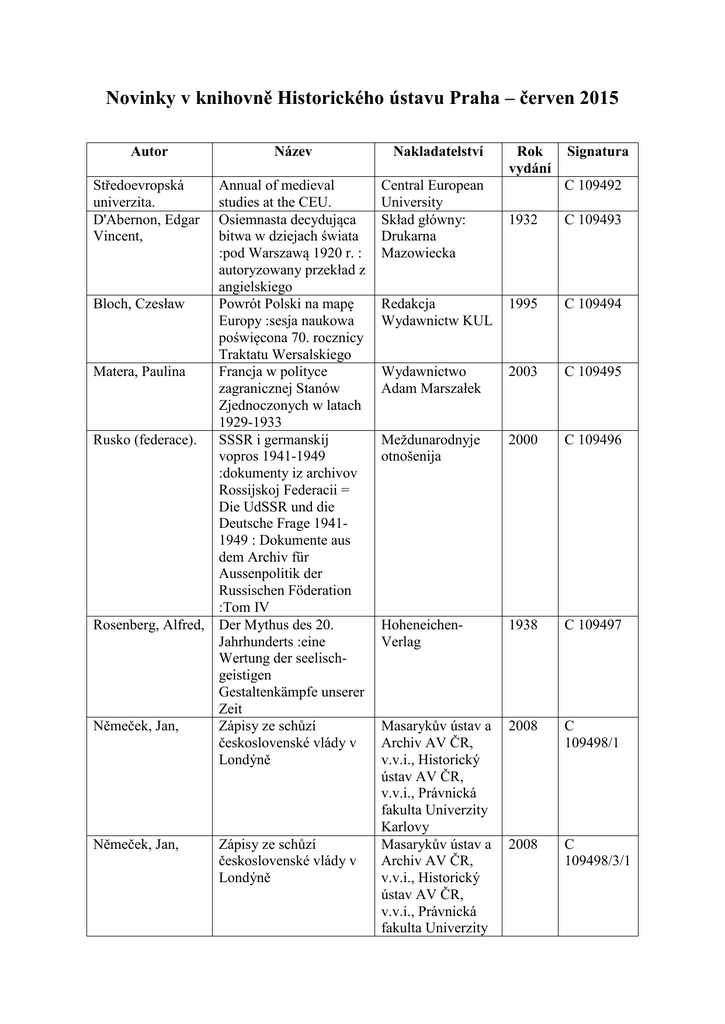 Novinky v knihovně Historického ústavu Praha – červen 2015 Autor Název Středoevropská univerzita. D'Abernon, Edgar Vincent, Annual of medieval studies at the CEU. Osiemnasta decydująca bitwa w dziejach świata :pod Warszawą 1920 r. : autoryzowany przekład z angielskiego Bloch, Czesław Powrót Polski na mapę Europy :sesja naukowa poświęcona 70. rocznicy Traktatu Wersalskiego Matera, Paulina Francja w polityce zagranicznej Stanów Zjednoczonych w latach 1929-1933 Rusko (federace). SSSR i germanskij vopros 1941-1949 :dokumenty iz archivov Rossijskoj Federacii = Die UdSSR und die Deutsche Frage 19411949 : Dokumente aus dem Archiv für Aussenpolitik der Russischen Föderation :Tom IV Rosenberg, Alfred, Der Mythus des 20. Jahrhunderts :eine Wertung der seelischgeistigen Gestaltenkämpfe unserer Zeit Němeček, Jan, Zápisy ze schůzí československé vlády v Londýně Němeček, Jan, Zápisy ze schůzí československé vlády v Londýně Nakladatelství Central European University Skład główny: Drukarna Mazowiecka Rok vydání Signatura C 109492 1932 C 109493 Redakcja Wydawnictw KUL 1995 C 109494 Wydawnictwo Adam Marszałek 2003 C 109495 Meždunarodnyje otnošenija 2000 C 109496 HoheneichenVerlag 1938 C 109497 Masarykův ústav a Archiv AV ČR, v.v.i., Historický ústav AV ČR, v.v.i., Právnická fakulta Univerzity Karlovy Masarykův ústav a Archiv AV ČR, v.v.i., Historický ústav AV ČR, v.v.i., Právnická fakulta Univerzity 2008 C 109498/1 2008 C 109498/3/1 Němeček, Jan, Zápisy ze schůzí československé vlády v Londýně Němeček, Jan, Zápisy ze schůzí československé vlády v Londýně Němeček, Jan, Zápisy ze schůzí československé vlády v Londýně Palmitessa, James R., Between Lipany and White Mountain :essays in late medieval and early modern Bohemian history in modern Czech scholarship Marginalia historica :časopis pro dějiny vzdělanosti a kultury Univerzita Karlova. Blechová-Čelebić, Lenka, Veverka, Přemysl, Mediaevalia Historica Bohemica. Acta Comeniana :Revue internationale des études comeniologiques Prameny k dějinám Židů v Čechách a na Moravě ve středověku :od počátků do roku 1347 Nelehká cesta za snem :příběh českého četníka Františka Kánského, který byl dozorcem v cikánském táboře v Letech, ale o svém životě měl úplně jiné představy Karlovy Masarykův ústav a Archiv AV ČR, v.v.i., Historický ústav AV ČR, v.v.i., Právnická fakulta Univerzity Karlovy Masarykův ústav a Archiv AV ČR, v.v.i., Historický ústav AV ČR, v.v.i., Právnická fakulta Univerzity Karlovy Masarykův ústav a Archiv AV ČR, v.v.i., Historický ústav AV ČR, v.v.i., Právnická fakulta Univerzity Karlovy Brill 2008 C 109498/3/2 2008 C 109498/4/1 2008 C 109499/4/1 2014 C 109500 Univerzita Karlova v Praze, Pedagogická fakulta, katedra dějin a didaktiky dějepisu Historický ústav AV ČR. Academia Historický ústav AV ČR, Filosofia C 109501 C 109502 C 109503 2015 C 109504 Pro památník 2014 Lidice vydalo Nakladatelství Ivan Ulrych - VEGA-L C 109506 Calabi, Donatella, Built city, designed city, virtual city, the museum of the city Gmiterek, Henryk, Materiały źródłowe do dziejów Żydów w księgach grodzkich lubelskich z doby panowania ... Materiały źródłowe do dziejów Żydów w księgach grodzkich lubelskich z doby panowania ... Materiały źródłowe do dziejów Żydów w księgach grodzkich lubelskich z doby panowania ... Materiały źródłowe do dziejów Żydów w księgach grodzkich lubelskich z doby panowania ... Urbarium neoconscriptum cum explicatione brevi, čili, Nově sepsaný řád všech trvalých povinností a rent, které plní a odvádějí dědiční poddaní slavného kláštera Broumova ve městě a okolí Deutschland Archiv :zeitschrift für Fragen der DDR und der Deutschlandpolitik Trevi :una capitale allo specchio : catalogo della mostra = a capital in the mirror : exibition catalogue : Museo di Roma in Trastevere, 10 ottobre 2014-11 gennaio 2015 S motykou a Pánem Bohem :po stopách českých evangelíků ve Vojvodině Gmiterek, Henryk, Gmiterek, Henryk, Gmiterek, Henryk, Koláčný, Jaroslav Bundeszentrale für Politische Bildung (Německo) Stemperini, Giuseppe Pavlásek, Michal Centro per lo studio di Roma, Universitá degli studi Roma Tre Wydawnictwo Uniwersytetu Marii CurieSkłodowskiej 0 C 109507 2001 C 109508/1 Wydawnictwo Uniwersytetu Marii CurieSkłodowskiej 2001 C 109508/2 Wydawnictwo Uniwersytetu Marii CurieSkłodowskiej 2001 C 109508/3 Wydawnictwo Uniwersytetu Marii CurieSkłodowskiej 2001 C 109508/4 Národní zemědělské muzeum 2014 P 209134 W. Bertelsmann Verlag. C 109509 Universitá degli studi Roma Tre, Centro per lo studio di Roma 0 E 12531 Etnologický ústav AV ČR, v. v. i., Praha - pracoviště Brno 2015 C 109521 Charmatz, Richard, Komócsin, Zoltán Österreichs innere Geschichte von 1848 bis 1907. II. Bibliotheca Strahoviensis. Nacional'nyje interesy i internacionalistskije celi / :Zoltan Komočin ; perevos s vengerskogo K. Ivanova, V. Puntusa, A. Sorokina Revue Mabillon. Nouvelle série :Revue internationale d'histoire et de littérature religieuses Proti kosmopolitismu ve výkladu našich národních dějin Huska, Miroslav Proti l'udu cestou A. klamstva Lipiński, Wojciech Bałkany na Ukrainie :Bułgarzy, Gagauzi i Albańczycy z ukraińskiego Budziaku Herder-Institut Zeitschrift für (Marburg, OstmitteleuropaNěmecko : 1994-) Forschung :neue Folge der Zeitschrift für Ostforschung Slavia Antiqua :rocznik poświęcony starożytnościom słowiańskim Eberhardt, Piotr, Migracje polityczne na ziemiach polskich (19391950) Beauvois, Daniel, Wilno - polska stolica kulturalna zaboru rosyjskiego 1803-1832 Zprávy a studie Regionálního muzea v Teplicích. Sociologický ústav Historická demografie (Akademie věd :zprávy komise pro ČR) historickou demografii při Historickém ústavu B.G. Teubner Strahovská knihovna, Královská kanonie premonstrátů na