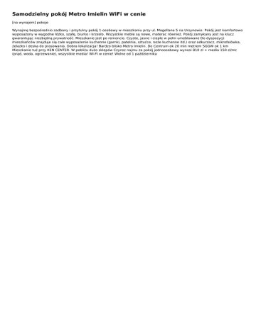 Samodzielny pokój Metro Imielin WiFi w cenie [na wynajem] pokoje Wynajmę bezpośrednio zadbany i przytulny pokój 1-osobowy w mieszkaniu przy ul. Magellana 5 na Ursynowie. Pokój jest komfortowo wyposażony w wygodne łóżko, szafę, biurko i krzesło. Wszystkie meble są nowe, materac również. Pokój zamykany jest na klucz gwarantując niezbędną prywatność. Mieszkanie jest po remoncie. Czyste, jasne i ciepłe w pełni umeblowane Do dyspozycji mieszkańców znajduje się całe wyposażenie kuchenne (garnki, patelnia, sztućce, noże kuchenne itd.) oraz odkurzacz, mikrofalówka, żelazko i deska do prasowania. Dobra lokalizacja! Bardzo blisko Metro Imielin. Do Centrum ok 20 min metrem SGGW ok 1 km Mieszkanie tuż przy KEN CENTER. W pobliżu dużo sklepów Czynsz najmu za pokój jednoosobowy wynosi 810 zł + media 150 zł/mc (prąd, woda, ogrzewanie), wszystkie media! WI-FI w cenie! Wolne od 1 października Informacje dodatkowe Rodzaj pokoje Adres ogłoszenia http://sprzedam-mieszkanie.com/samodzielny-pokoj-metro-imielin-wifi-w-cenie,o364 Kontakt Mail: Telefon: 537 555 437 Lokalizacja , Warszawa - () Ogłoszenie dodano: 2016-09-30 10:24:21 Ogłoszenie wygasa: 2016-12-30 10:24:21 Powered by TCPDF (www.tcpdf.org)