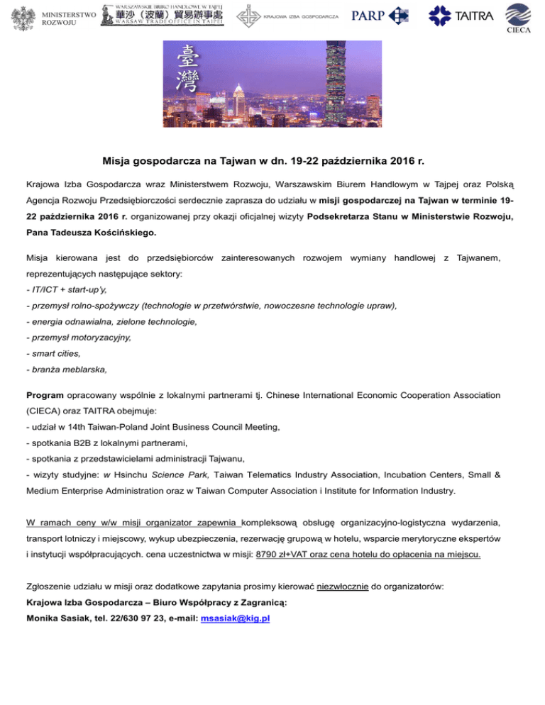 Misja gospodarcza na Tajwan w dn. 19-22 października 2016 r. Krajowa Izba Gospodarcza wraz Ministerstwem Rozwoju, Warszawskim Biurem Handlowym w Tajpej oraz Polską Agencja Rozwoju Przedsiębiorczości serdecznie zaprasza do udziału w misji gospodarczej na Tajwan w terminie 1922 października 2016 r. organizowanej przy okazji oficjalnej wizyty Podsekretarza Stanu w Ministerstwie Rozwoju, Pana Tadeusza Kościńskiego. Misja kierowana jest do przedsiębiorców zainteresowanych rozwojem wymiany handlowej z Tajwanem, reprezentujących następujące sektory: - IT/ICT + start-up’y, - przemysł rolno-spoŜywczy (technologie w przetwórstwie, nowoczesne technologie upraw), - energia odnawialna, zielone technologie, - przemysł motoryzacyjny, - smart cities, - branŜa meblarska, Program opracowany wspólnie z lokalnymi partnerami tj. Chinese International Economic Cooperation Association (CIECA) oraz TAITRA obejmuje: - udział w 14th Taiwan-Poland Joint Business Council Meeting, - spotkania B2B z lokalnymi partnerami, - spotkania z przedstawicielami administracji Tajwanu, - wizyty studyjne: w Hsinchu Science Park, Taiwan Telematics Industry Association, Incubation Centers, Small & Medium Enterprise Administration oraz w Taiwan Computer Association i Institute for Information Industry. W ramach ceny w/w misji organizator zapewnia kompleksową obsługę organizacyjno-logistyczna wydarzenia, transport lotniczy i miejscowy, wykup ubezpieczenia, rezerwację grupową w hotelu, wsparcie merytoryczne ekspertów i instytucji współpracujących. cena uczestnictwa w misji: 8790 zł+VAT oraz cena hotelu do opłacenia na miejscu. Zgłoszenie udziału w misji oraz dodatkowe zapytania prosimy kierować niezwłocznie do organizatorów: Krajowa Izba Gospodarcza – Biuro Współpracy z Zagranicą: Monika Sasiak, tel. 22/630 97 23, e-mail: [email protected]