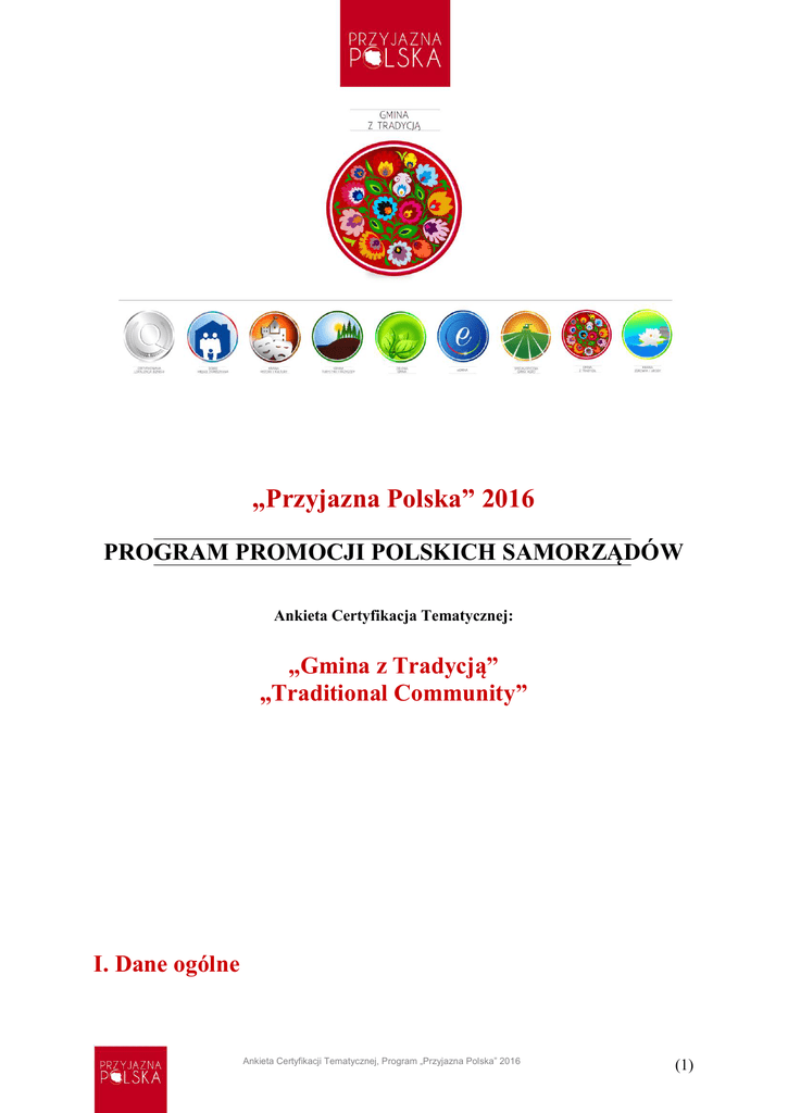 „Przyjazna Polska” 2016 PROGRAM PROMOCJI POLSKICH SAMORZĄDÓW Ankieta Certyfikacja Tematycznej: „Gmina z Tradycją” „Traditional Community” I. Dane ogólne Ankieta Certyfikacji Tematycznej, Program „Przyjazna Polska” 2016 (1) UCZESTNIK (proszę podać nazwę np. Miasto XXX, Gmina XXX, Miasto i Gmina XXX) : Gmina Radomyśl nad Sanem POWIAT: STALOWOWOLSKI WOJEWÓDZTWO: PODKARPACKIE NAZWA UCZESTNIKA DO UMIESZCZENIA NA CERTYFIKACIE (proszę podać nazwę np. Miasto XXX, Gmina XXX, Miasto i Gmina XXX)1: Gmina Radomyśl nad Sanem ADRES URZĘDU MIEJSKIEGO / URZĘDU GMINY Pełna URZĄD GMINY W RADOMYŚLU NAD SANEM (proszęnazwa podaćurzędu: adres, na który będzie kierowana korespondencja związana z programem) RYNEK DUŻY 7 Ulica i nr domu: Kod pocztowy: 37-455 Telefon (z numerem kierunkowym): 15 8454302 Miejscowość: RADOMYSL NAD SANEM Faks (z numerem kierunkowym): [email protected] e-mail: http:// Imię i nazwisko (zaznaczyć właściwe): wójta, burmistrza, prezydenta Jan Pyrkosz e-mail: Imię i nazwisko oraz stanowisko osoby do kontaktów w sprawie programu: Teresa Lachowska Telefon (z numerem kierunkowym): 15 8453607 [email protected] e-mail: II. Część merytoryczna Ankieta Certyfikacji Tematycznej, Program „Przyjazna Polska” 2016 (2) 1. Dbałość o tradycję STANDARD 1: Gmina pielęgnuje ważne tradycje narodowe1 i/lub kulturowe2 i/lub religijne. Prosimy o wskazanie działań, przedsięwzięć, rozwiązań, uchwał itp., które związane są z pielęgnowaniem ważnych tradycji na obszarze gminy. Prosimy o swobodną wypowiedź ilustrowaną dowolnymi przykładami. Gmina Radomyśl nad Sanem jest gminą, w której dbałość o tradycję jest mocno pielęgnowana. Świadectwem na to jest przekazywanie z pokolenia na pokolenie zwyczajów i obrzędów ludowych. Gmina w różnoraki sposób wspiera podstawowe działania mieszkańców związane z tradycją, historią lokalną i dziedzictwem kulturowym. Gmina nasza przywiązuję wielką wagę do wszelkiego rodzaju obchodów rocznicowych, tradycji narodowych, kulturowych i religijnych. Pielęgnowanie bogatych regionalnych tradycji oraz propagowanie wśród młodych ludzi wartości dawnej kultury – jest szczególną troską gminy, dlatego też imprezy organizowane w gminie przeznaczone są do różnych grup wiekowych. Tradycja splata się z teraźniejszością. Od wielu wielu lat, a mianowicie kiedy o telewizji mogli marzyć tylko niektórzy, nie mówiąc już o komputerze i dostępie do sieci o rozrywkę trzeba było zadbać samemu. I Tak właśnie dzieje się w naszej gminie. Chociaż masmedia otaczają nas z każdej strony nie brak czasu i chęci do organizacji imprez i spotkań kultywujących tradycje. Największą atrakcją zimowych świąt było i nadal jest chodzenie po wsiach przeróżnych kolędników. W przypadku Radomyśla są to tzw. Zapusty. Domostwa, urzędy, w tym Urząd Gminy odwiedzają corocznie barwni przebierańcy, którzy z niecierpliwością są wyczekiwani przez władze gminy, szkoły, banki. Z kolei w Chwałowicach częstowani jesteśmy pysznymi „szczodrokami”, pieczonymi przez panie z Zespołów Kulinarnych w dniu 6 stycznia, czyli Trzech Króli. Na wszelkie przejawy inicjatyw oddolnych czy też wynikających z kalendarza imprez lub rocznic państwowych wójt gminy odpowiada pozytywnie. Każdą z tych imprez wspiera finansowo i merytorycznie. Do organizacji imprez, spotkań, wystaw, występów gmina umożliwia nieodpłatny najem lokali (zarządzenie Wójta Gminy Radomyśl nad Sanem), udostępniane są także place użyteczności publicznej i tereny zielone. Władze Gminy biorą czynny udział w przygotowaniach każdej imprezy. W gminie naszej mamy wielu artystów malarzy a także lokalnych plastyków, którzy stosując różne techniki malarskie tworzą nie zapomnianą gamę różnych dzieł sztuki. 2. Uroczystości związane z tradycją 1 W tej grupie mieszczą się również tradycje regionalne i lokalne. W tej grupie mieszczą się tradycje zawodowe, produkcyjne, muzyczne, taneczne i inne związane z kultura materialną i niematerialną. 2 Ankieta Certyfikacji Tematycznej, Program „Przyjazna Polska” 2016 (3) STANDARD 2: Gmina regularnie organizuje uroczystości związane z przestrzeganiem określonej tradycji. Prosimy o opisanie uroczystości organizowanych na terenie gminy lub przy jej współudziale, które związane są z przestrzeganiem określonej tradycji. Wypowiedź można zilustrować zdjęciami. Gmina Radomyśl nad Sanem regularnie organizuje uroczystości związane z przestrzeganiem tradycji. W ciągu całego roku organizowane są tematyczne uroczystości. Począwszy od stycznia rokrocznie przygotowujemy: - „Przegląd kolęd i pastorałek” w wykonaniu chóru ,scholi, zespołu Nutka ,Grupy Emerytów i Rencistów. Przy tej okazji częstujemy ”SZCZODROKAMI”- czyli pieczonymi rogalikami z ciasta drożdżowego z makiem, -COMBER- zabawa taneczna, na której są tylko wyłącznie stowarzyszone zamężne kobiety zaproszone przez tzw.”wójtową”i „podwójtową”. Jest to zawsze ostatnia sobota karnawału,gdzie przy suto zastawianych stołach rozpoczyna się zabawa od godz.18,00 i nieprzerwanie trwa tradycyjnie 12 godzin. Na tę zabawę wpraszają się zapustnicy – czyli radomyscy przebierańcy i mają czas jednej godz aby potańczyć wraz z organizatorami. Inną tradycja,która tkwi w pokoleniach to„ZAPUSTY”.Charakteryzuje się corocznym barwnym korowodem przebierańców spacerujących po ulicach Radomyśla nad Sanem. Zawsze we wtorek przed środą popielcową. Twarze zasłaniają fantazyjne maski a dłonie długie rękawiczki. Całej paradzie towarzyszy orszak ślubny,który przechodzi na zaślubiny do UG i innych instytucji na terenie Radomyśla nad Sanem. Po odwiedzinach w instytucjach, czas na kolacje u księdza proboszcza,którego zadaniem jest rozpoznanie osób skrytych pod Ankieta Certyfikacji Tematycznej, Program „Przyjazna Polska” 2016 (4) maskami. Trad